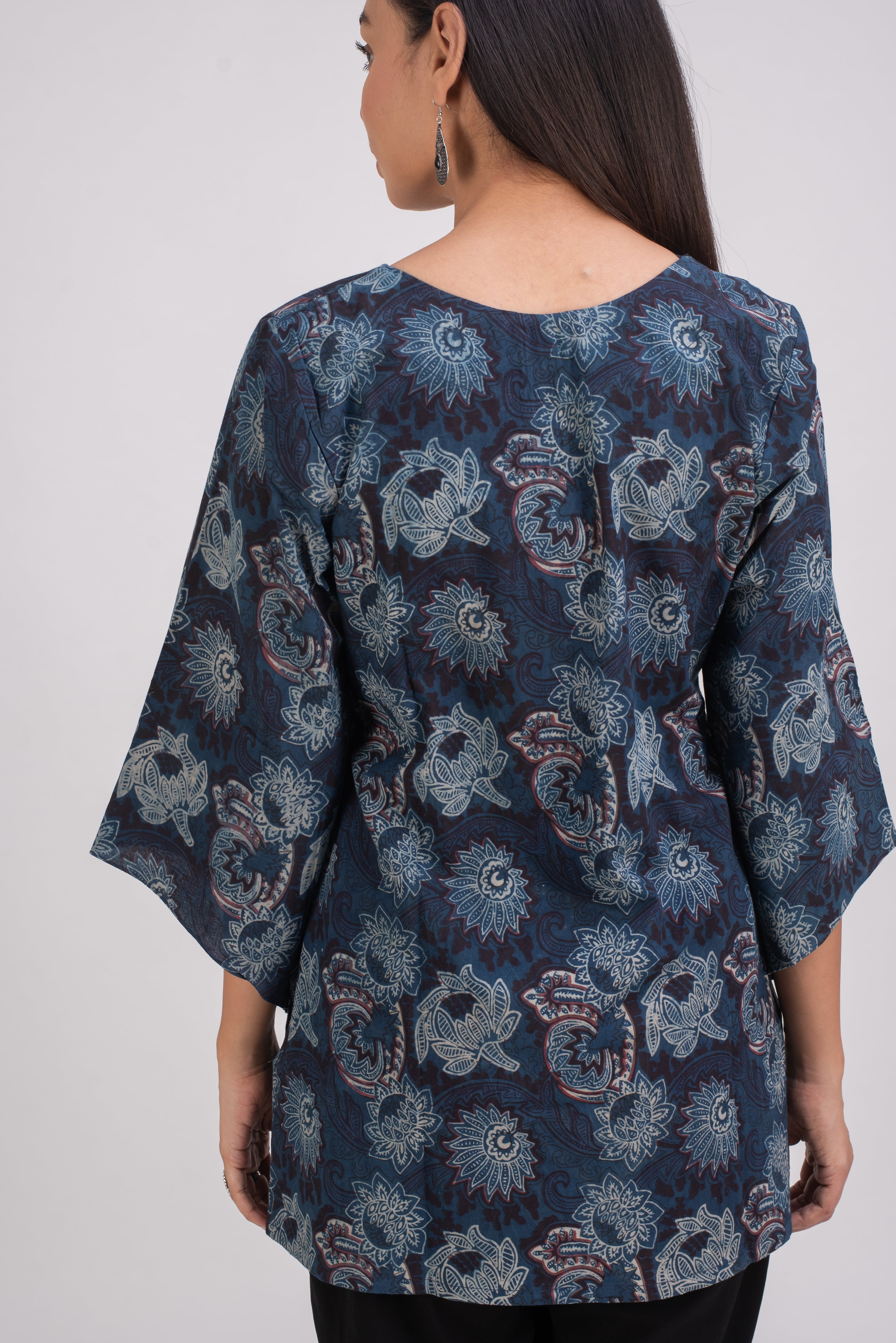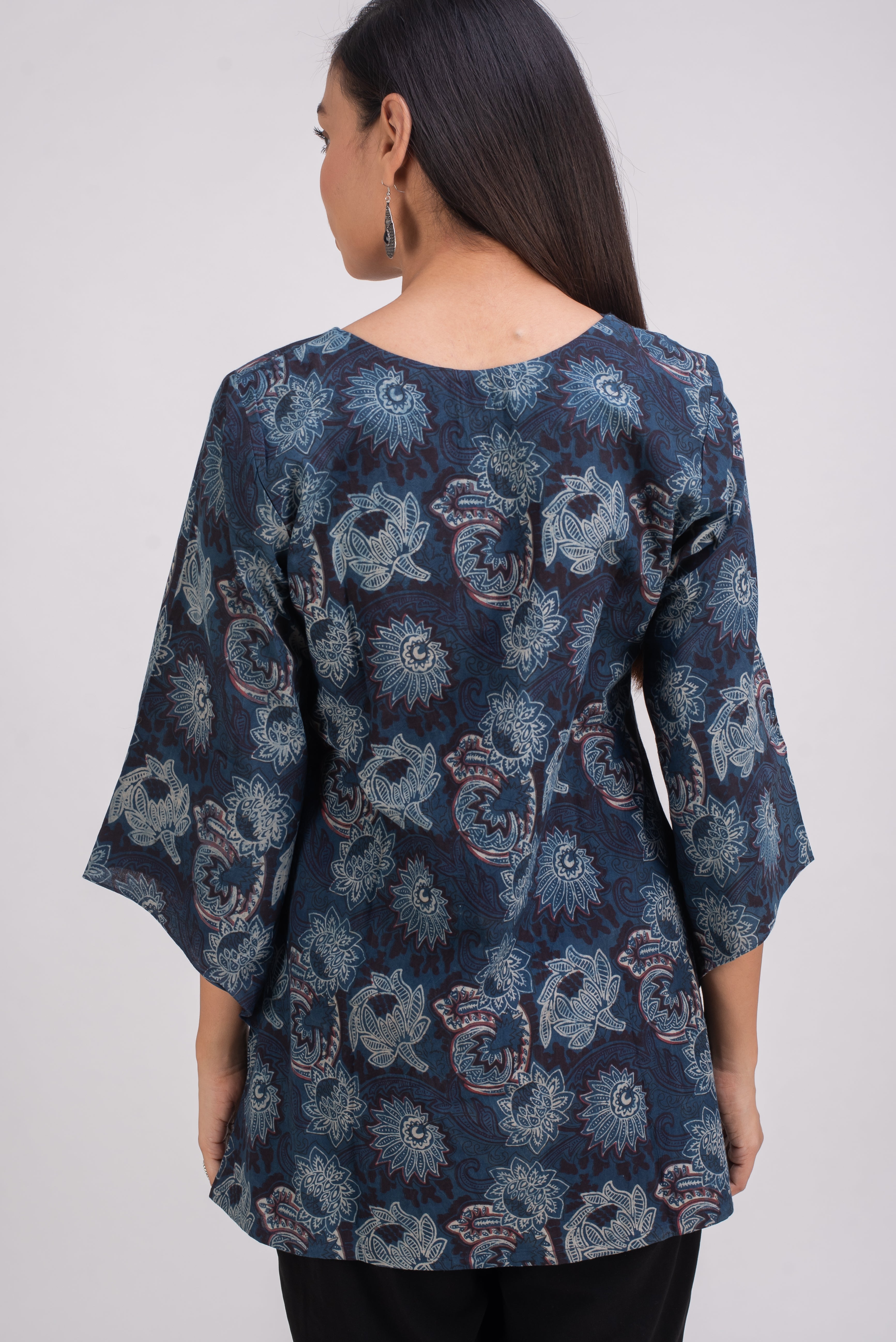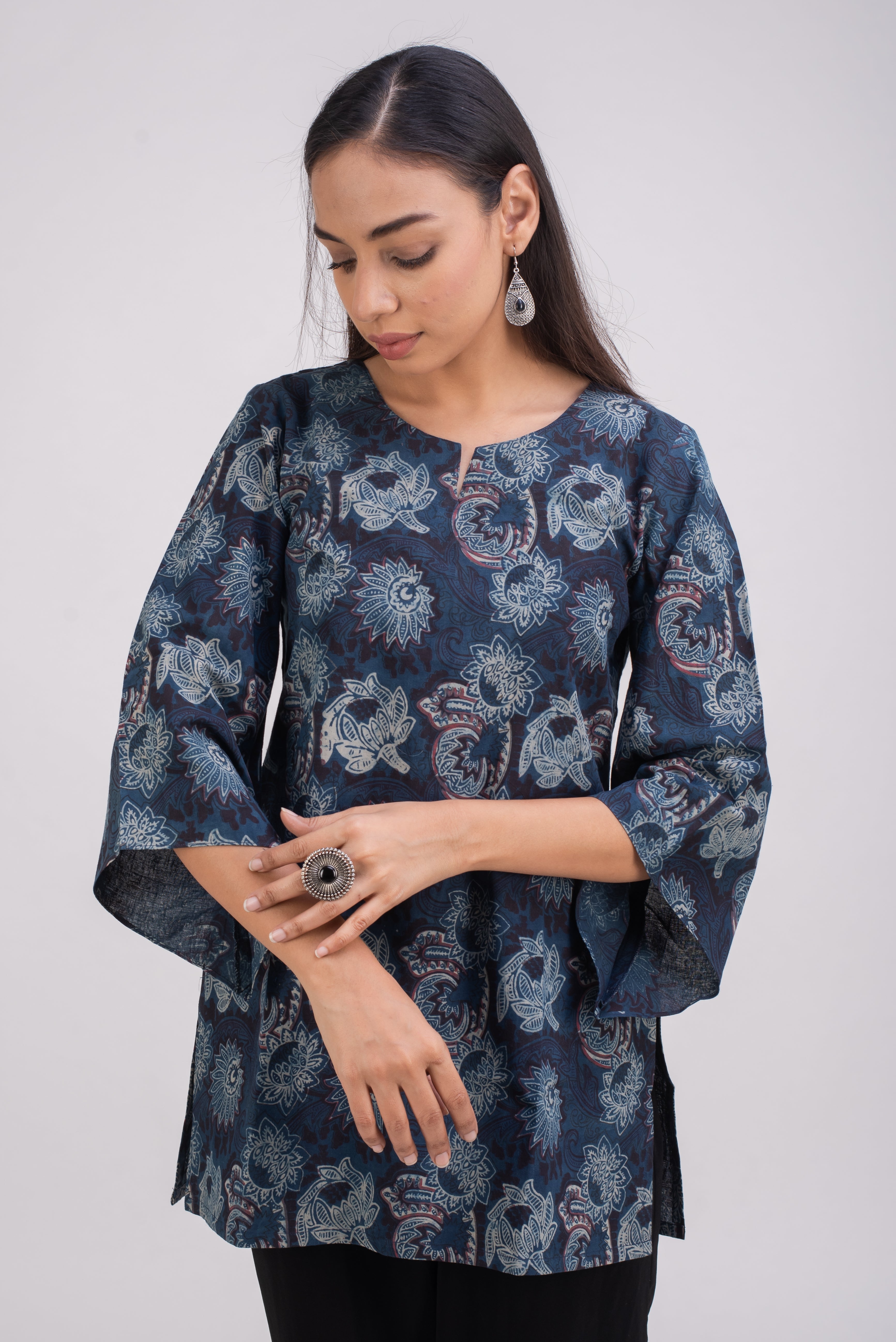 Art comes to life in this purest indigo tunic top. This fabric is made in Bagru art form of fabric printing. A signature fabric of Jaipur, India.