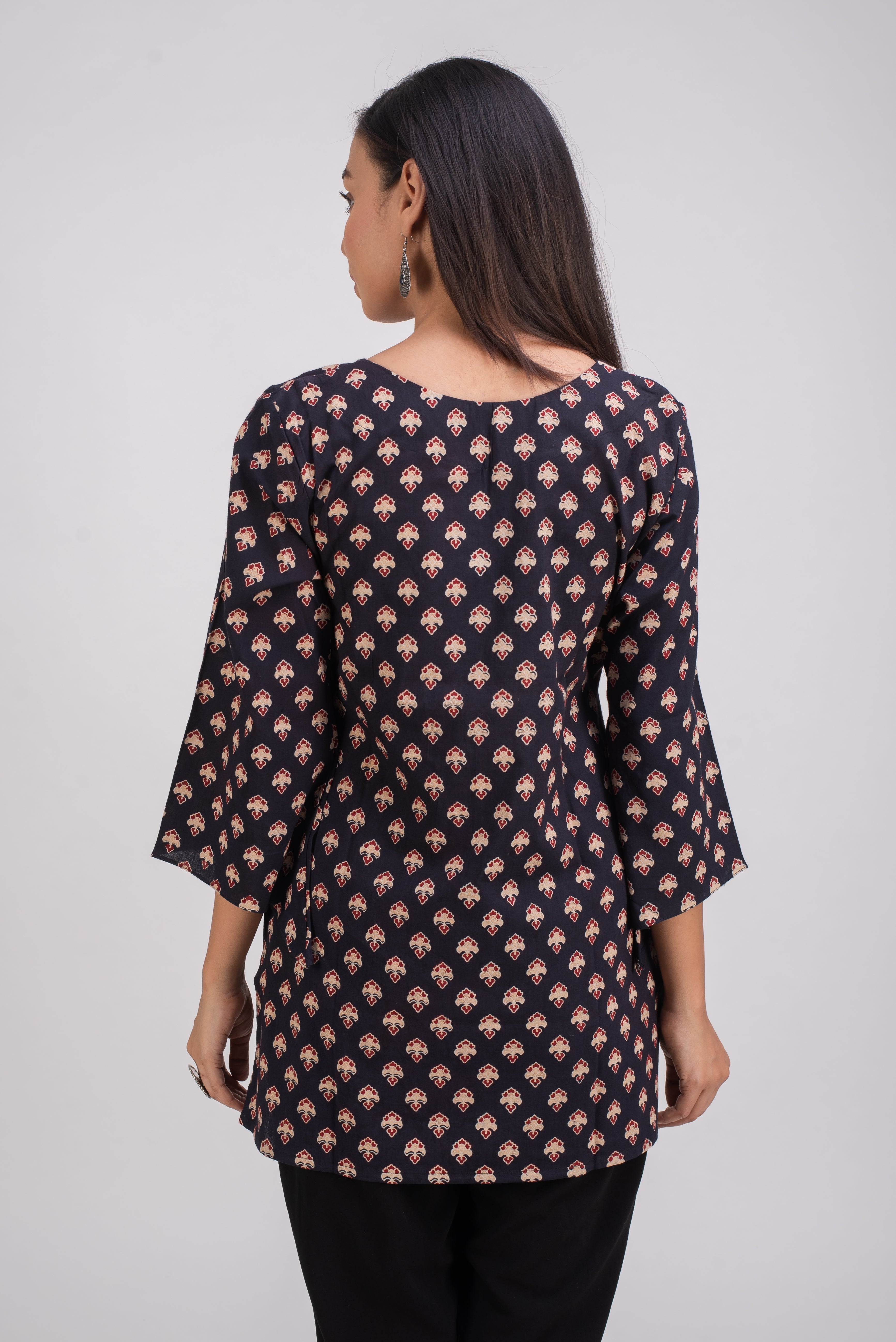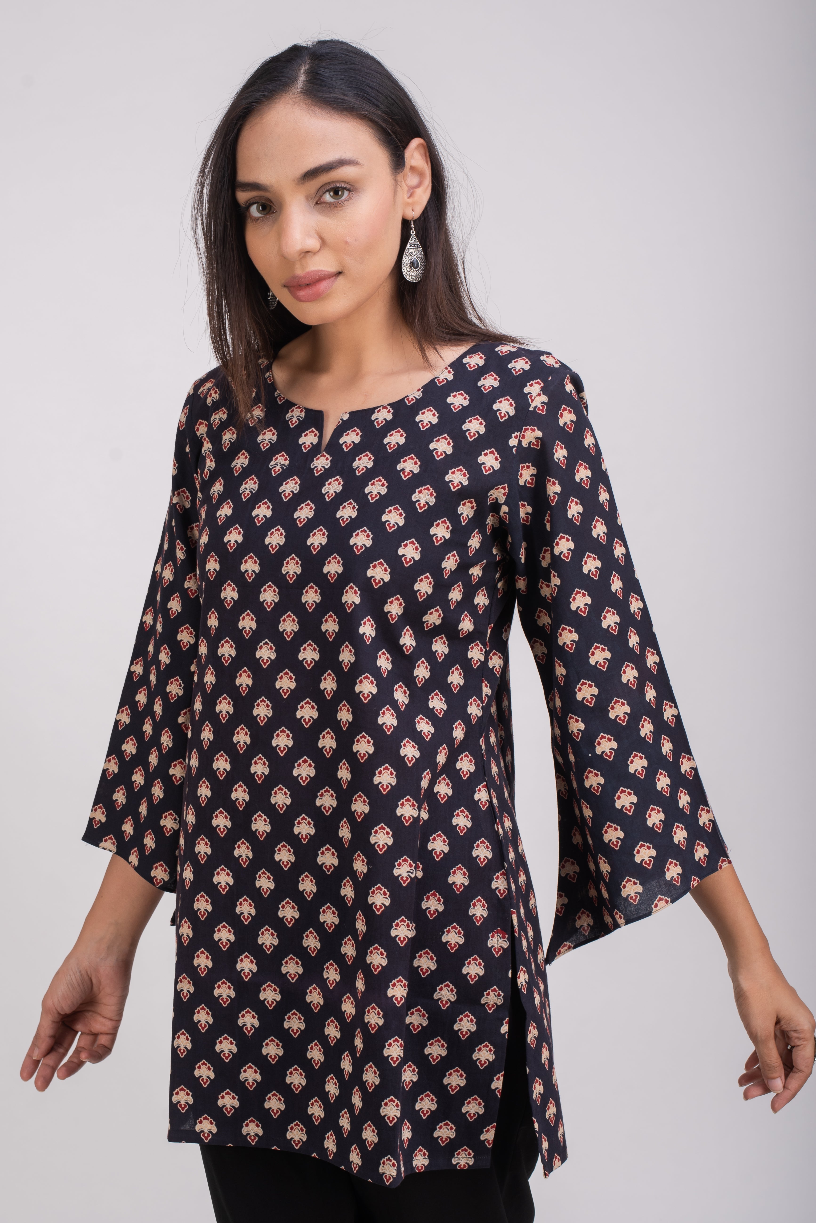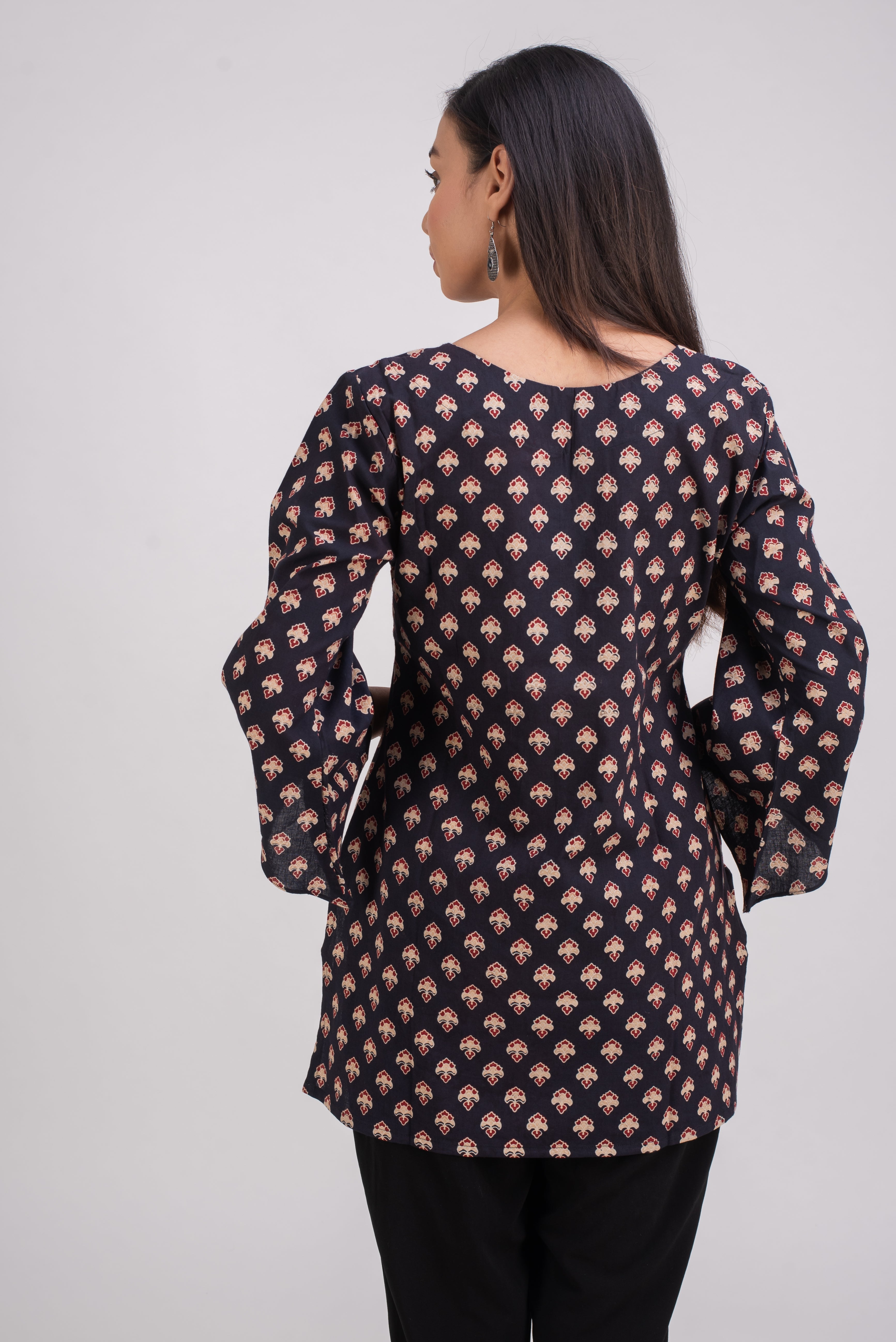 Easy wear for any occasion, this loose fitting tunic top is sure to make those long days and evenings comfortable. The slits on the sides makes it easy to sit comfortably while the length is perfect to cover the back just enough. The bell sleeves offer ample arm coverage while being very comfortable.