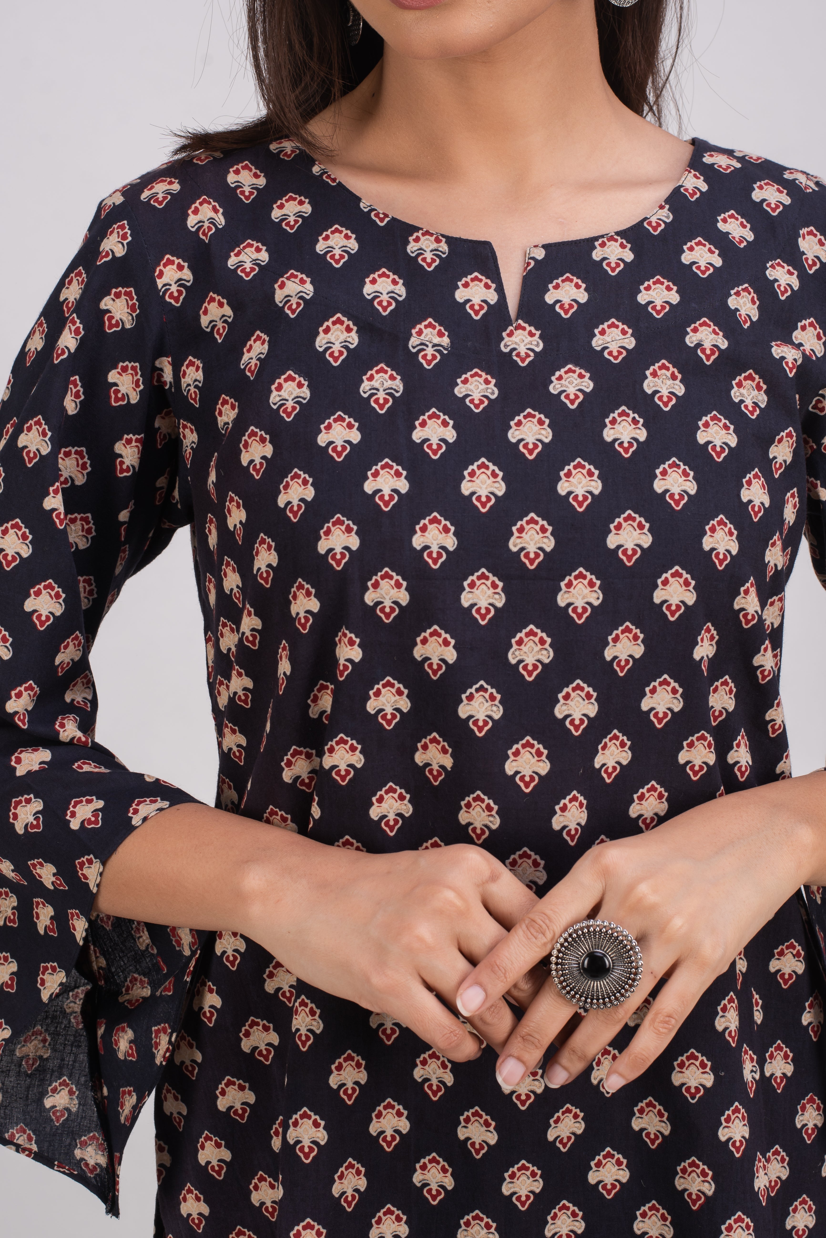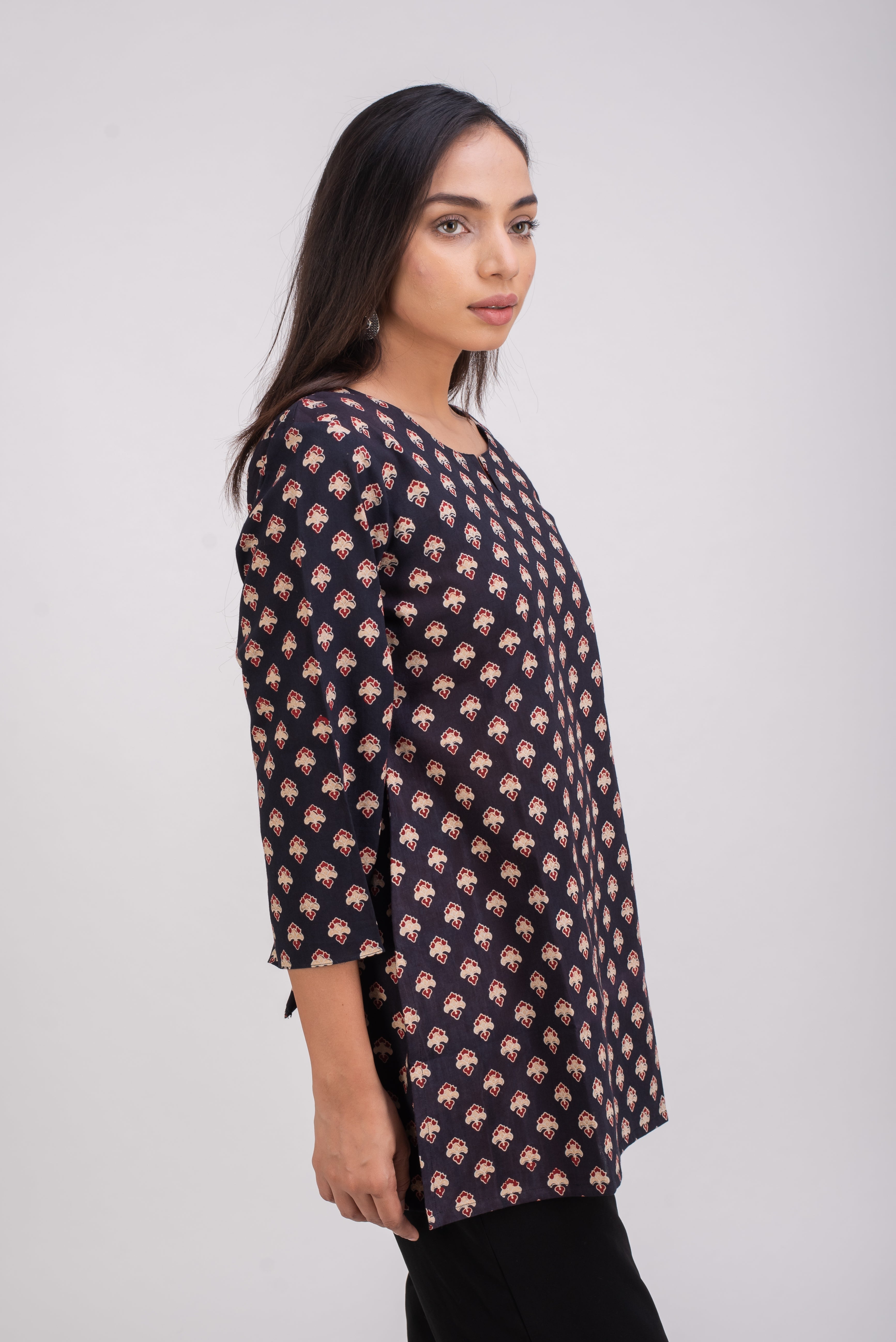 This black and natural block printed fabric is made in traditional Ajrak art form of fabric printing, a signature fabric of Jaipur, India.