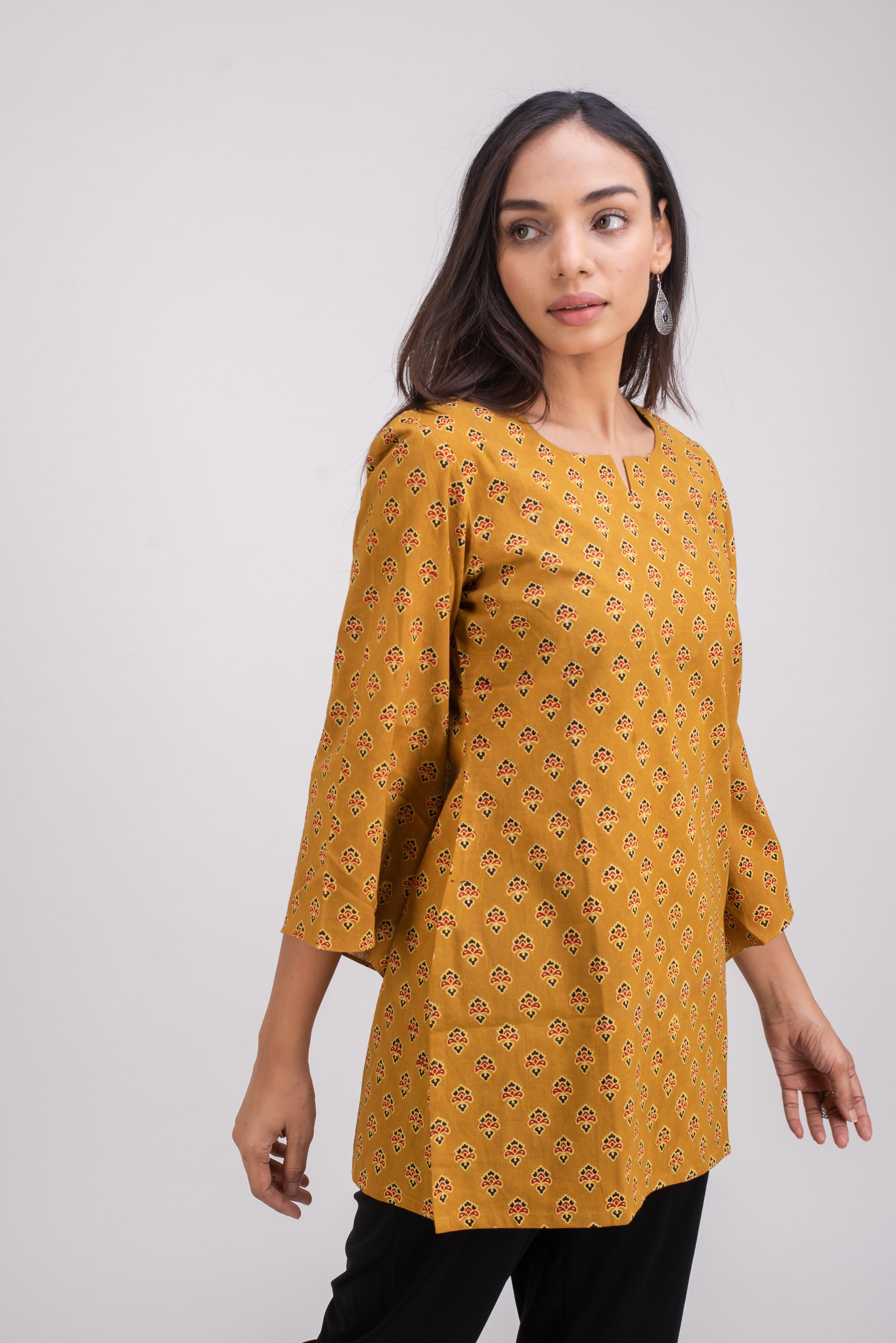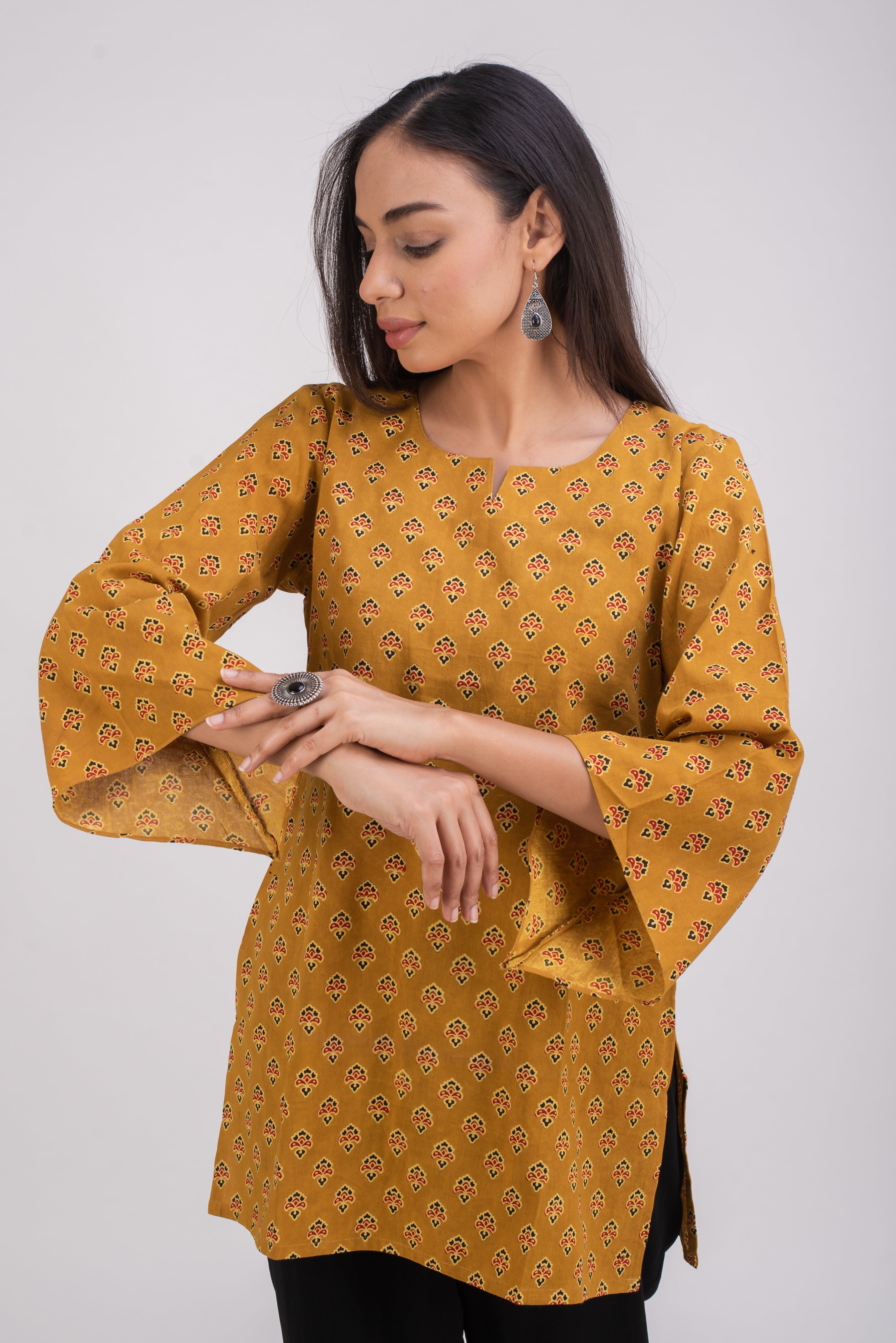Easy wear for any occasion, this loose fitting tunic top is sure to make those long days and evenings comfortable. The slits on the sides makes it easy to sit comfortably while the length is perfect to cover the back just enough. The bell sleeves offer ample arm coverage while being very comfortable.