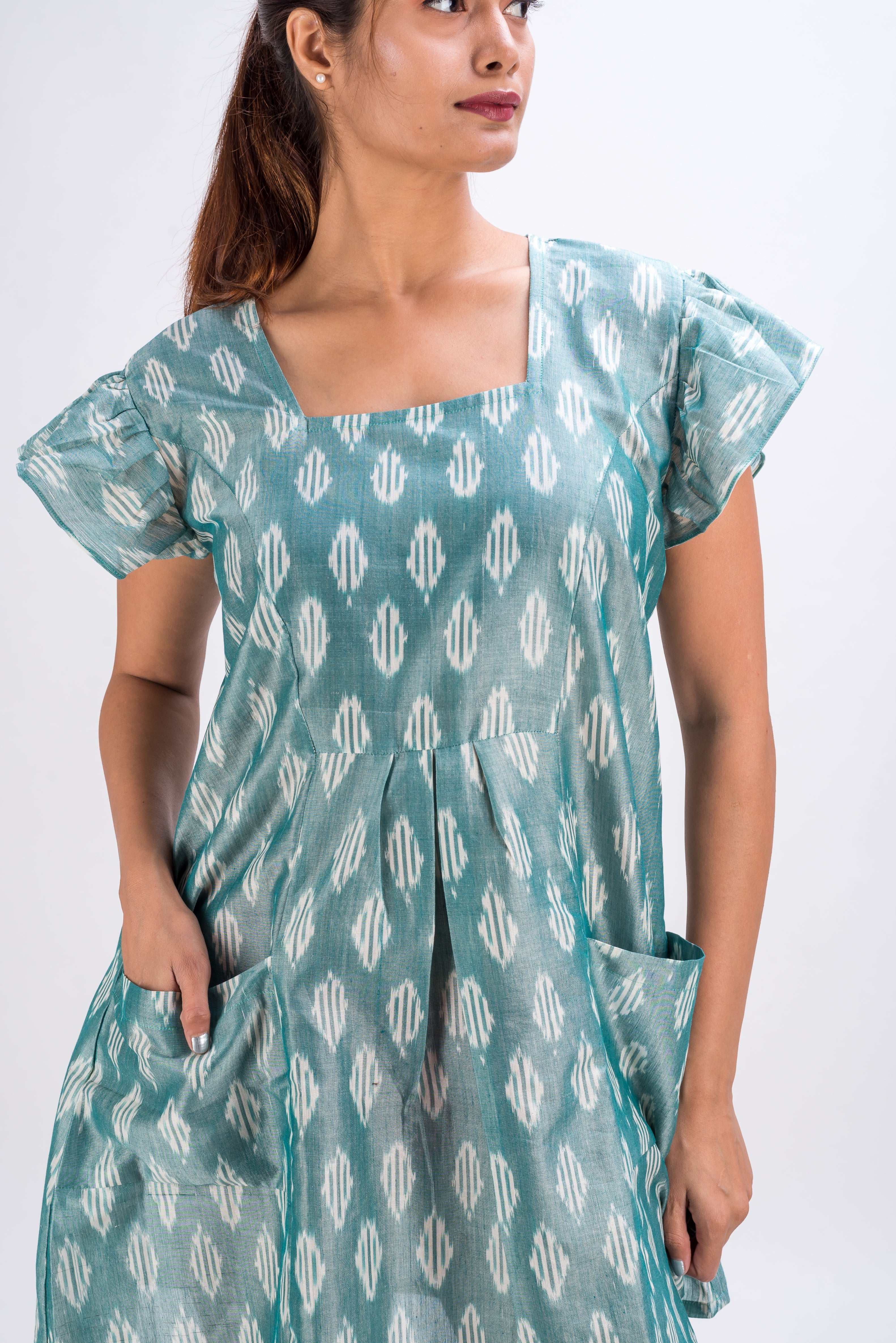 Robbins egg and white motif dress is made in breathable hand loomed fabric called Ikat. The threads are hand dyed before being woven into elegant patterns. Ikat a signature art of making fabric in India.