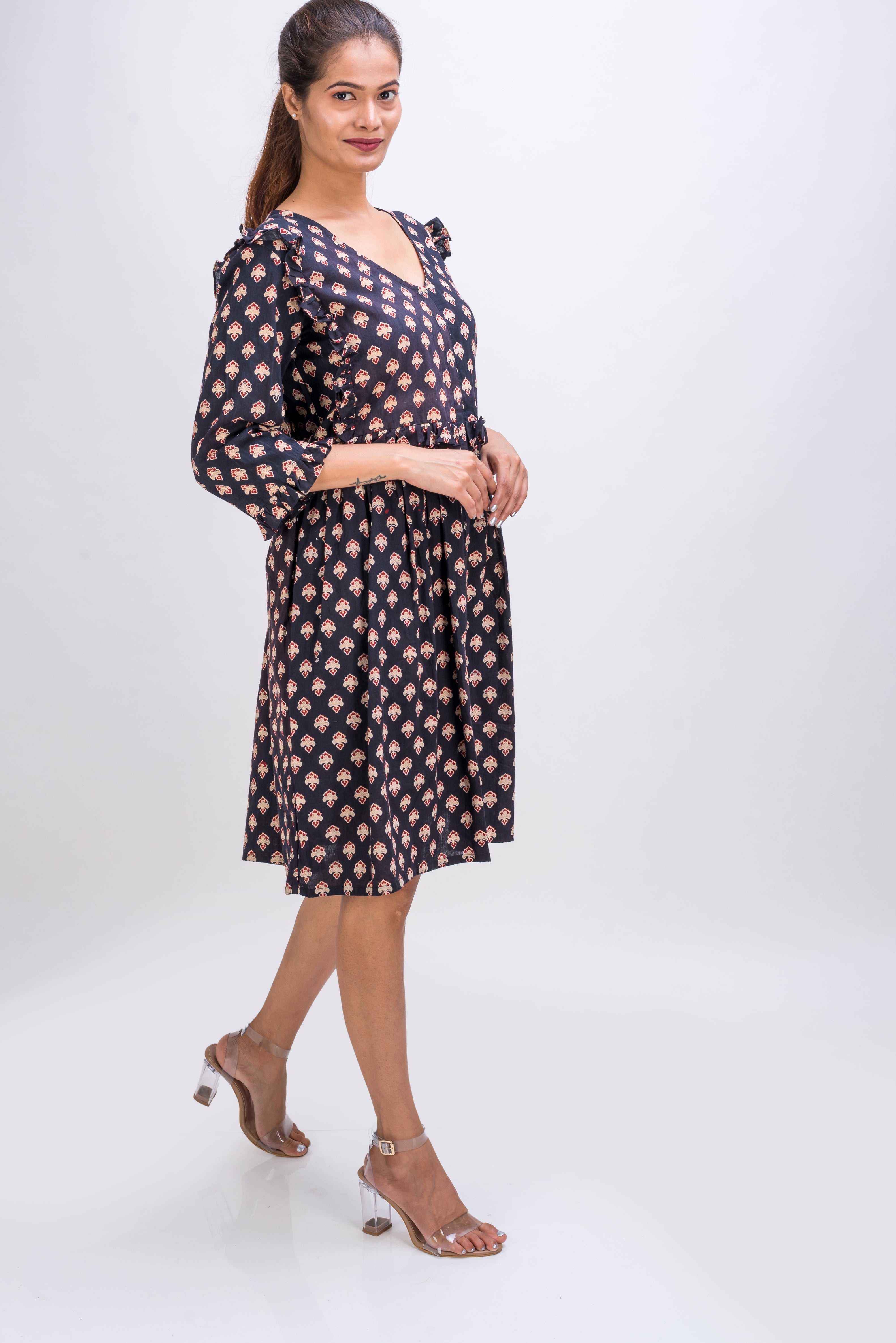 Awaken your senses in this fashionable yet a simple knee length dress. Small pleats at the end three fourth sleeve and around the chest add to the charm of this elegant dress. Wear it in between seasons or on crazy whether days, you are sure to catch few glances. Charming and comfortable dress is perfect for a warm summer days or for an evening cocktail parties!!