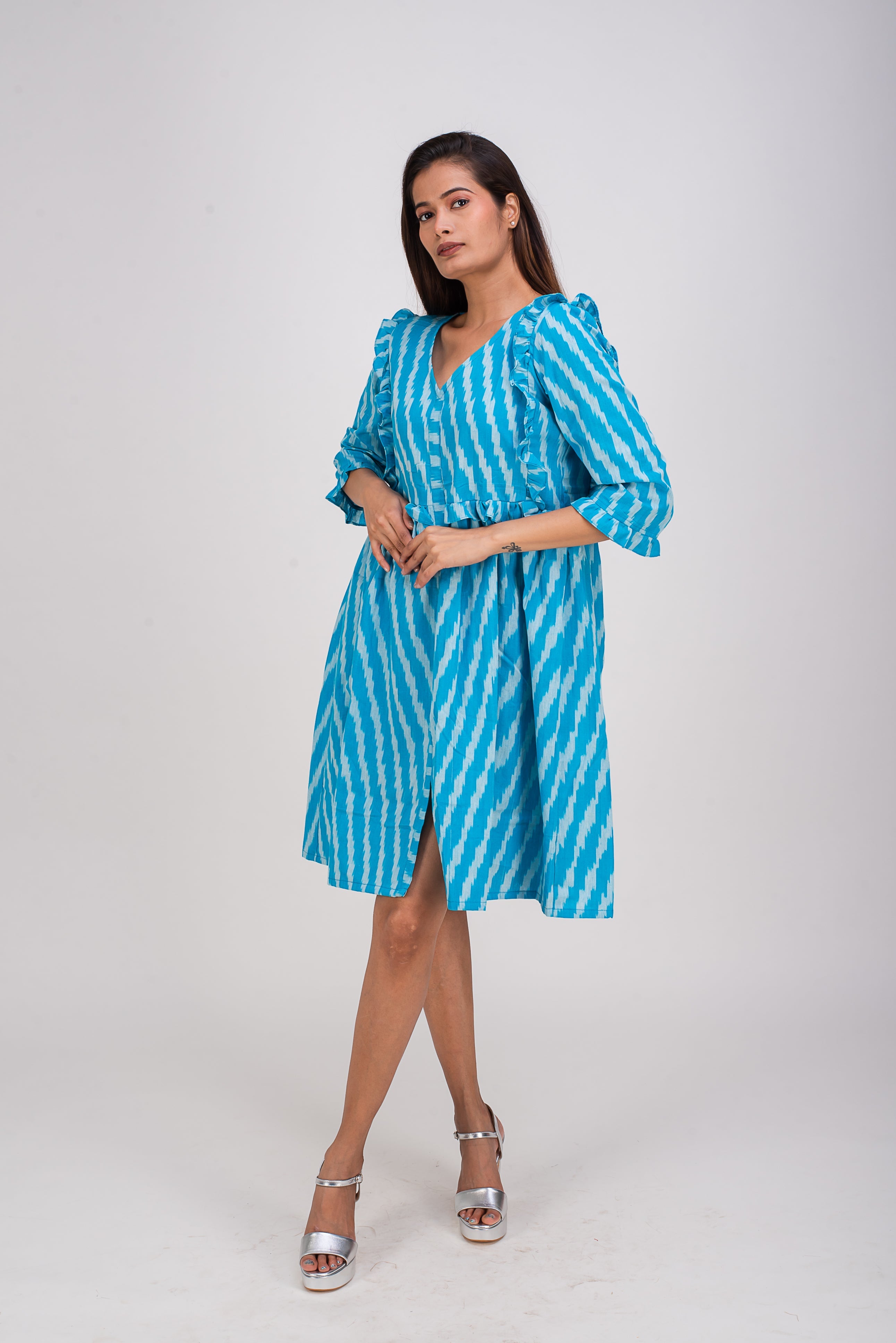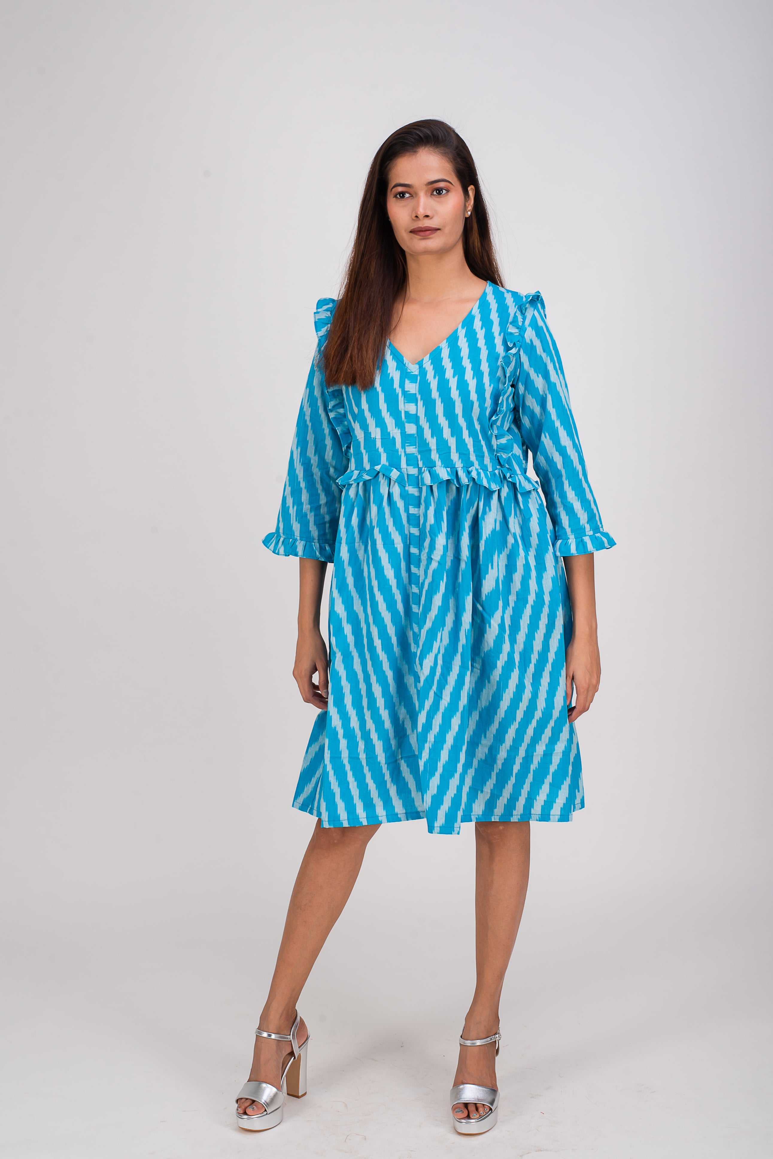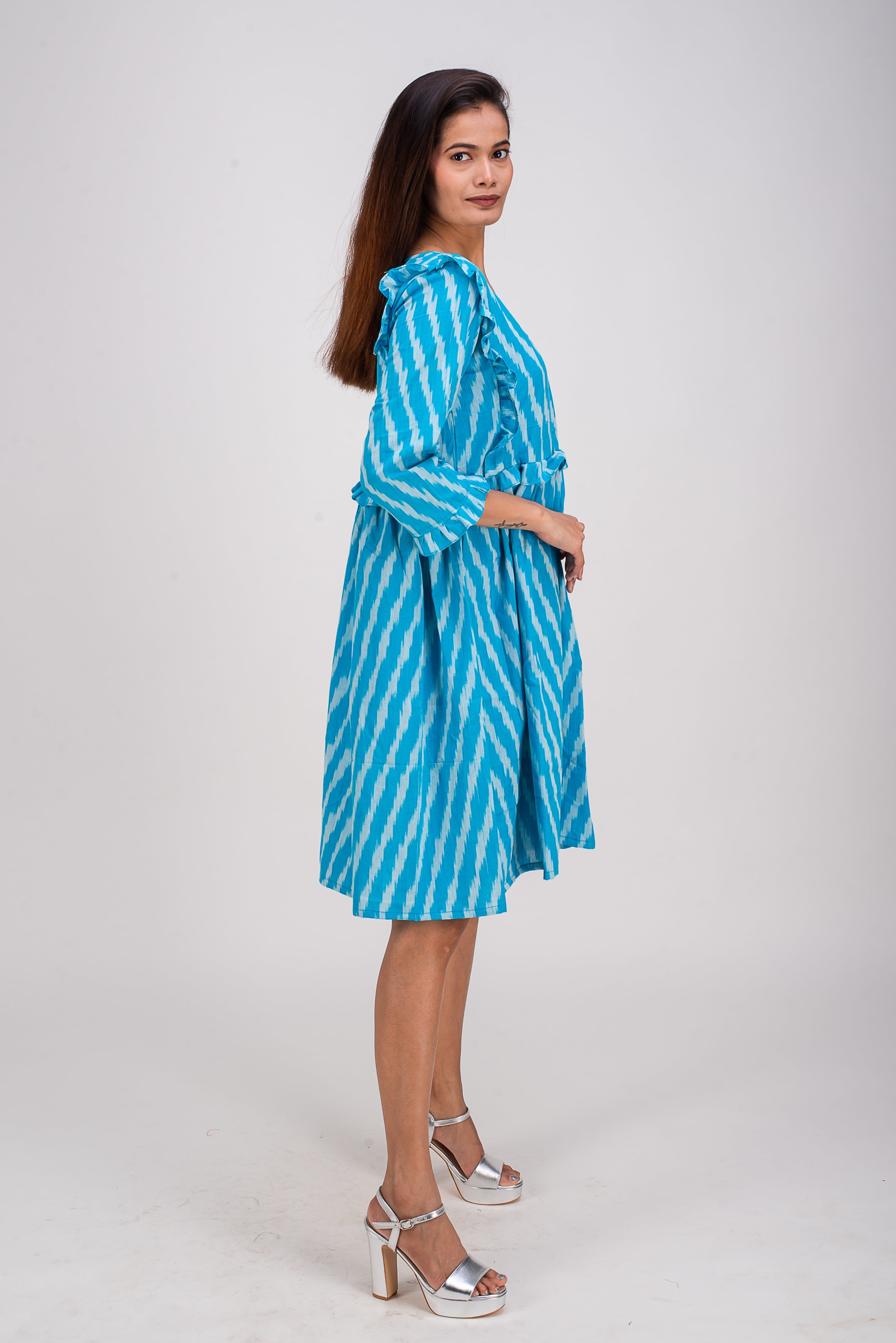 Awaken your senses in this fashionable yet a simple knee length dress. Small pleats at the end three fourth sleeve and around the chest add to the charm of this elegant dress. Wear it in between seasons or on crazy whether days, you are sure to catch few glances. Charming and comfortable dress is perfect for a warm summer days or for an evening cocktail parties!!