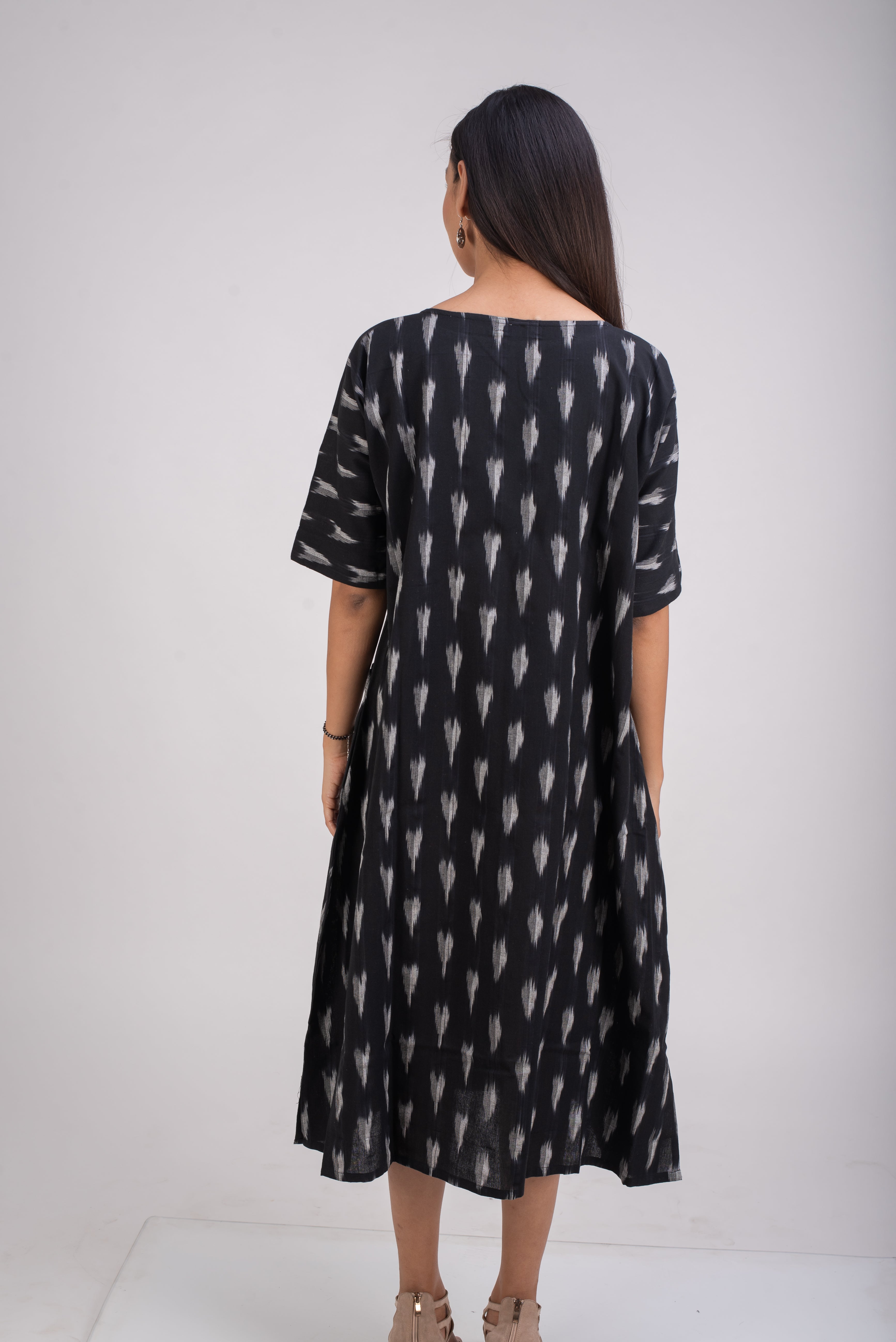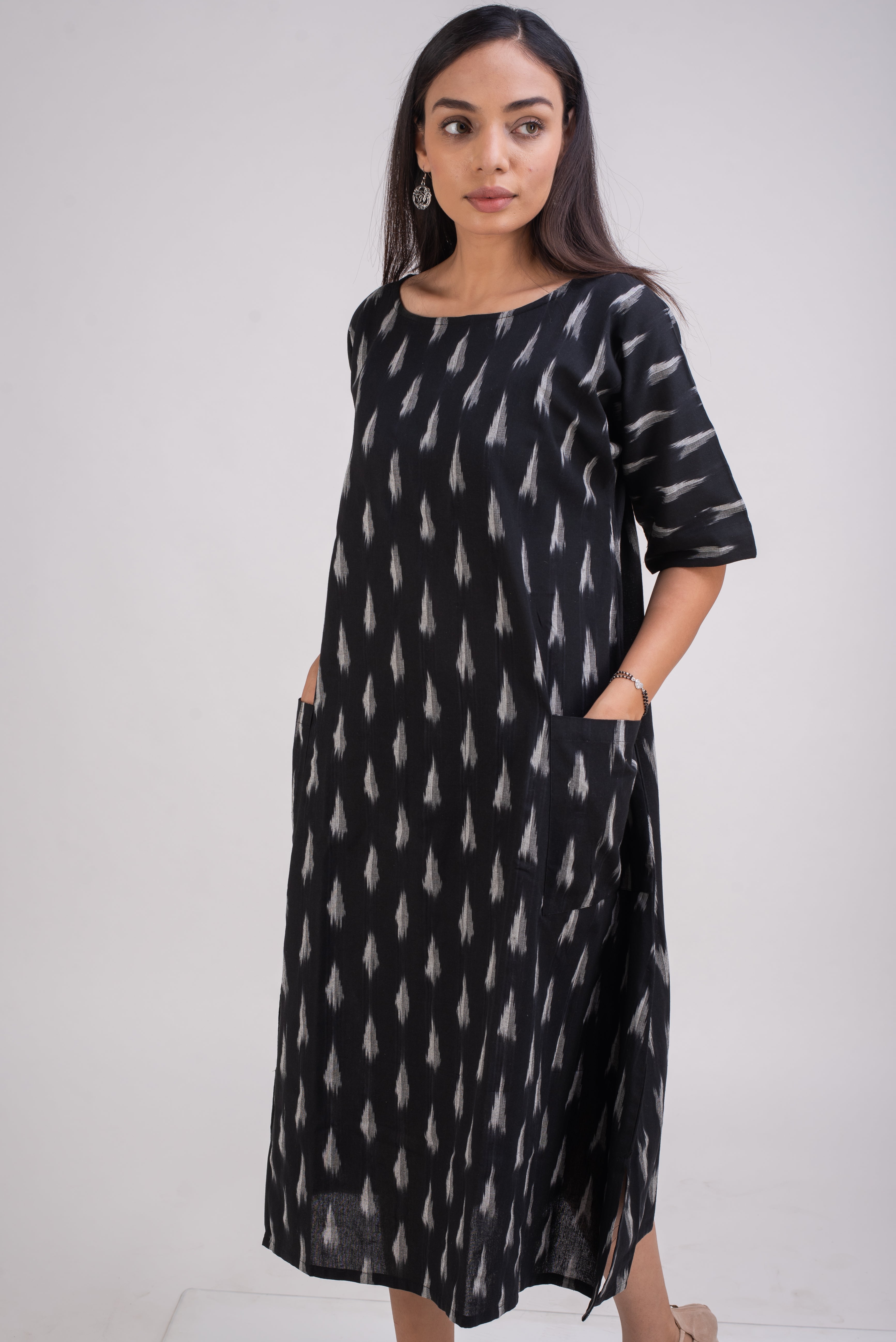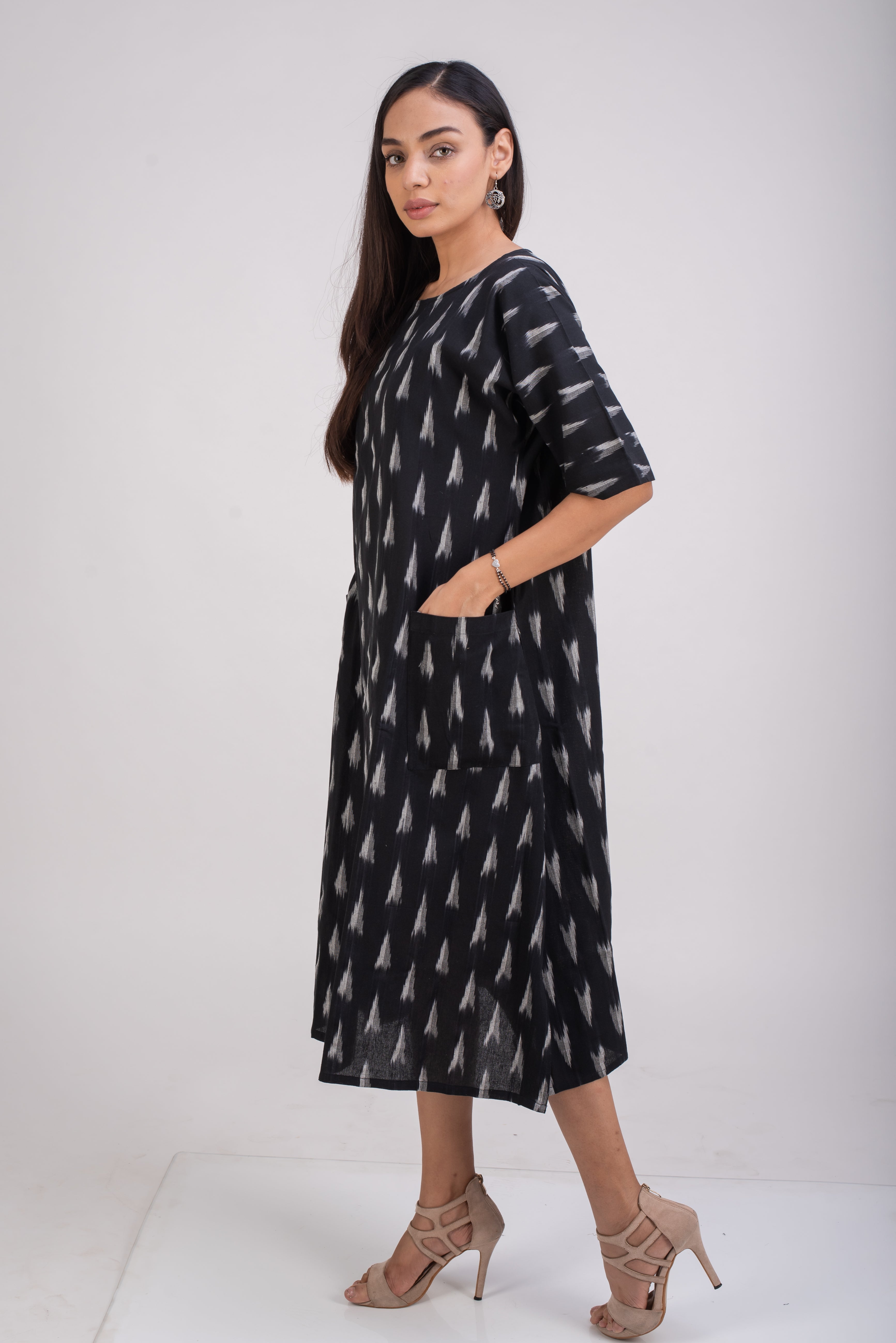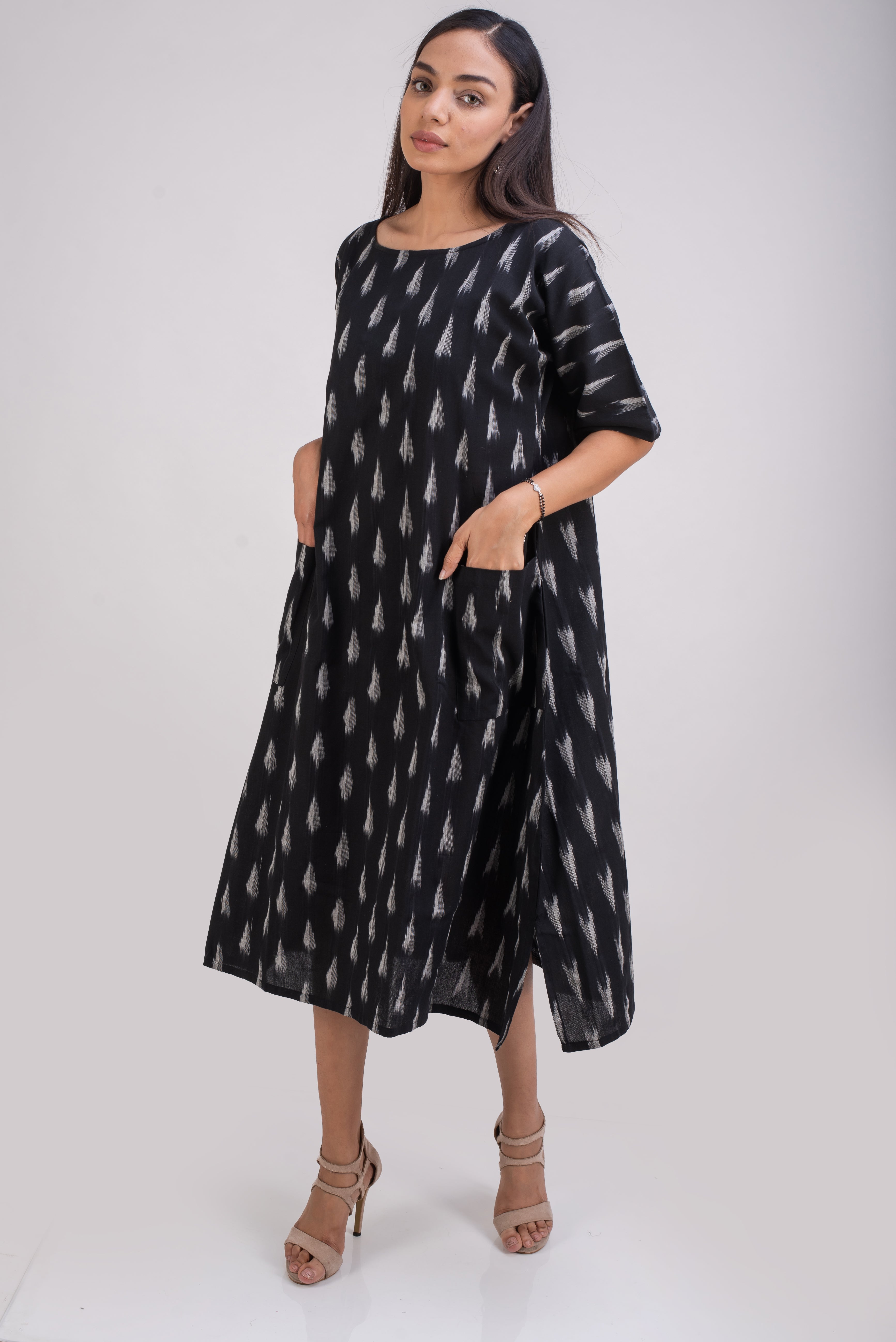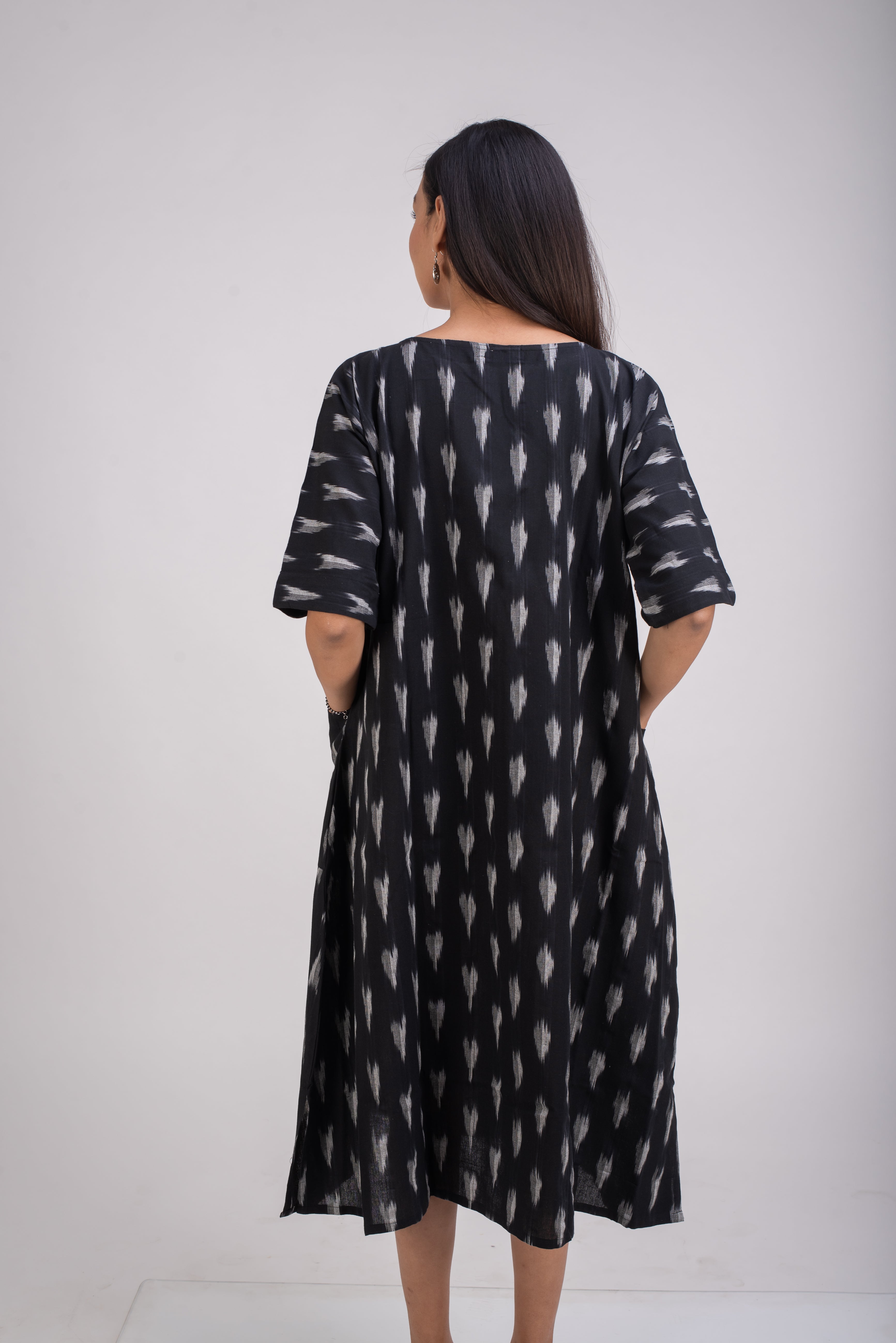 A classic black and white, is made in breathable hand loomed fabric called Ikat . The threads are hand dyed before being woven into elegant patterns. Ikat is a signature art of making fabric in Telangana, India.