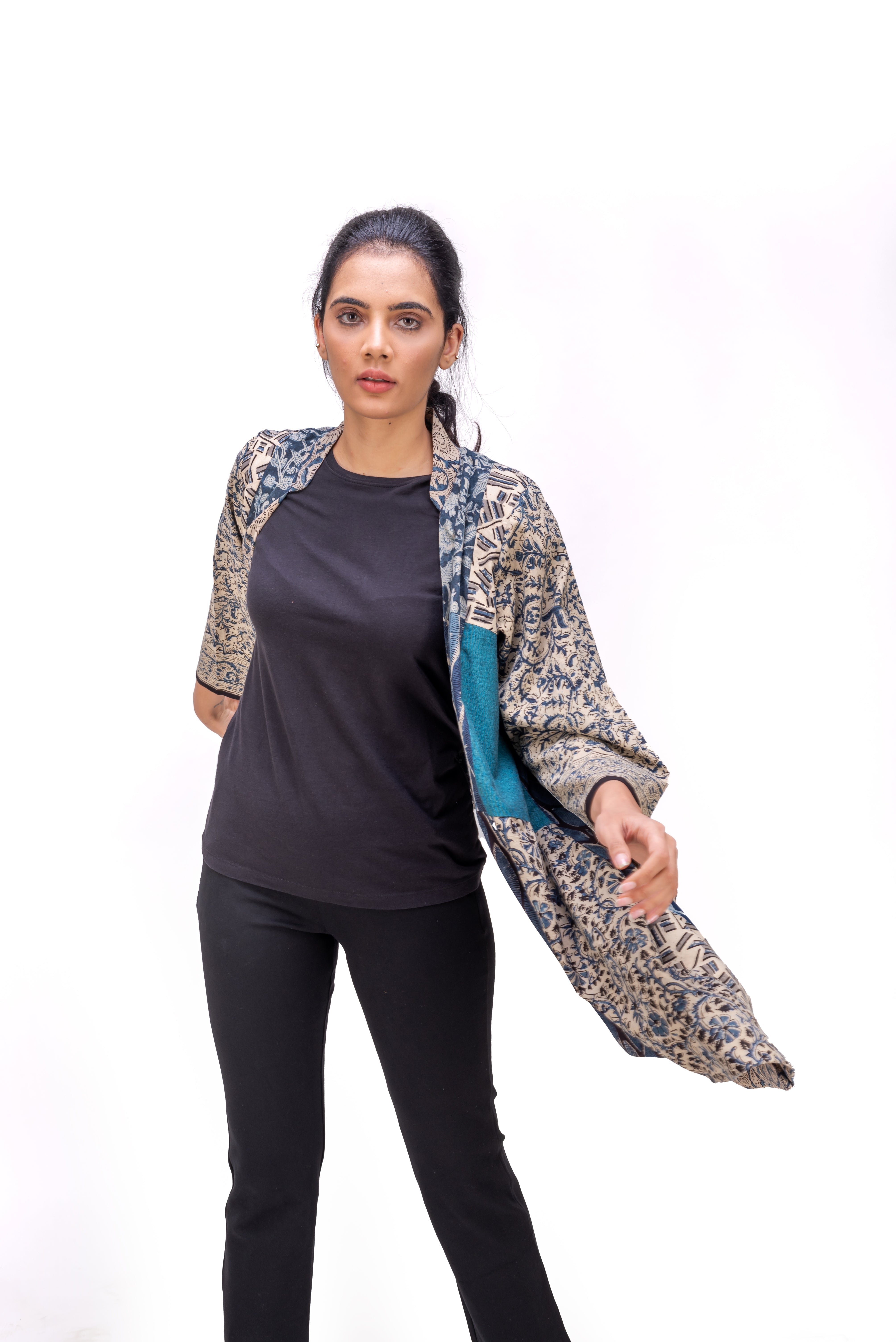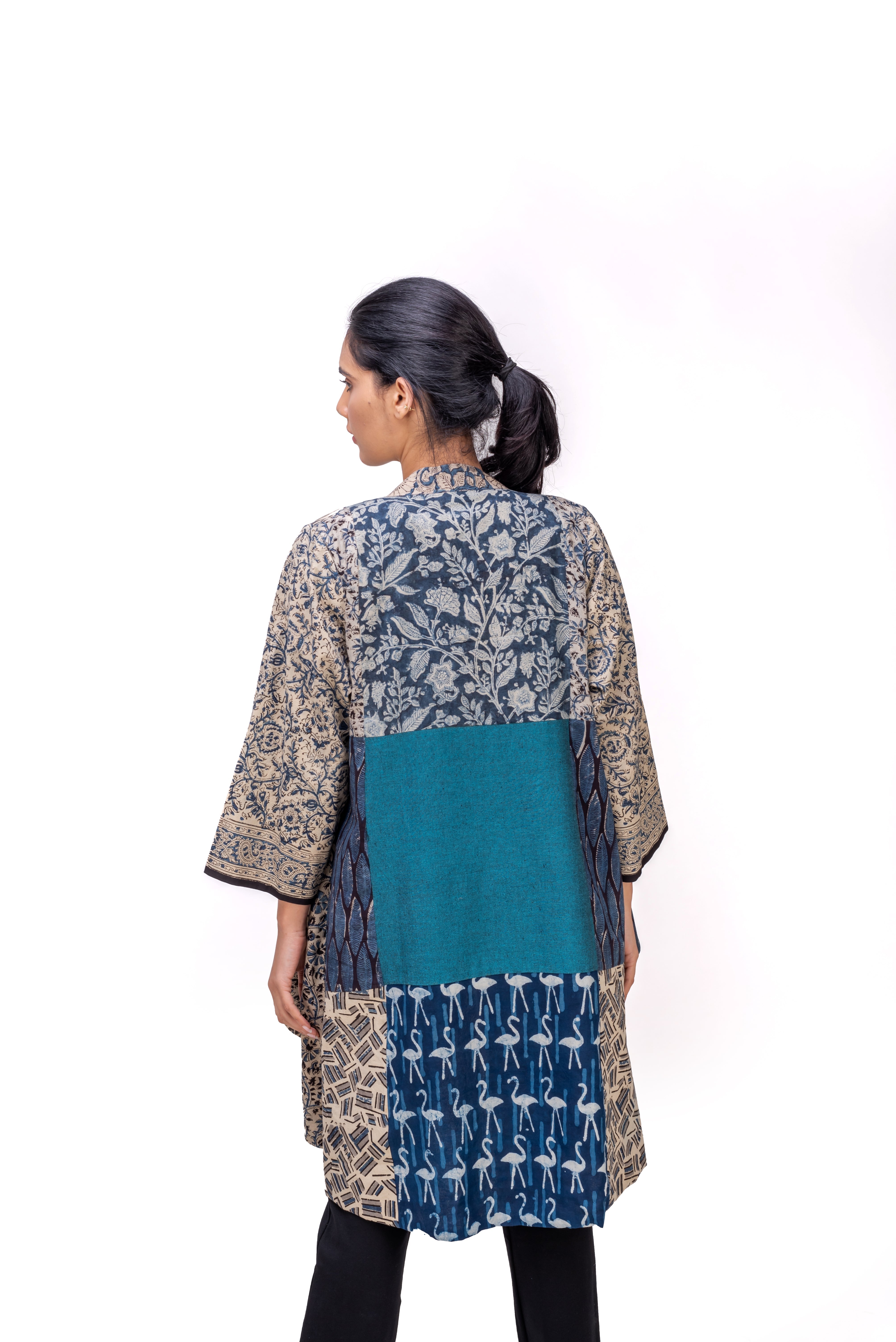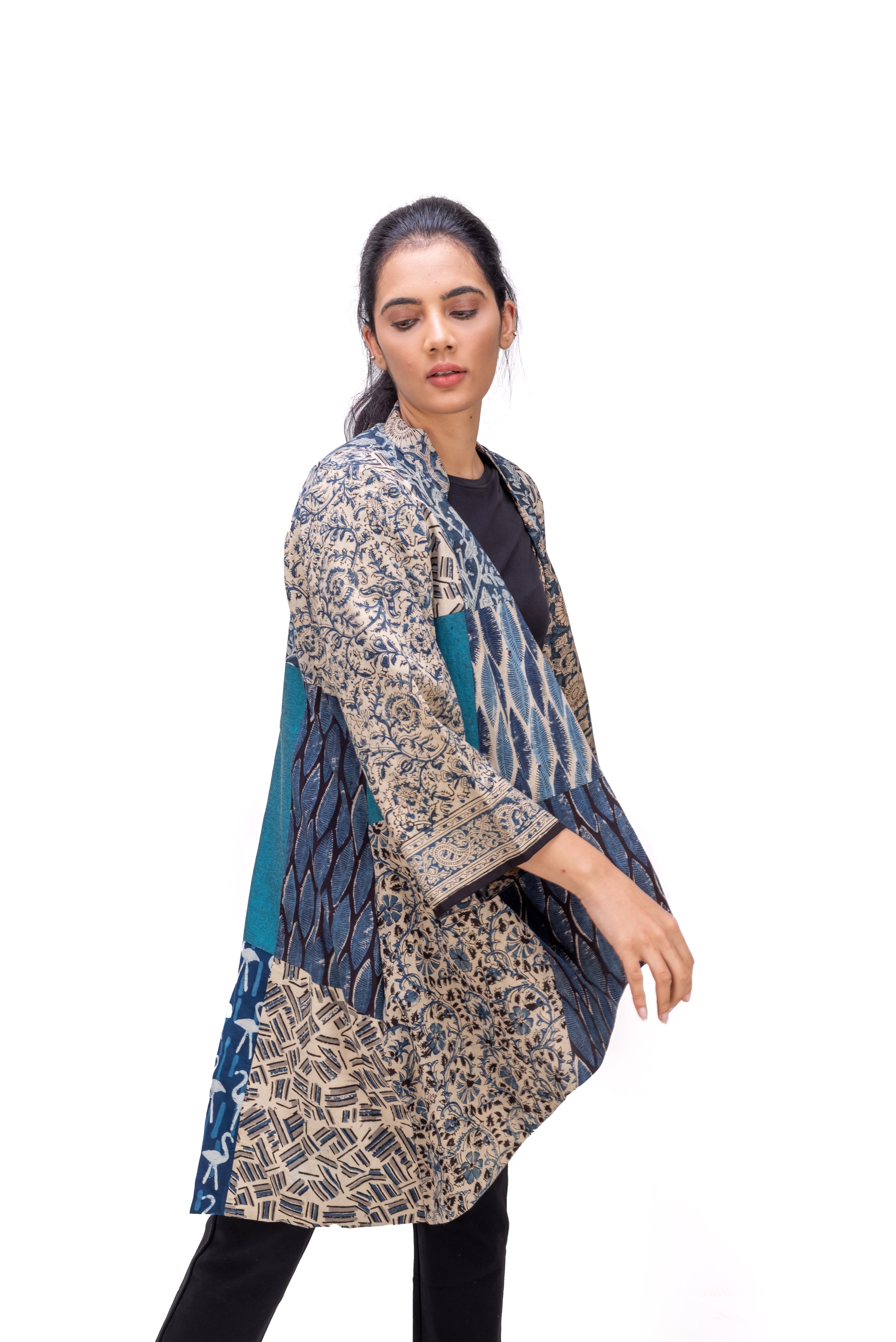 O lala!! fun bohemian multi printed coat is a reminiscence of 1970'S. A classic Kimono Jacket with loose fitting long sleeve and a Chinese collar makes you look carefree and chic. Wear it on a chilly evening as a cardigan or on shorts and make a statement.