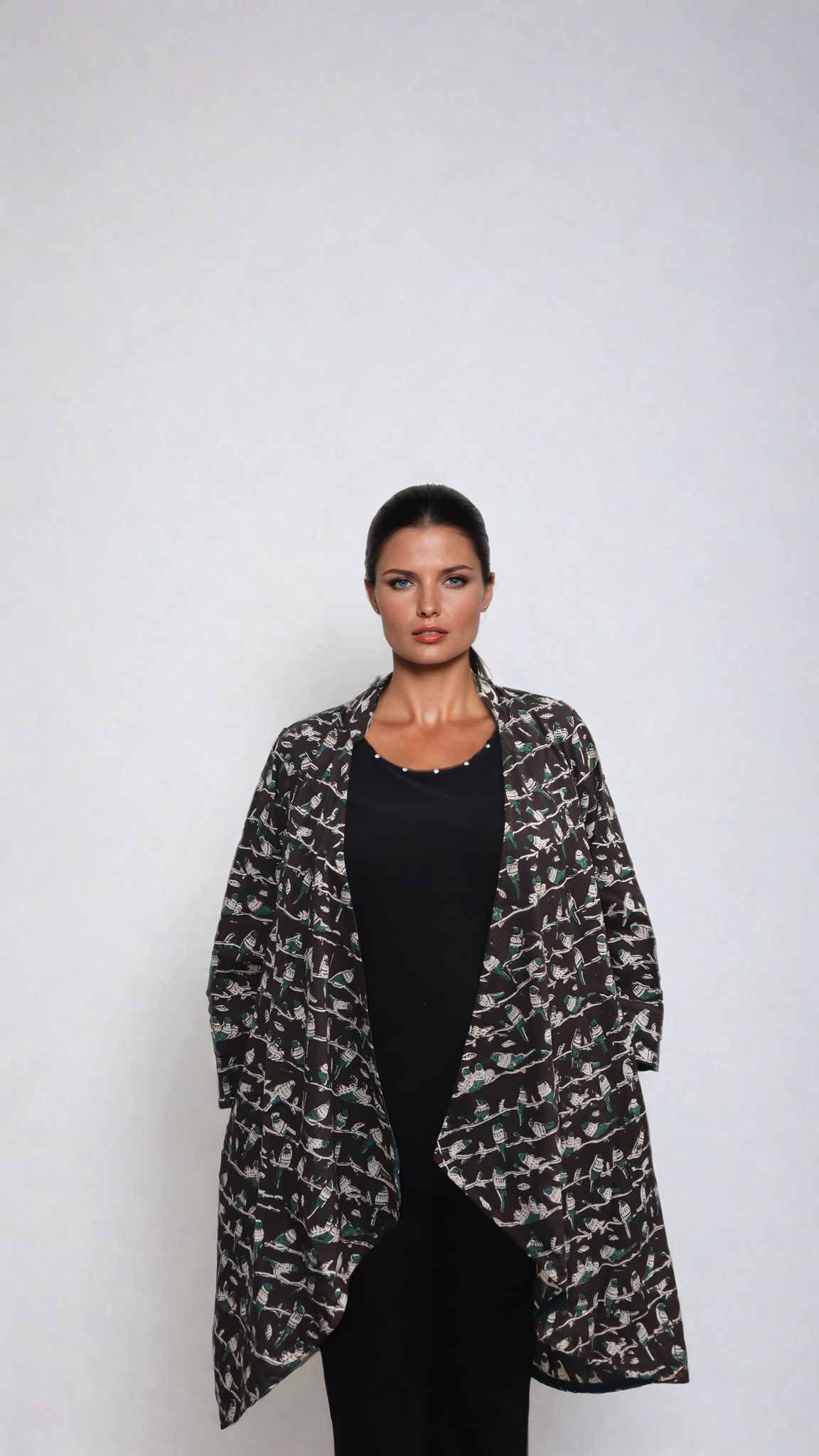 This kimono, named "Midnight Aviary," combines the mystique of the night with the enchanting beauty of nature. Crafted from lightweight cotton voile, this piece is as comfortable as it is stylish, making it an ideal choice for layering in any season.