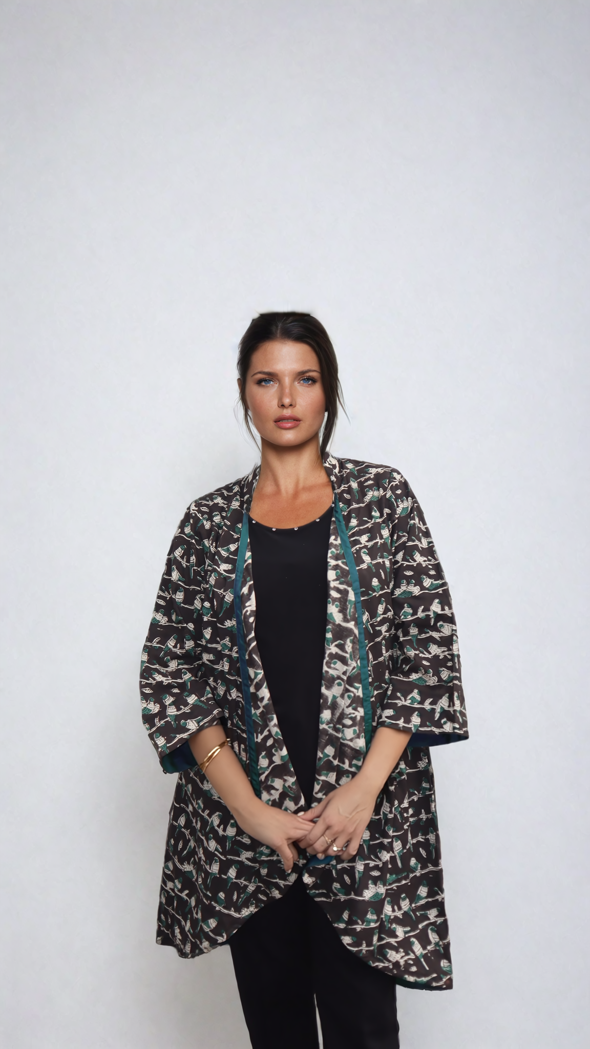 The "Midnight Aviary" kimono features a captivating print of birds perched on branches, set against a deep, dark background. The intricate details of the birds, rendered in soft teal and cream hues, stand out beautifully against the rich black base, creating a sense of depth and intrigue. This nature-inspired pattern brings a touch of whimsy to the design, while the dark color palette adds an air of sophistication.