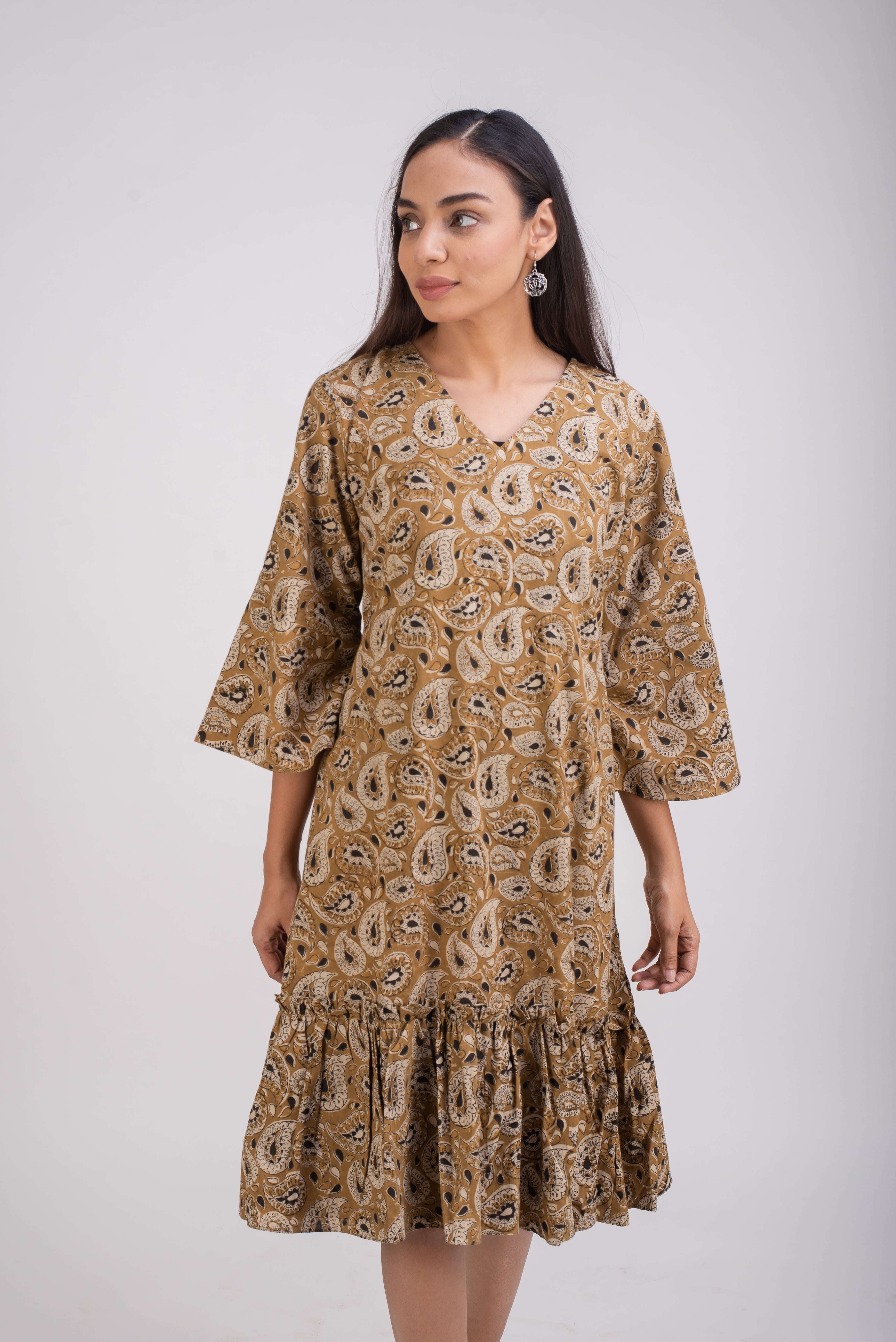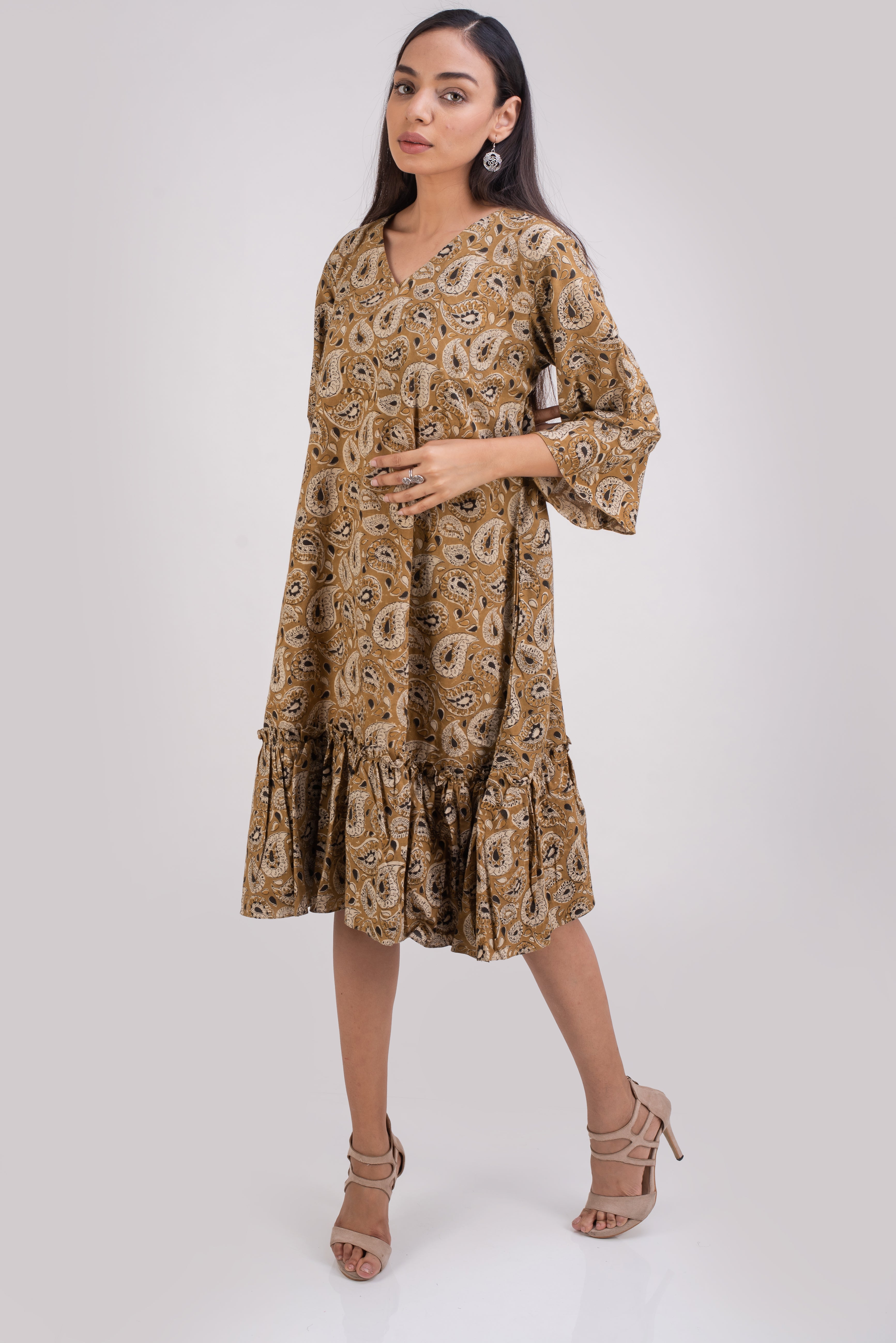 Easy breezy soft and comfortable dress that you can practically live in. wear it as a day dress or for a dance on that special evening!. This chic Bell sleeve, V neck dress is designed to hide the tummy and hips The two side pockets add to the comfort. This cotton midi is perfect for a warm summer night or cool fall evening.