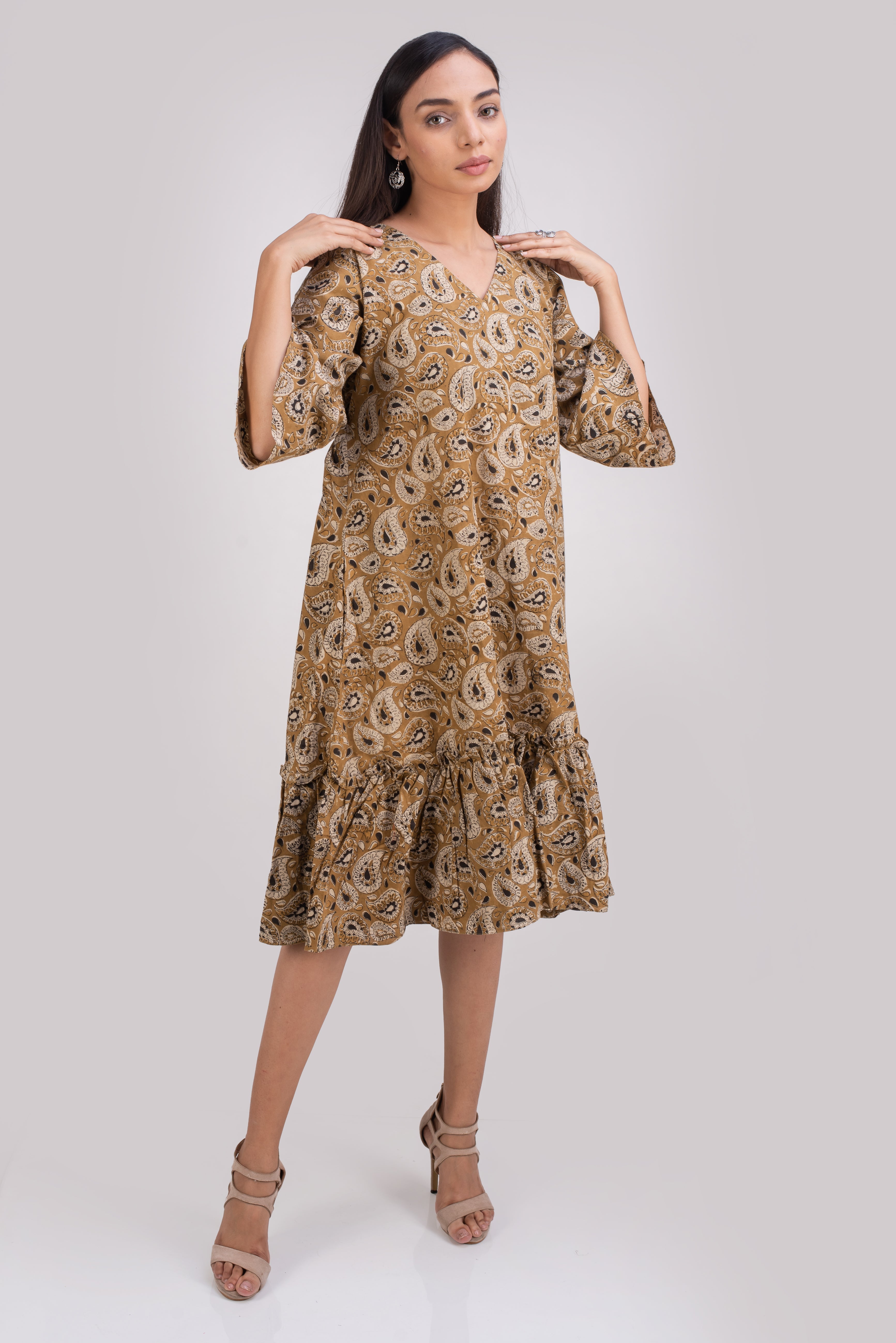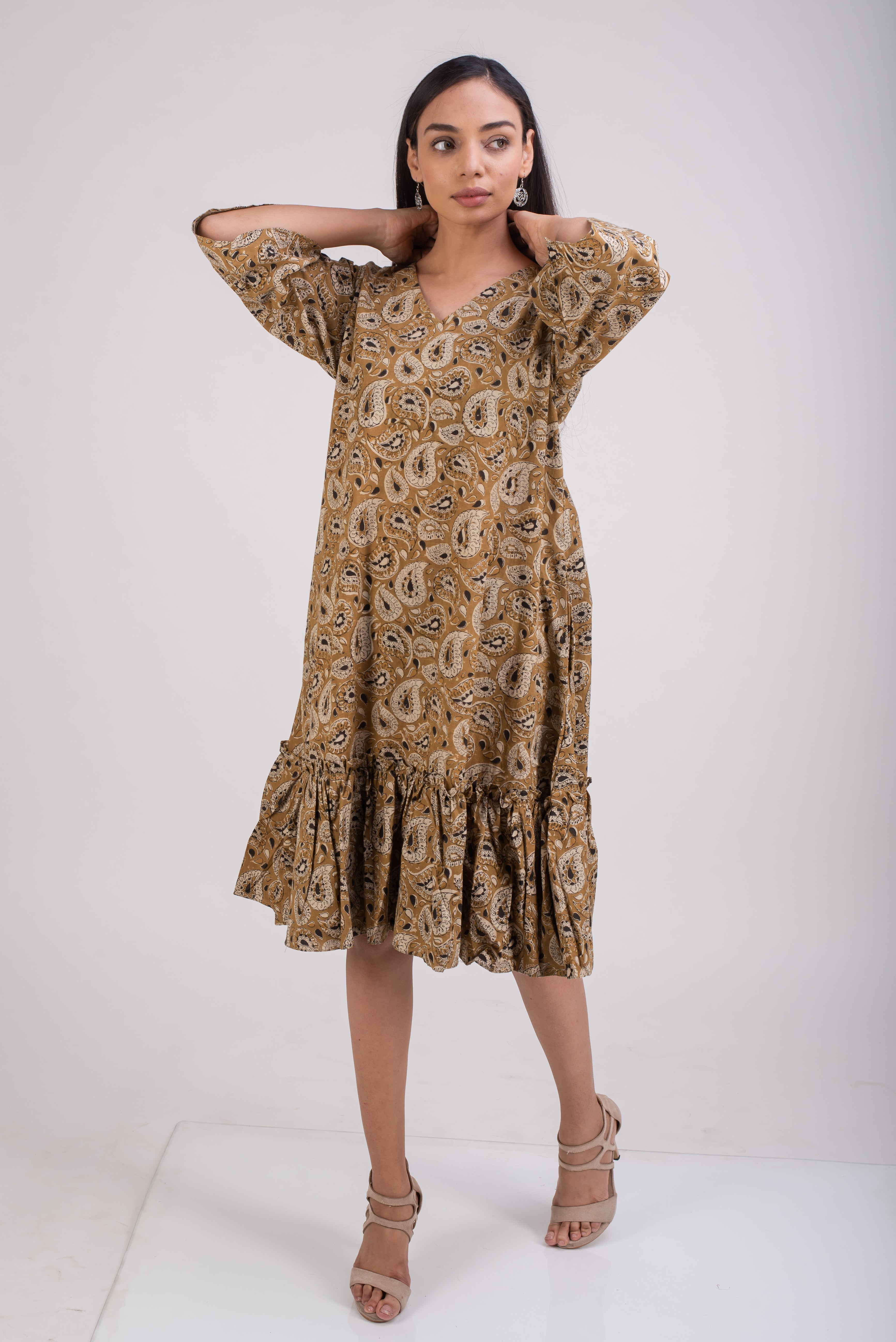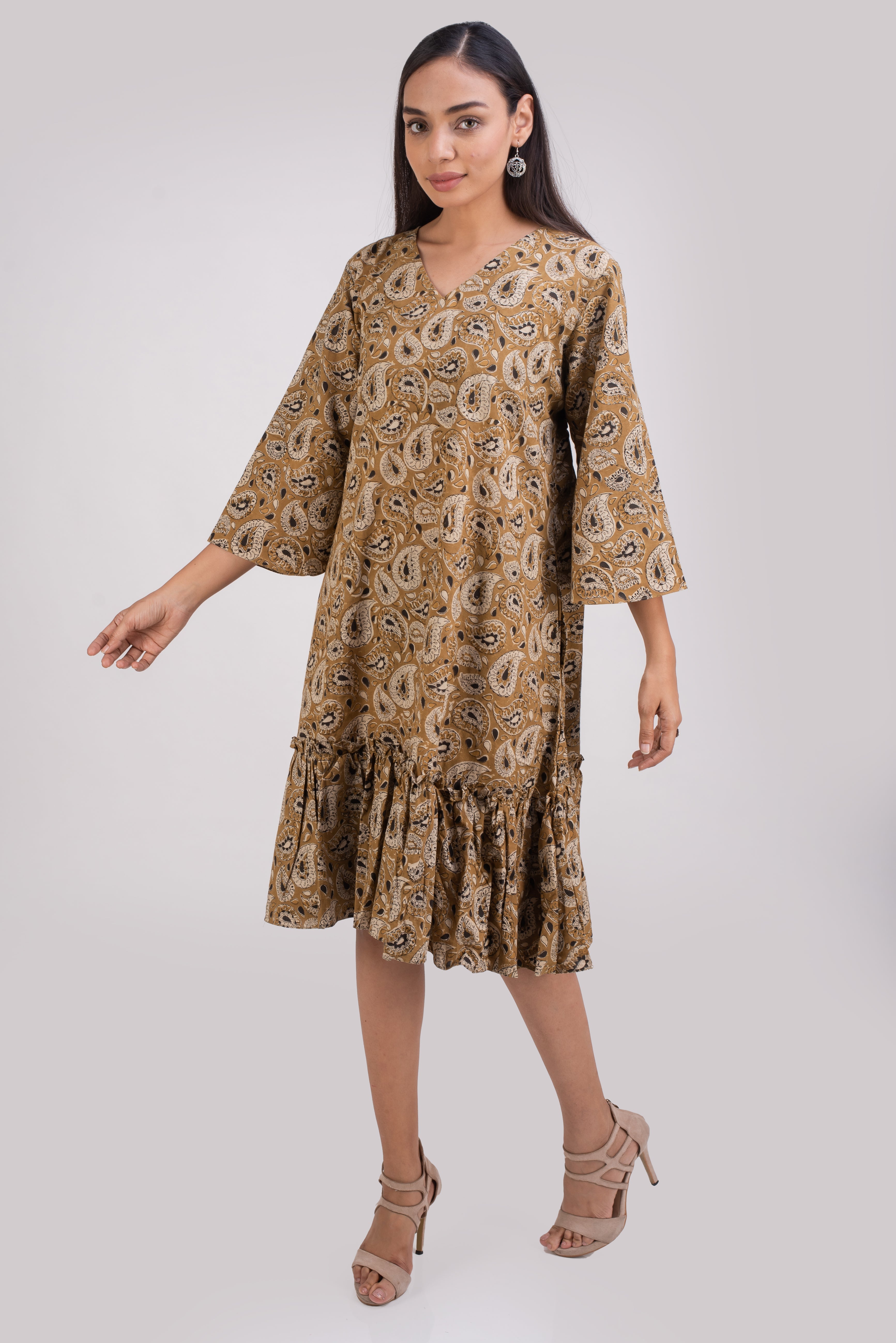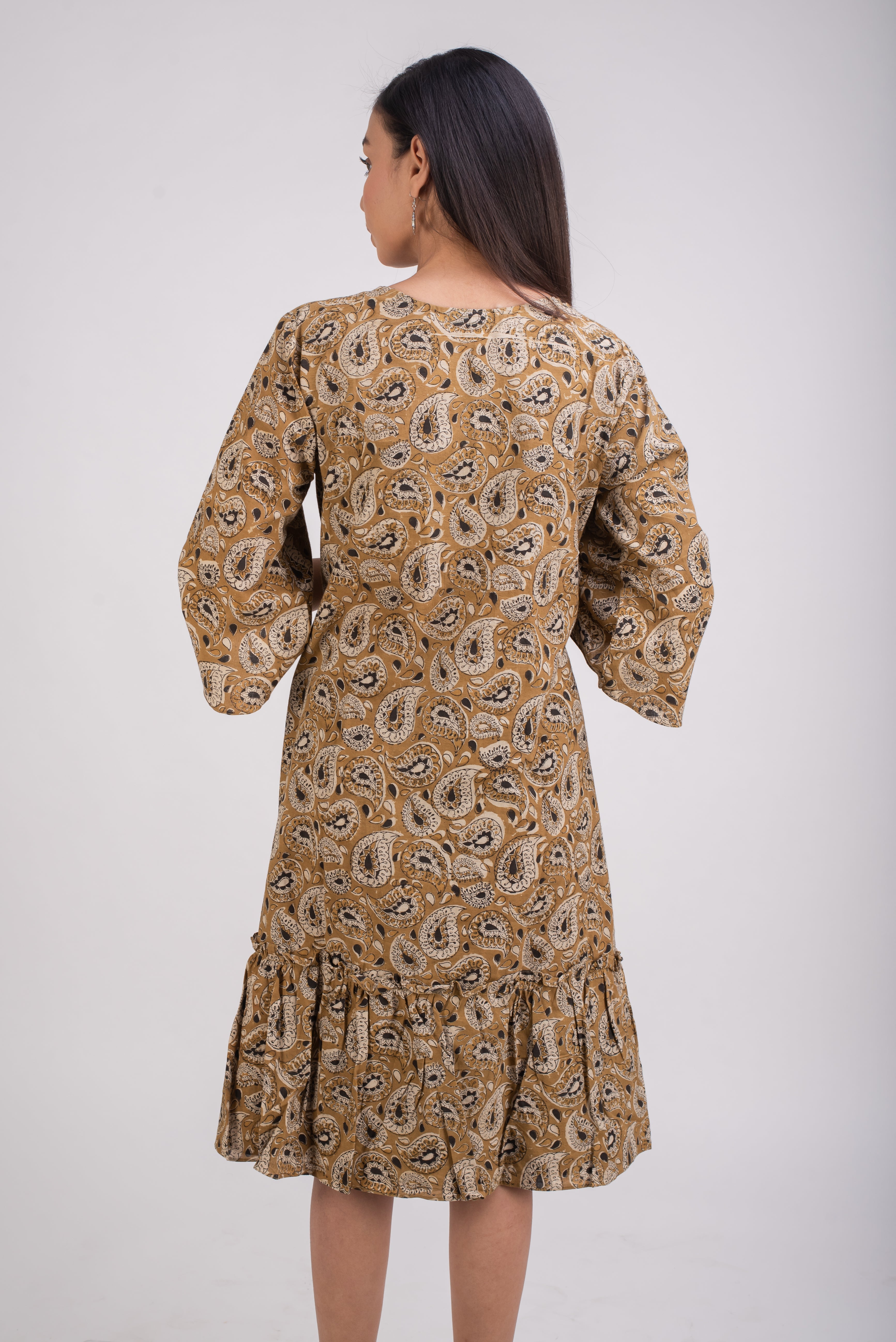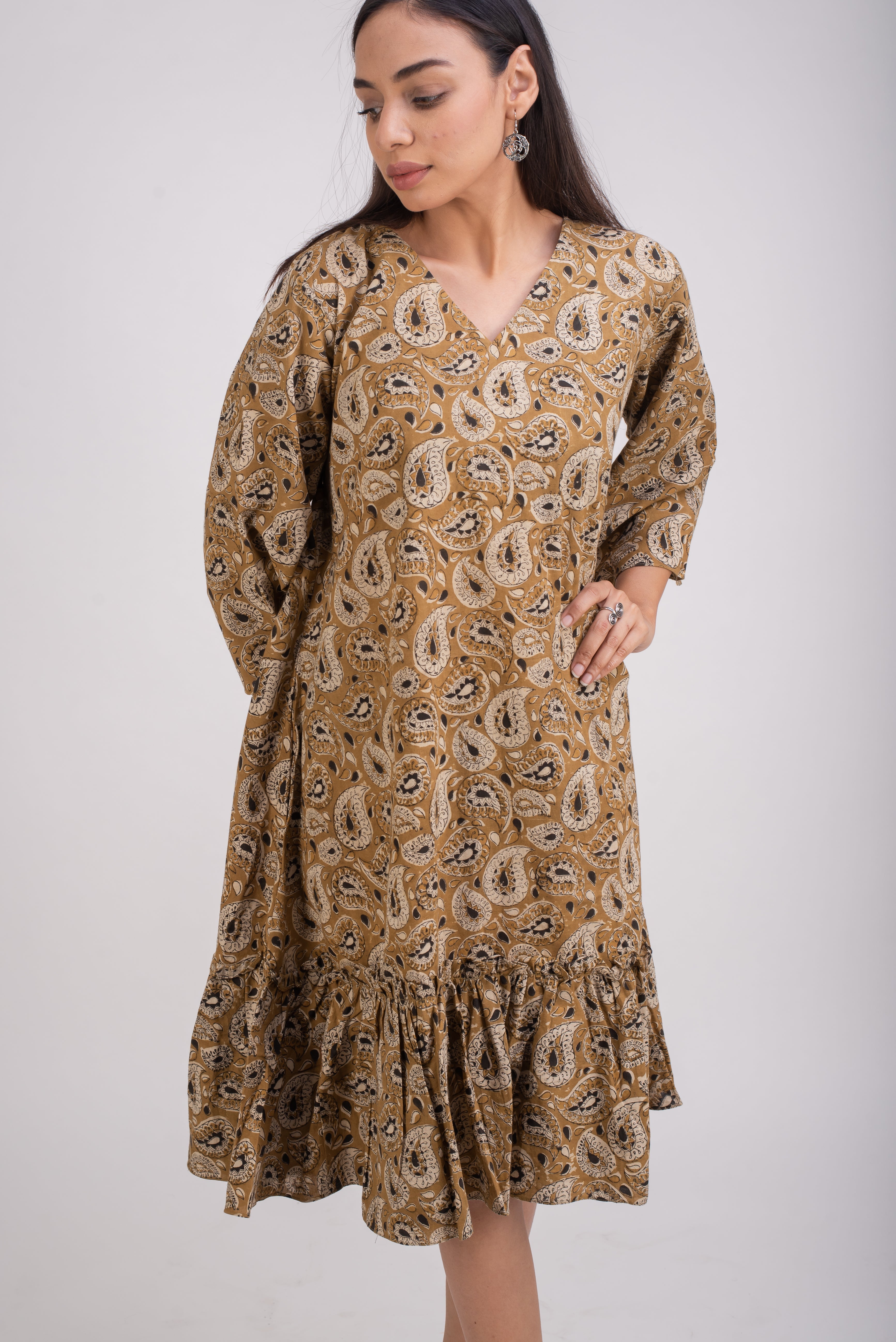 Mustard color floral block printed in vegetable dye is a tribute to kalamkari art of fabric printing. Kalmakari is a traditional art of fabric printing using vegetable dyes. The printing is done using wooden blocks chiseled from teak wood by master craftsmen. This complex and highly skilled art of printing fabric is practiced by certain families in India. Pomegranate peel, iron scrap, turmeric, Jaggrey, salt etc are used to make the vegetable dyes.