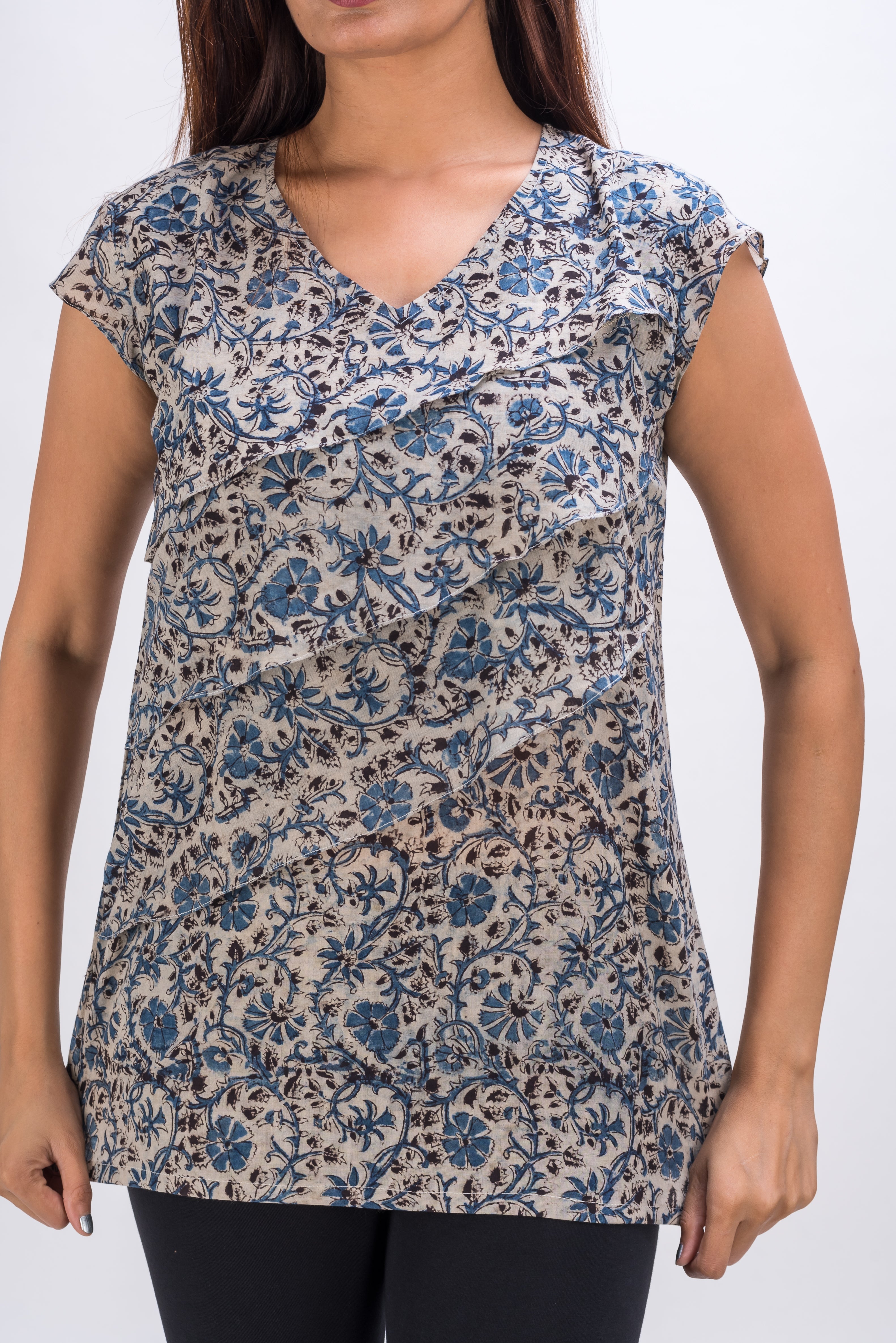 A pleasant off white and blue floral block printed tunic top is made in kalamkari art of fabric printing using indian hog plum and indigo. Kalamkari is a signature art of printing fabric in Andhra Pradesh , India.