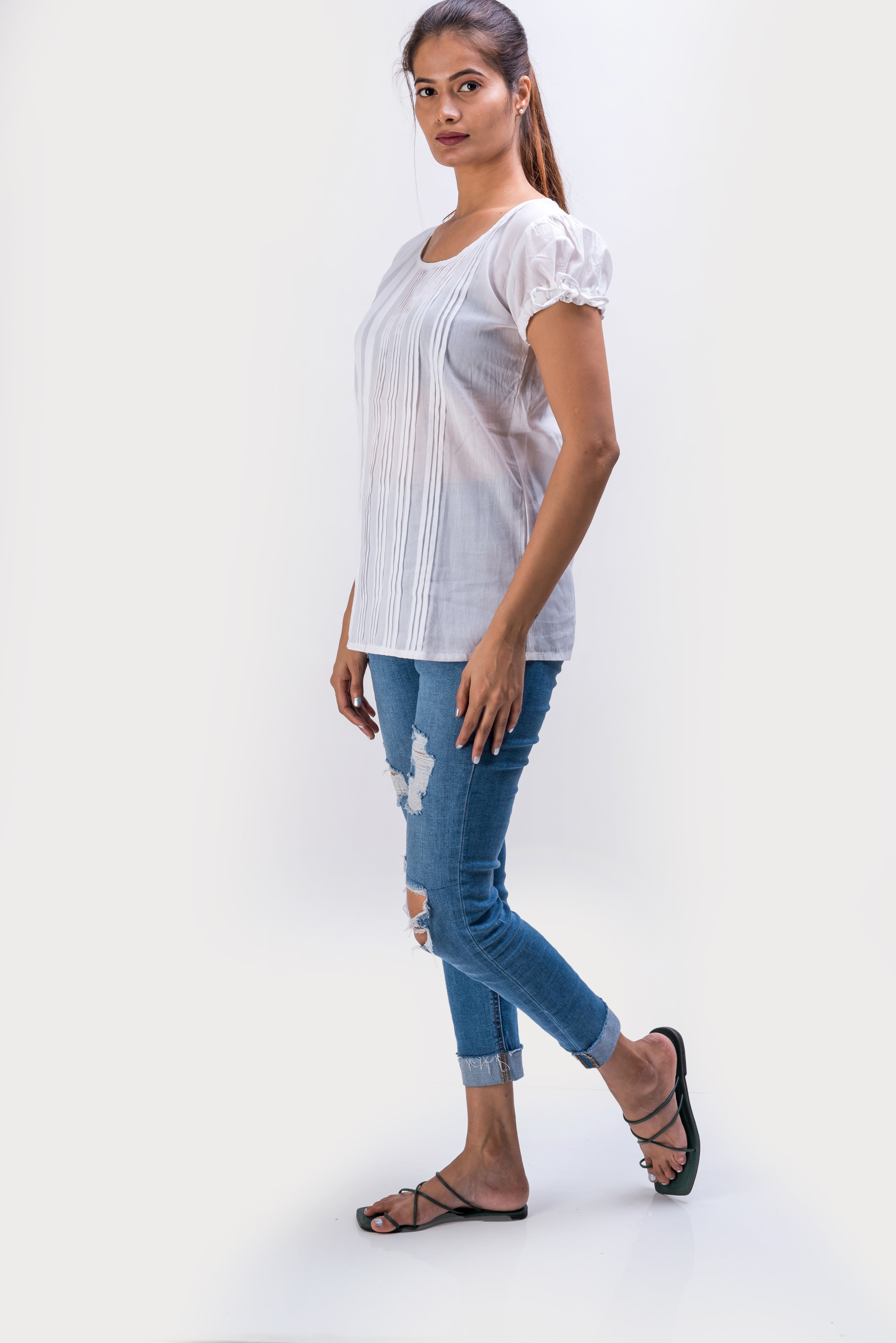 A closet must, simple and elegant white top takes a trendy twist. Dress it up with a skirt or dress down with a pair of jeans. This classic white cotton blouse is a must for a warm summer mornings or a Jazz party night. The adjustable sleeves with a tie will happily take care of the few extras that show up after the cheese cake disappears!