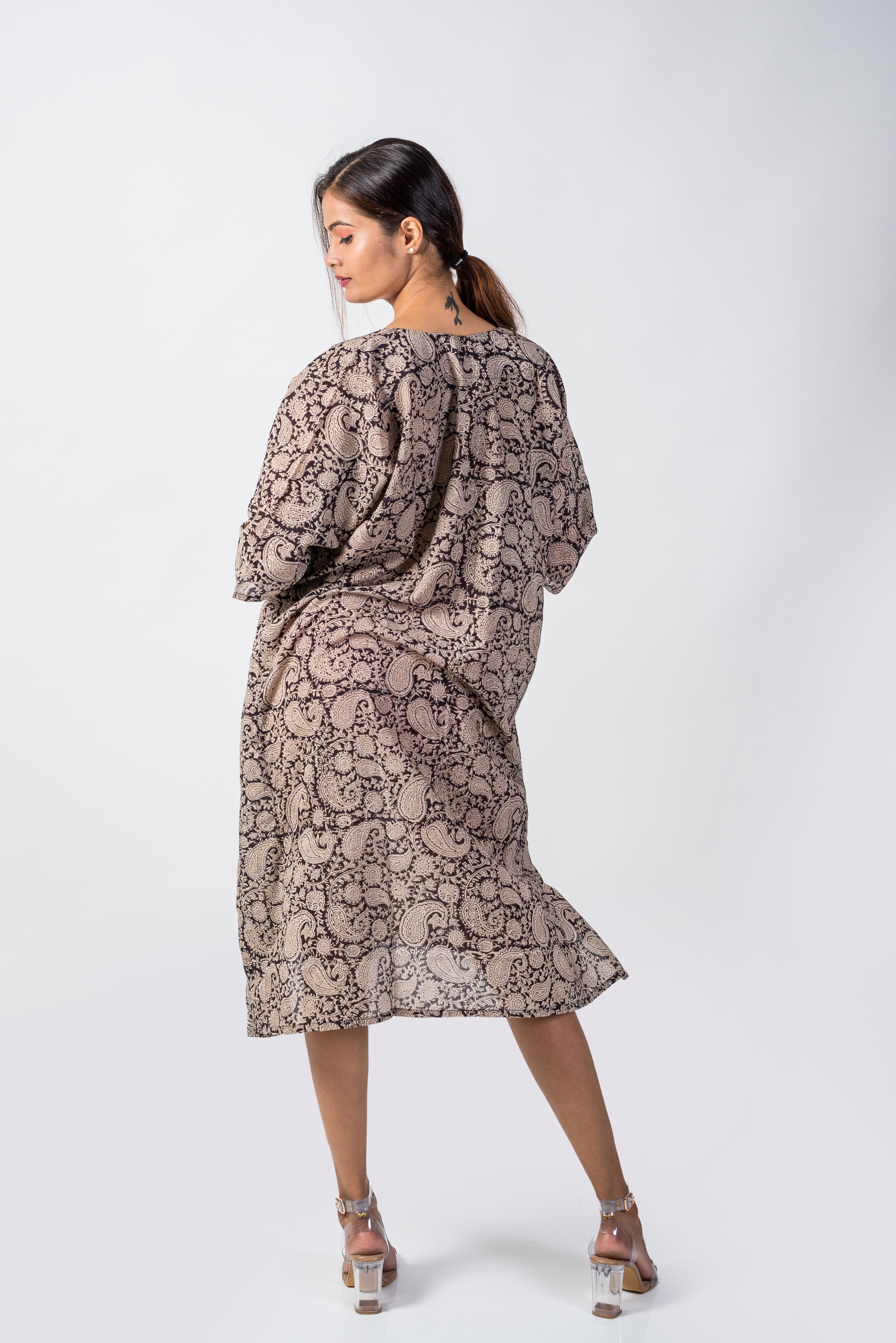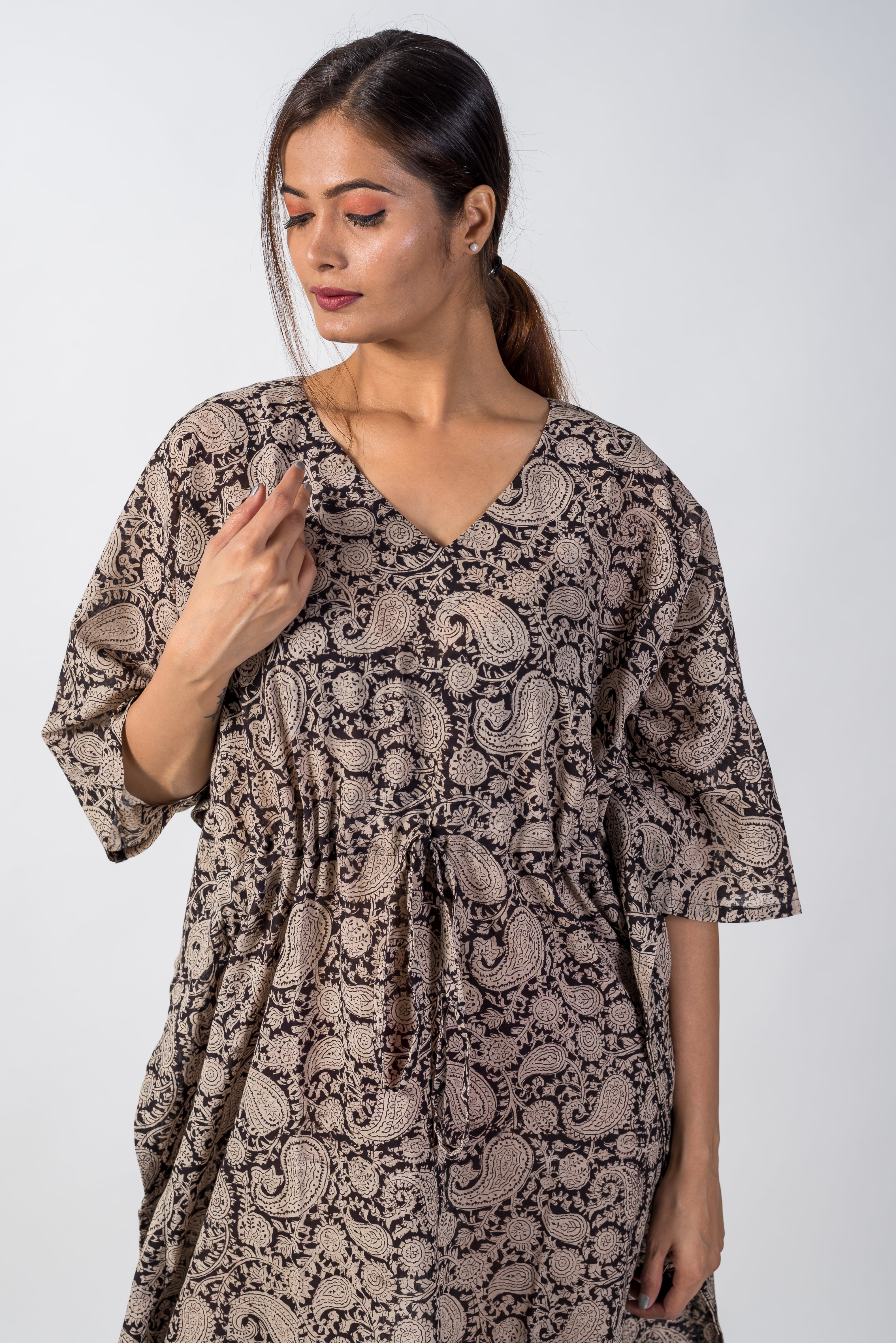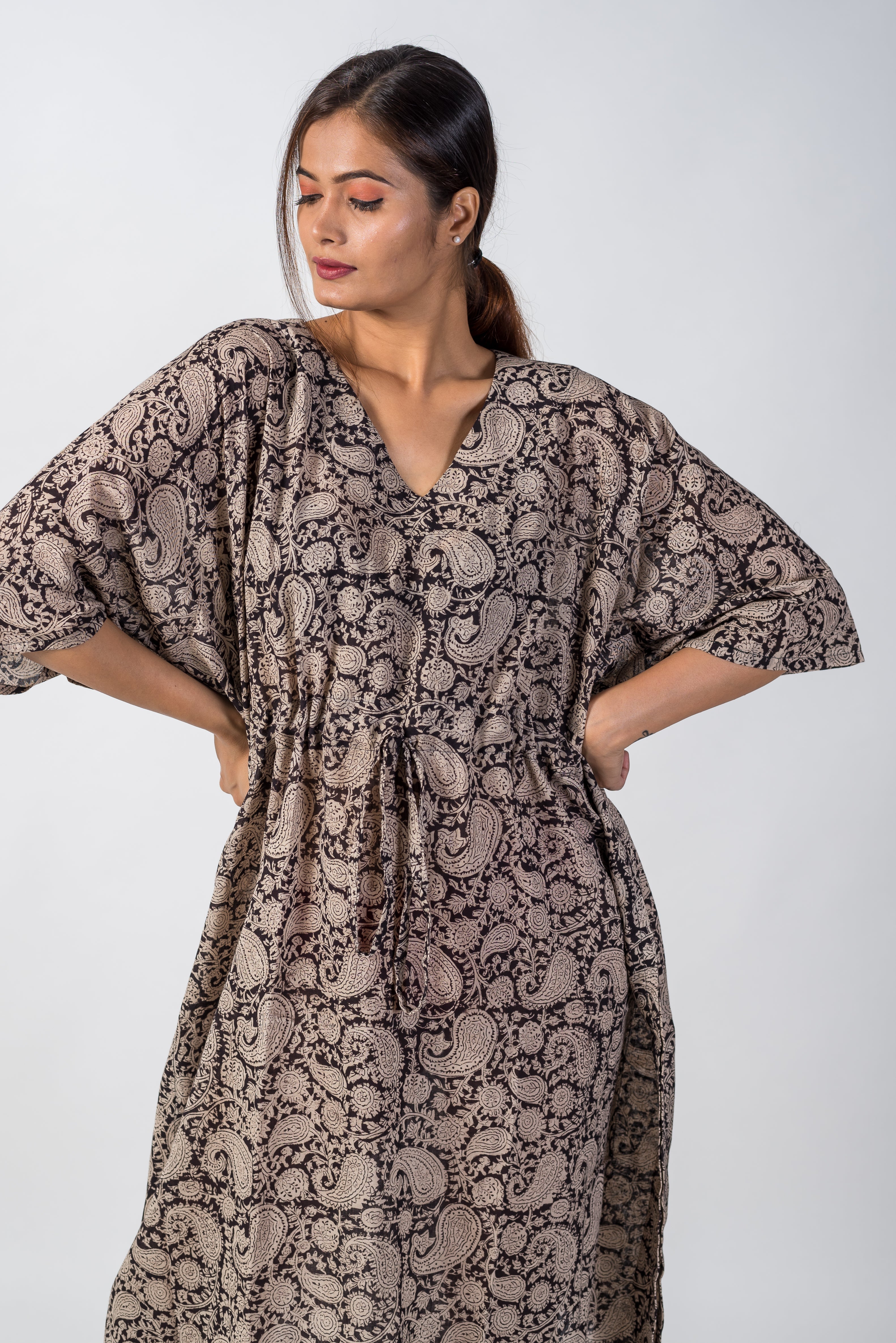 Wear this romantic free size kaftan at a restaurant or at the beach. extremely soft cotton calf length kaftan is a treat to your body and soul.