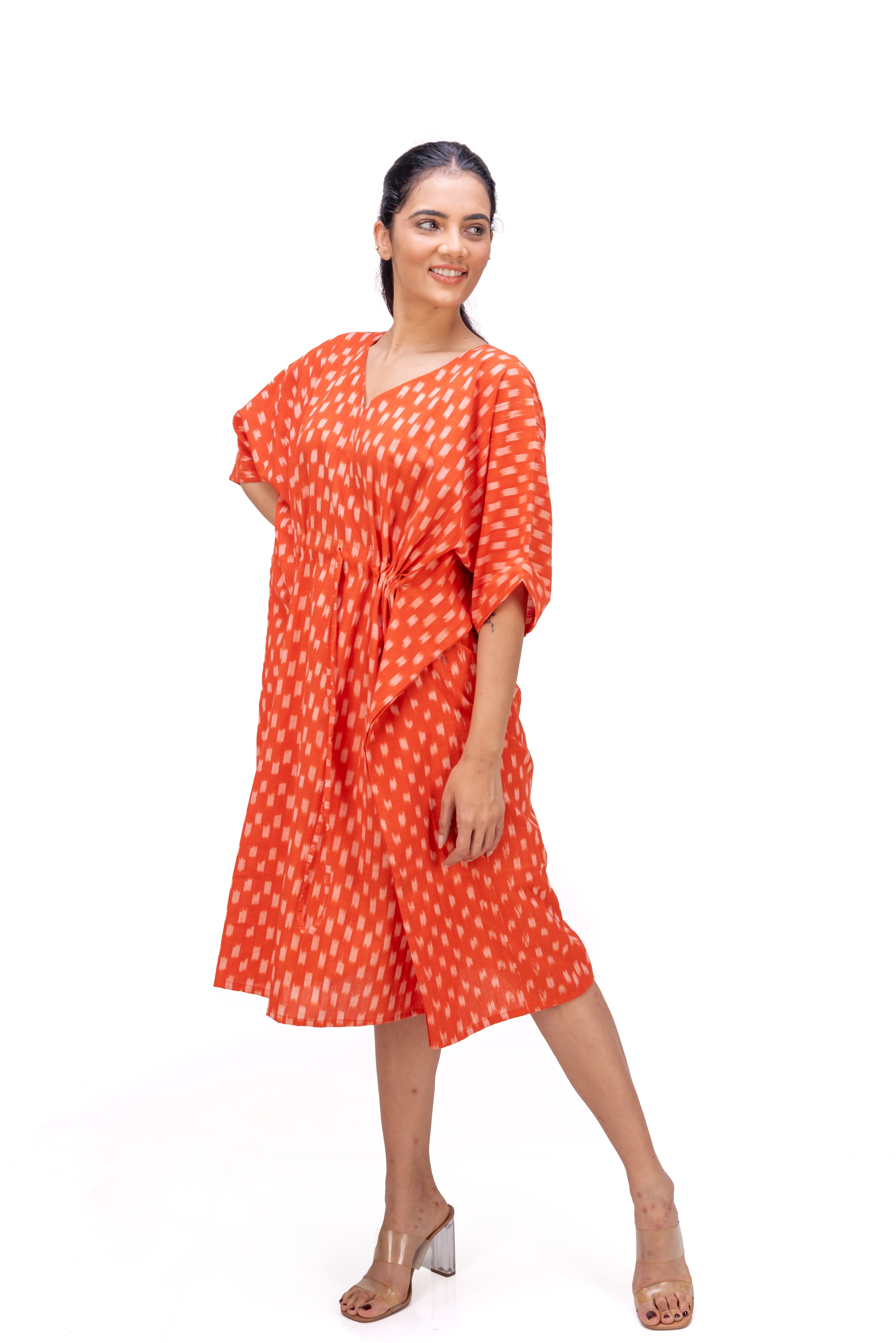 Kaftan is made in breathable hand loomed fabric called Ikat. The threads are hand dyed before being woven into elegant patterns. Ikat a signature art of making fabric in India.