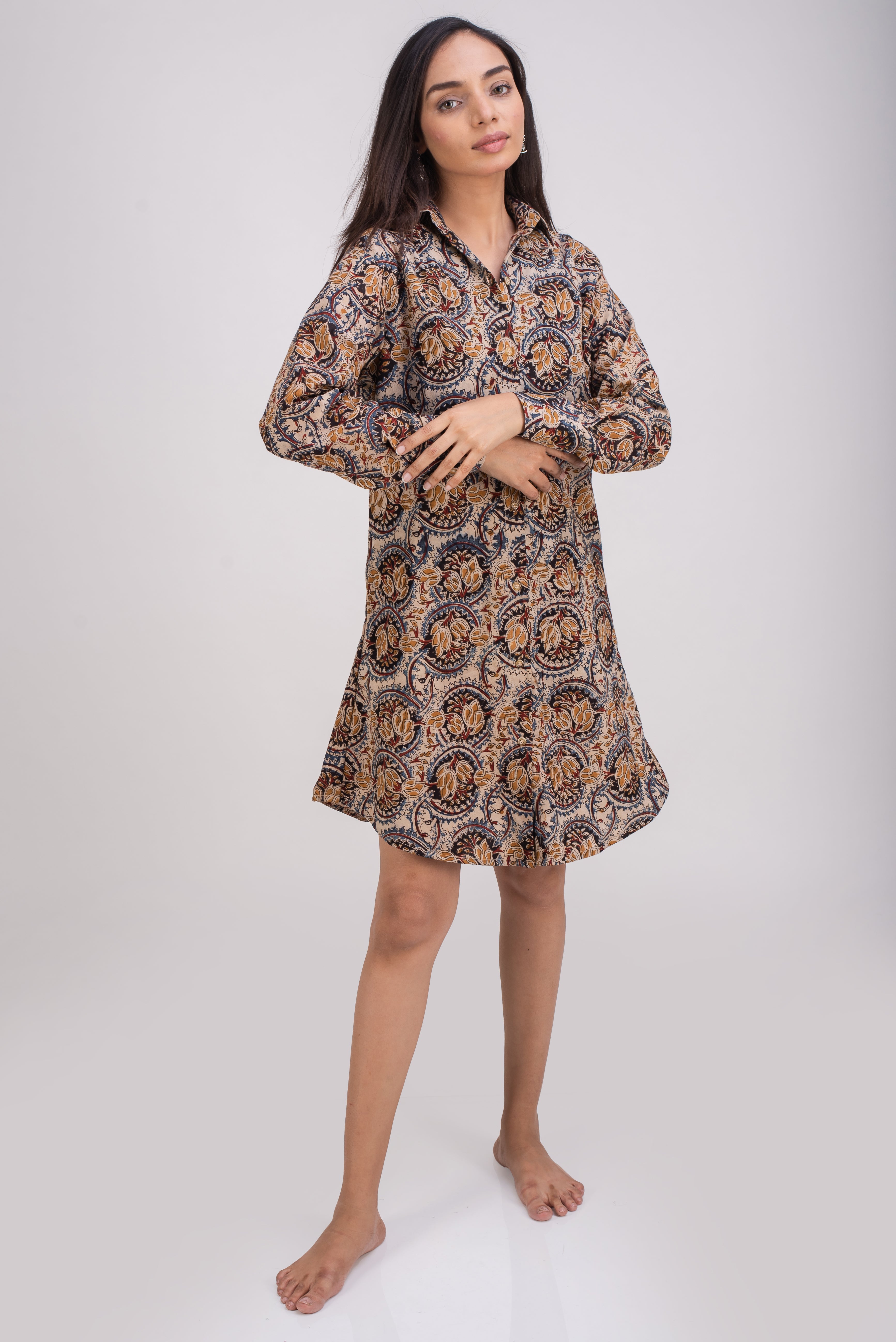 Art comes to life in this purest indigo tunic top. This fabric is made in Kalamkari art form of fabric printing. A signature fabric of Telangana, India.