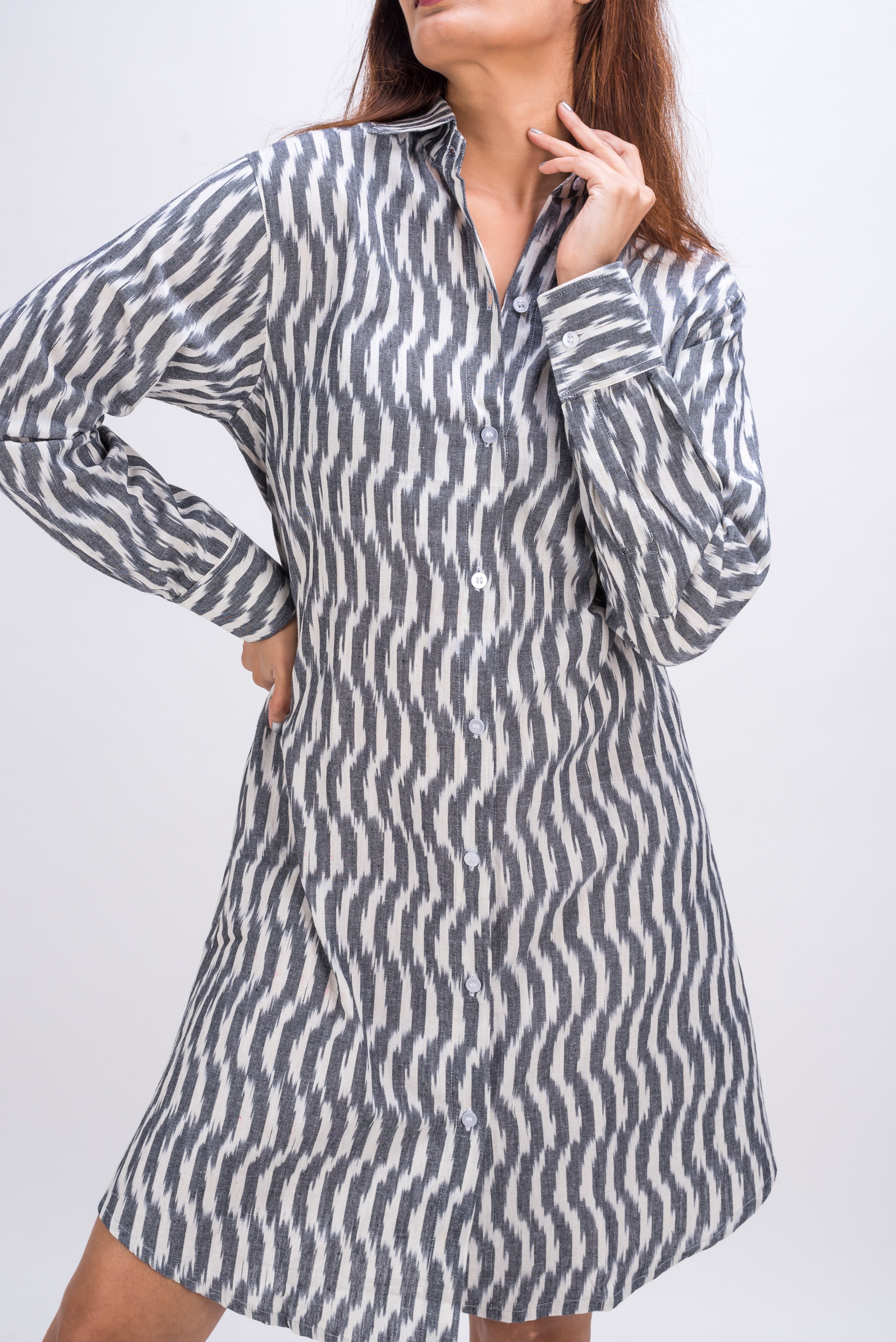 White and blue colored Shirt top is made in breathable hand loomed fabric called Ikat. The threads are hand dyed before being woven into elegant patterns. Ikat is a signature art of making fabric in Telangana, India.