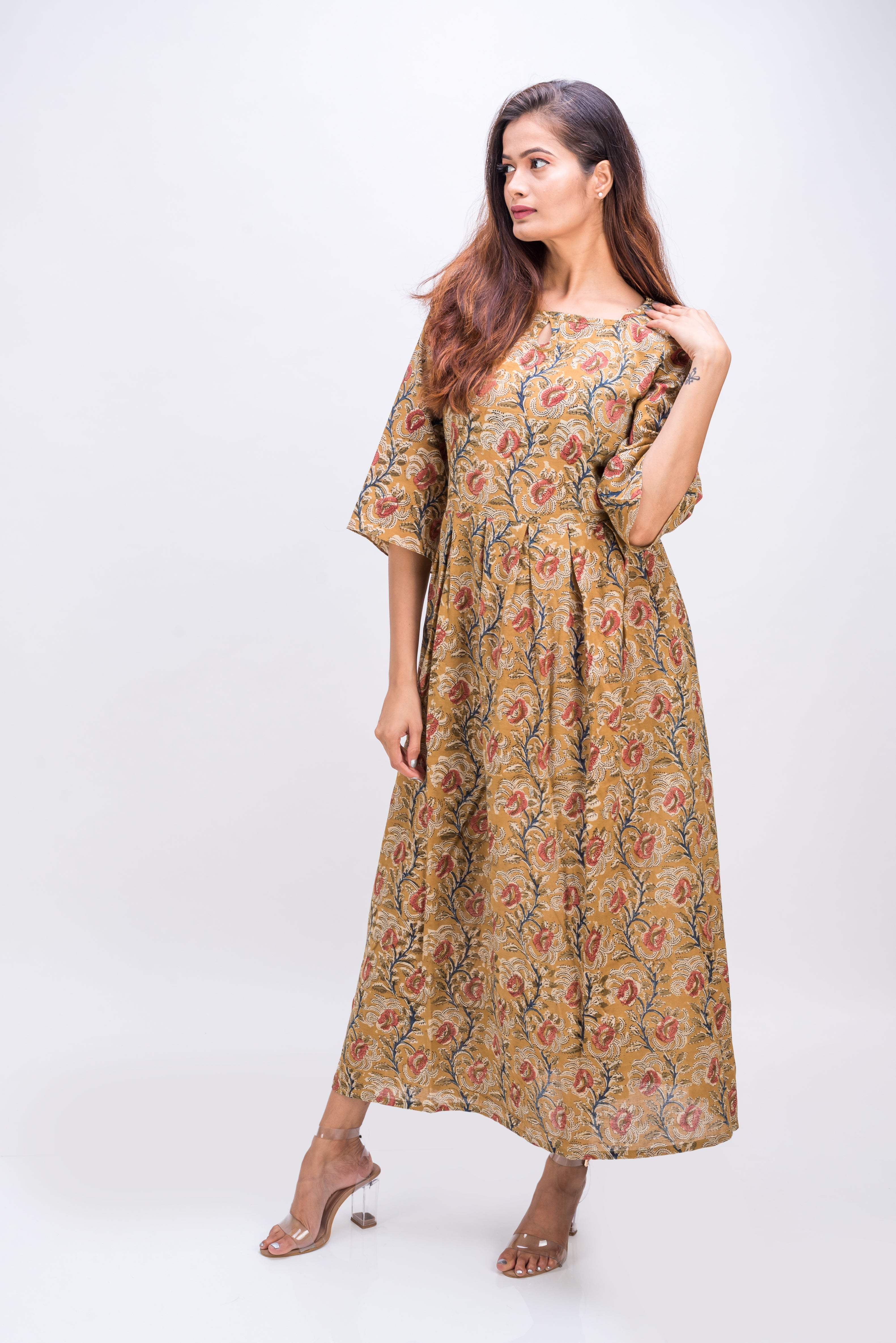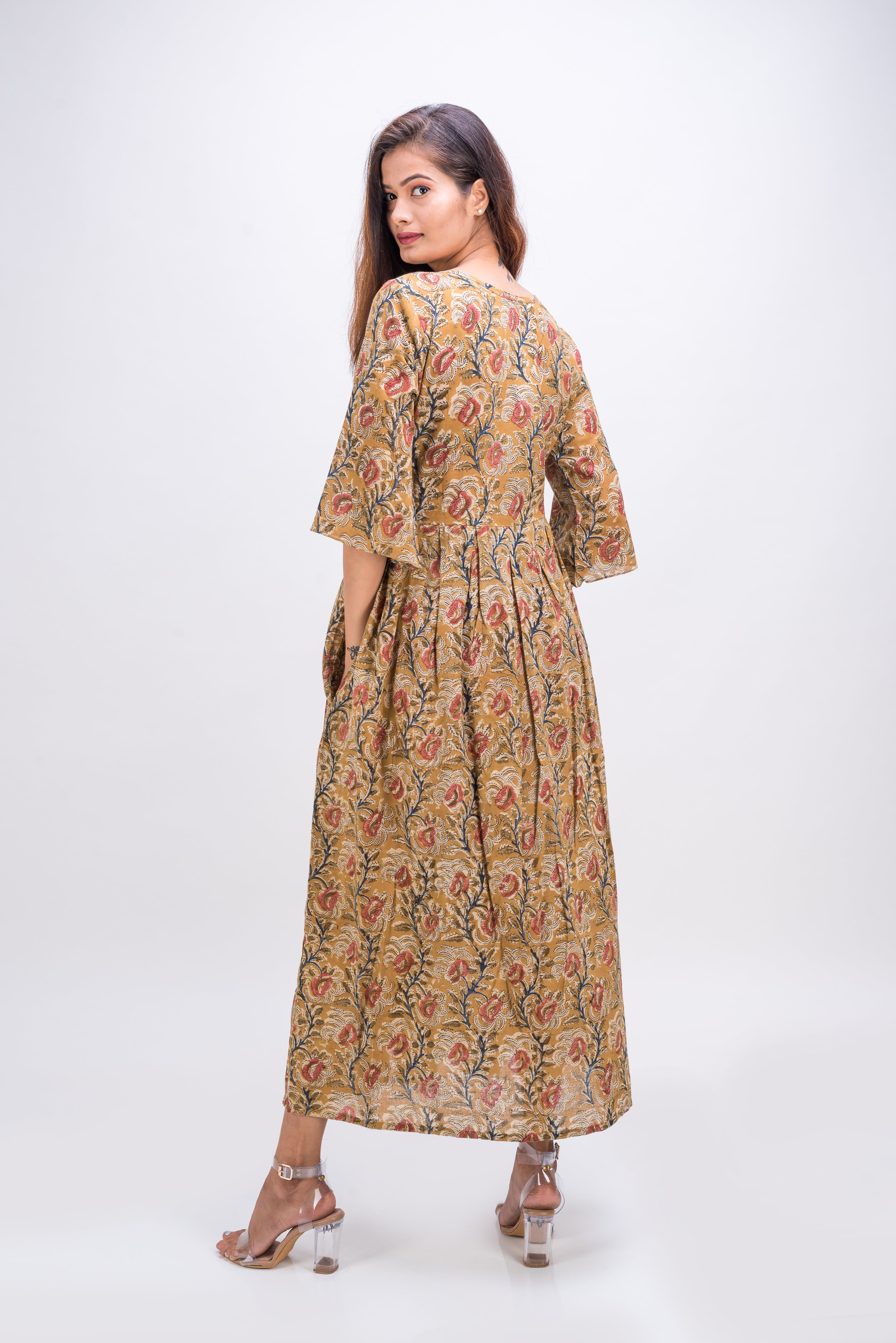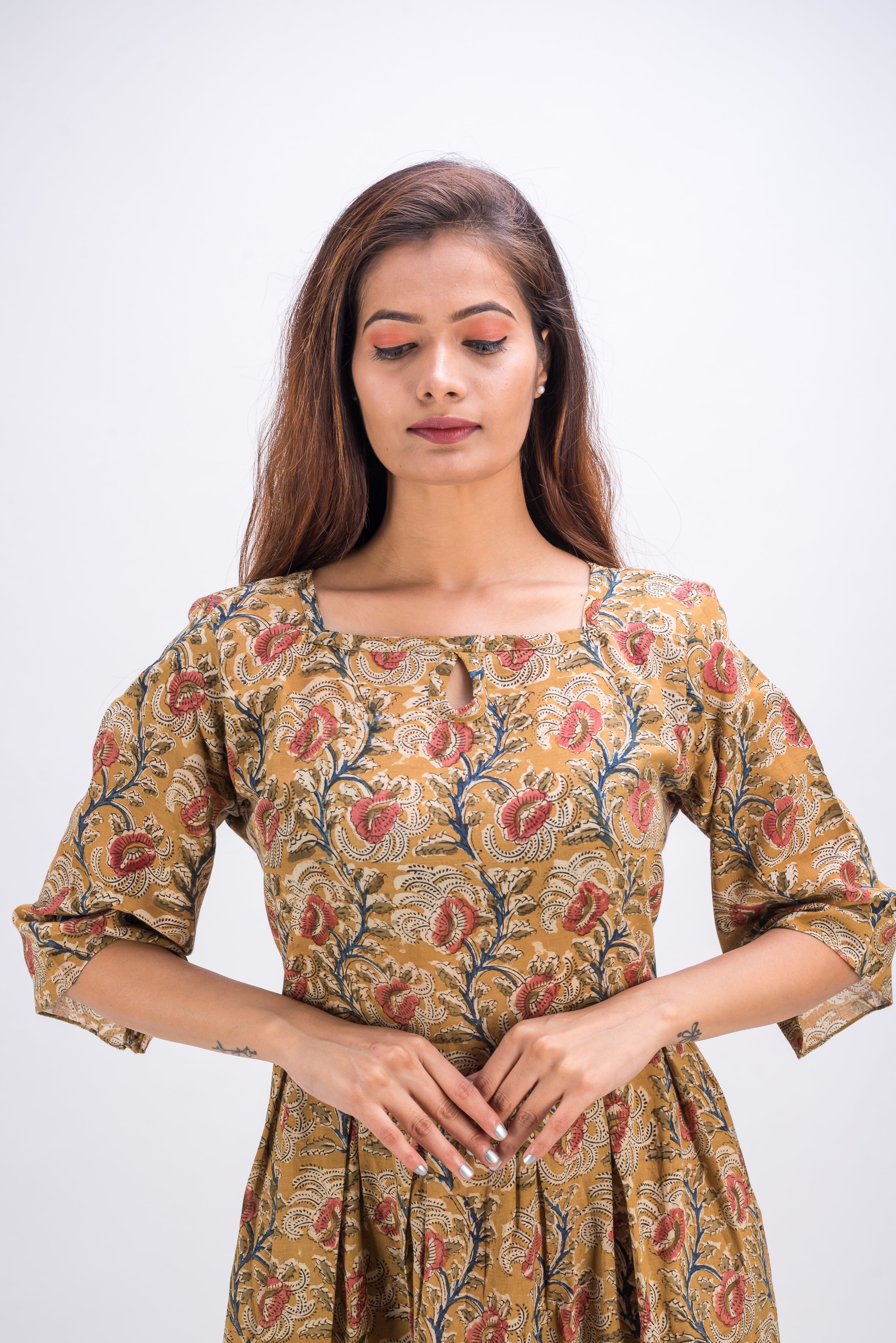 Mustard floral block printed fabric in vegetable dye is a tribute to Kalamkari art of fabric printing. A complex form of fabric printing practiced in Andhra Pradesh India. The printing is done using wooden blocks chiseled from teak wood by master craftsmen. Pomegranate peel, iron scrap, turmeric, Jaggrey, salt etc are used to make the vegetable dyes. The printed fabric is washed in the flowing waters of river Krishna and sun dried.