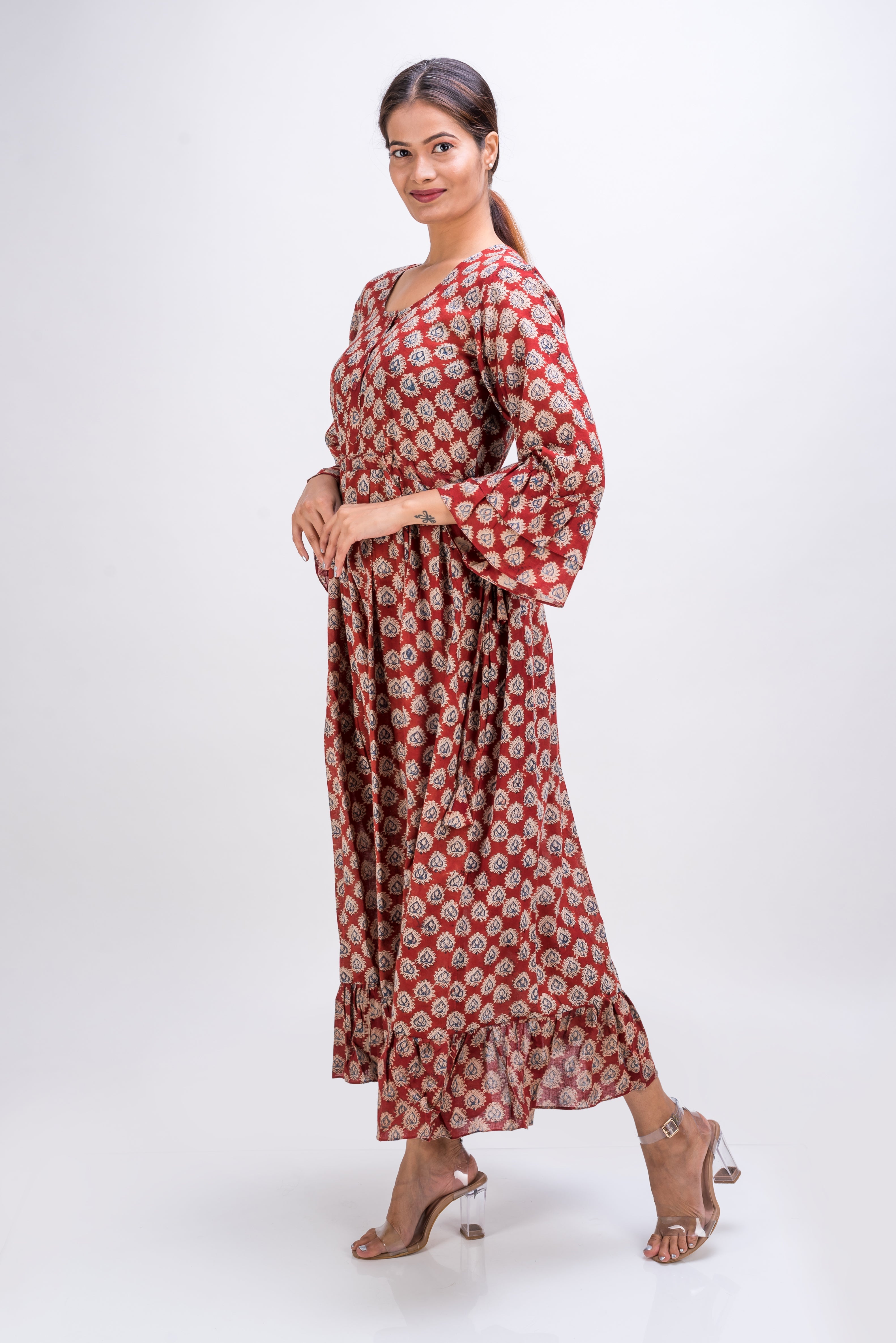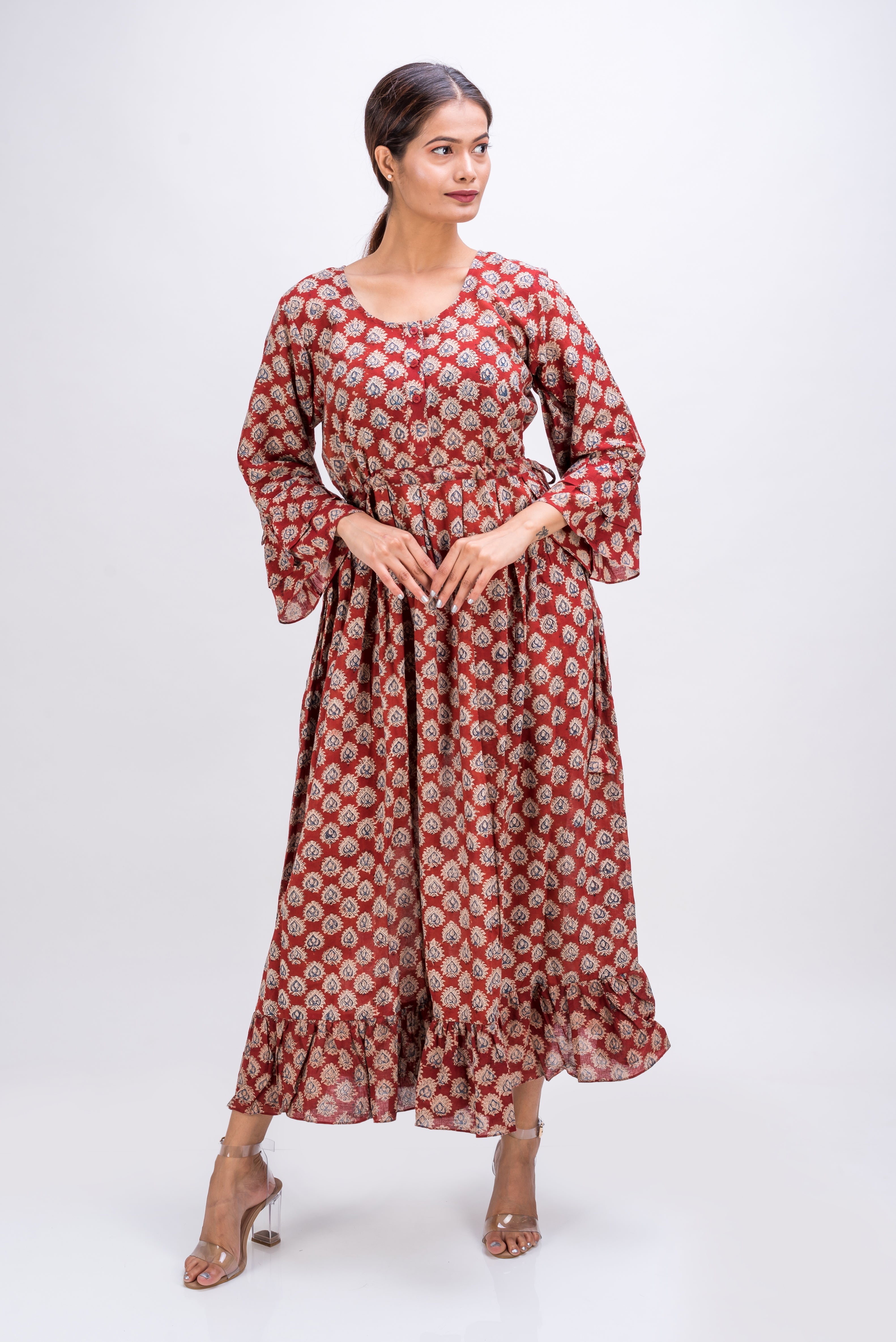 light weight red Motif block printed fabric in vegetable dye on a soft mulmul fabric is a tribute to Kalamkari art of fabric printing. A complex form of fabric printing practiced in Andhra Pradesh India. The printing is done using wooden blocks chiseled from teak wood by master craftsmen. Pomegranate peel, iron scrap, turmeric, Jaggrey, salt etc are used to make the vegetable dyes. The printed fabric is washed in the flowing waters of river Krishna and sun dried.
