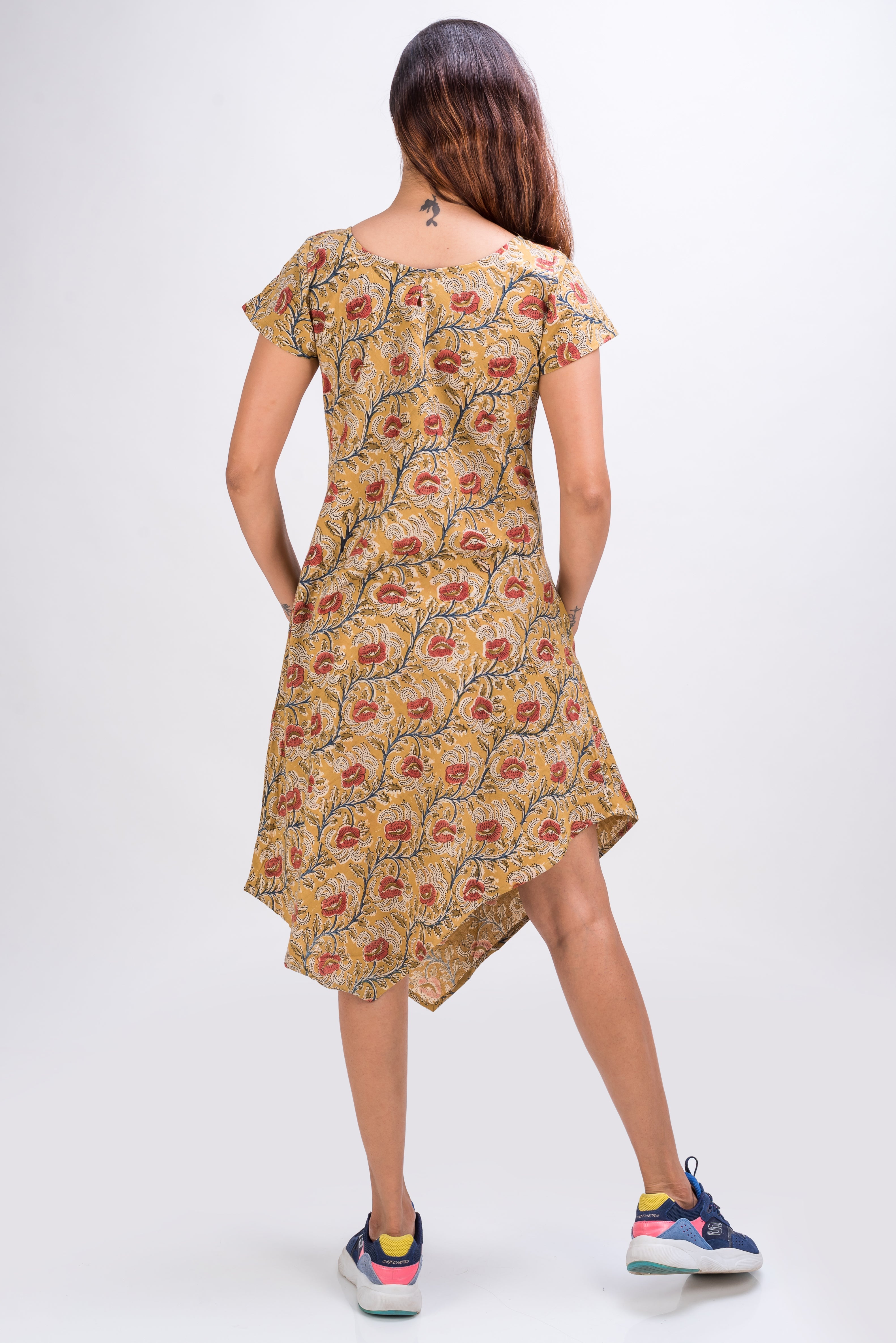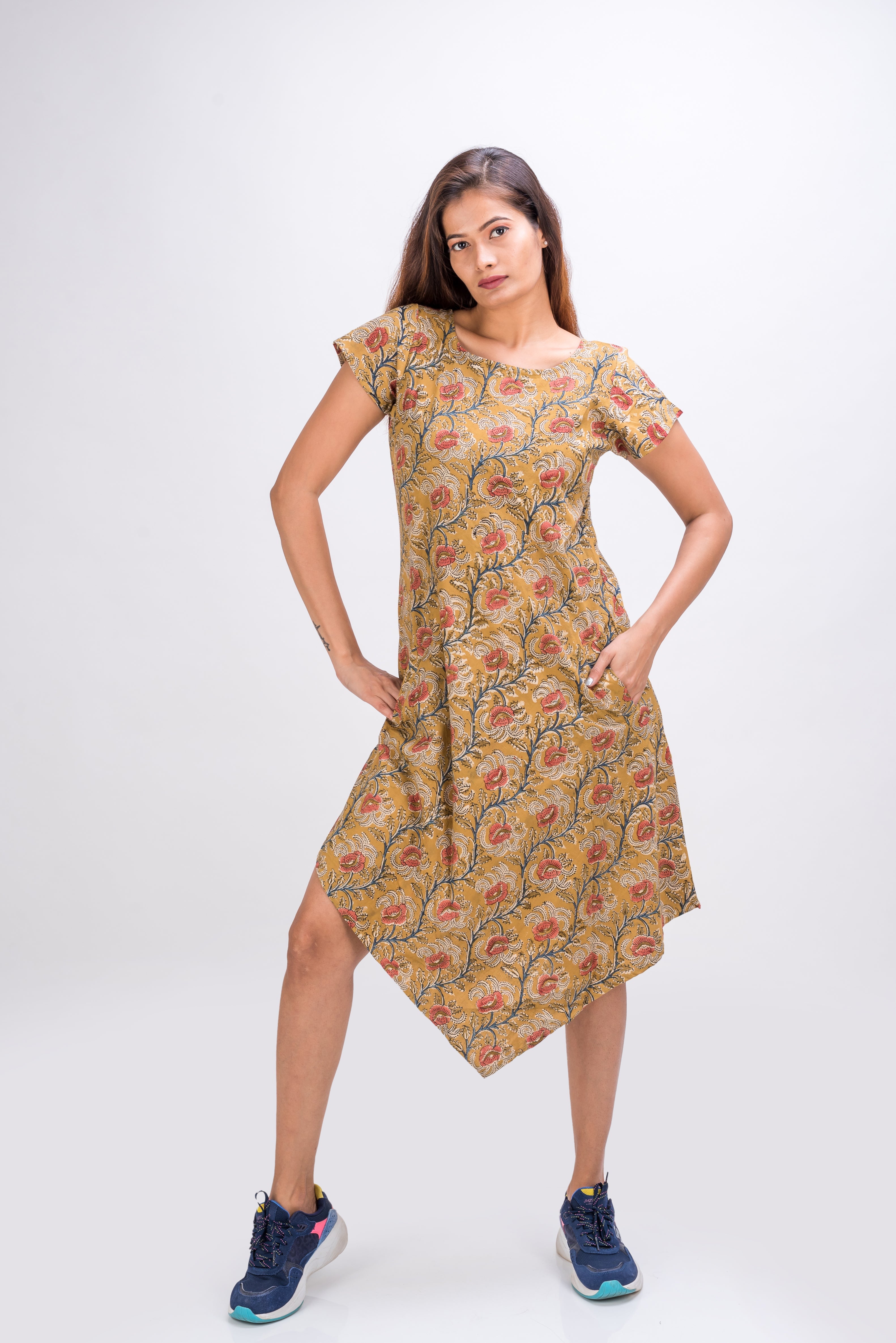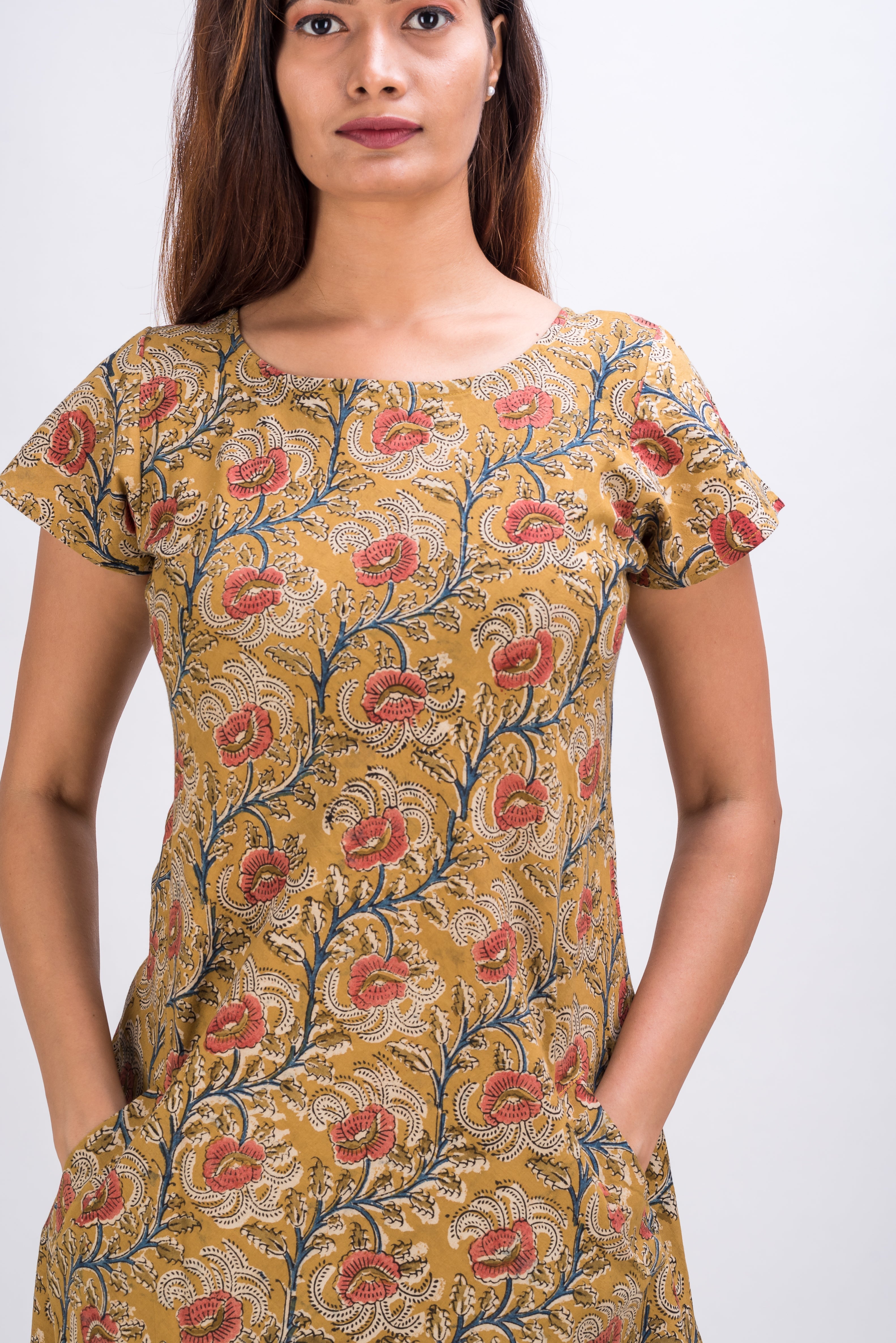 Mustard and pink floral block printed fabric in vegetable dye on a soft cotton fabric is a tribute to Kalamkari art of fabric printing. A complex form of fabric printing practiced in Andhra Pradesh India. The printing is done using wooden blocks chiseled from teak wood by master craftsmen. Pomegranate peel, iron scrap, turmeric, Jaggrey, salt etc are used to make the vegetable dyes. The printed fabric is washed in the flowing waters of river Krishna and sun dried.