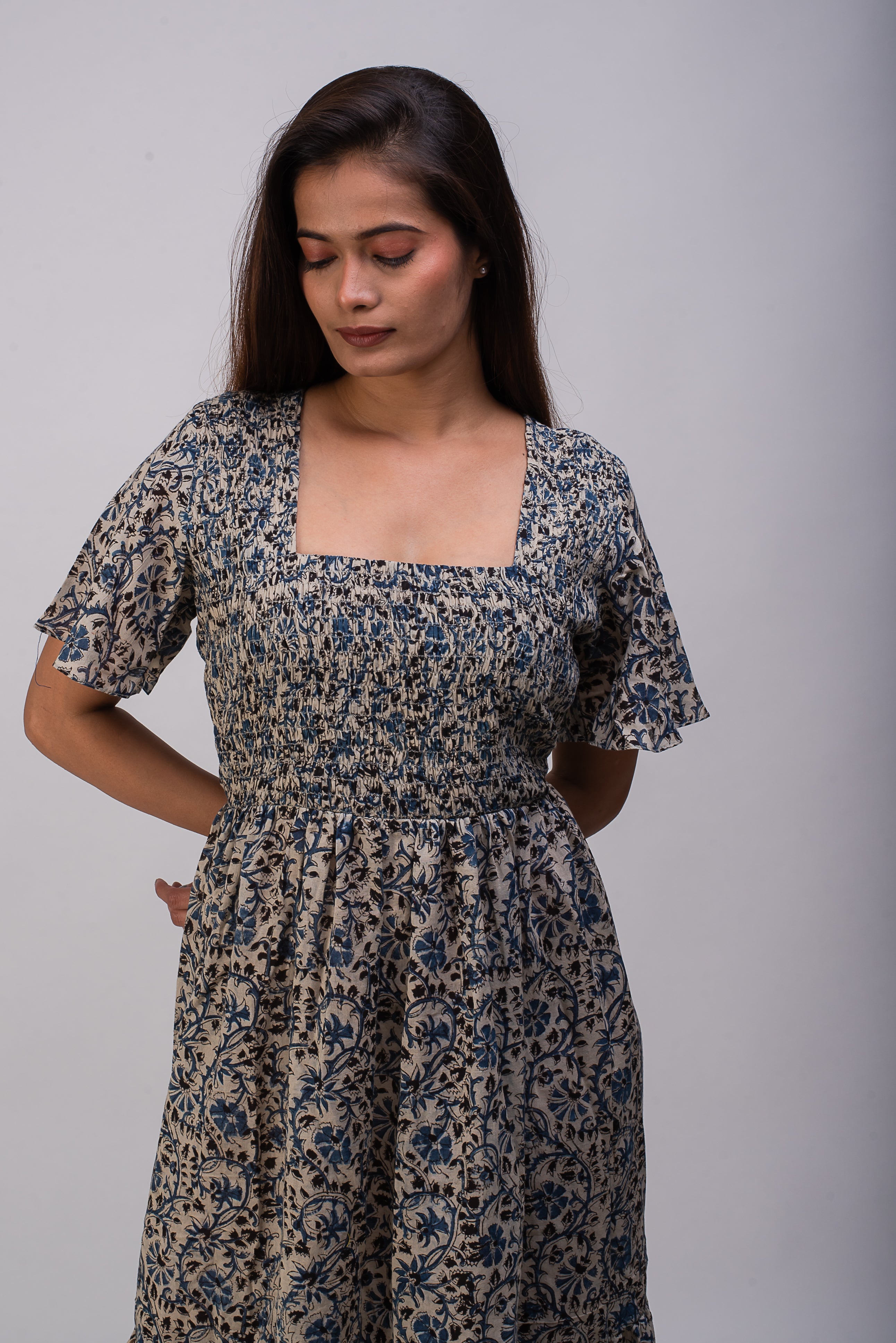 The light breezy mulmul fabric is block printed in indigo in kalamkari art form of fabric printing.