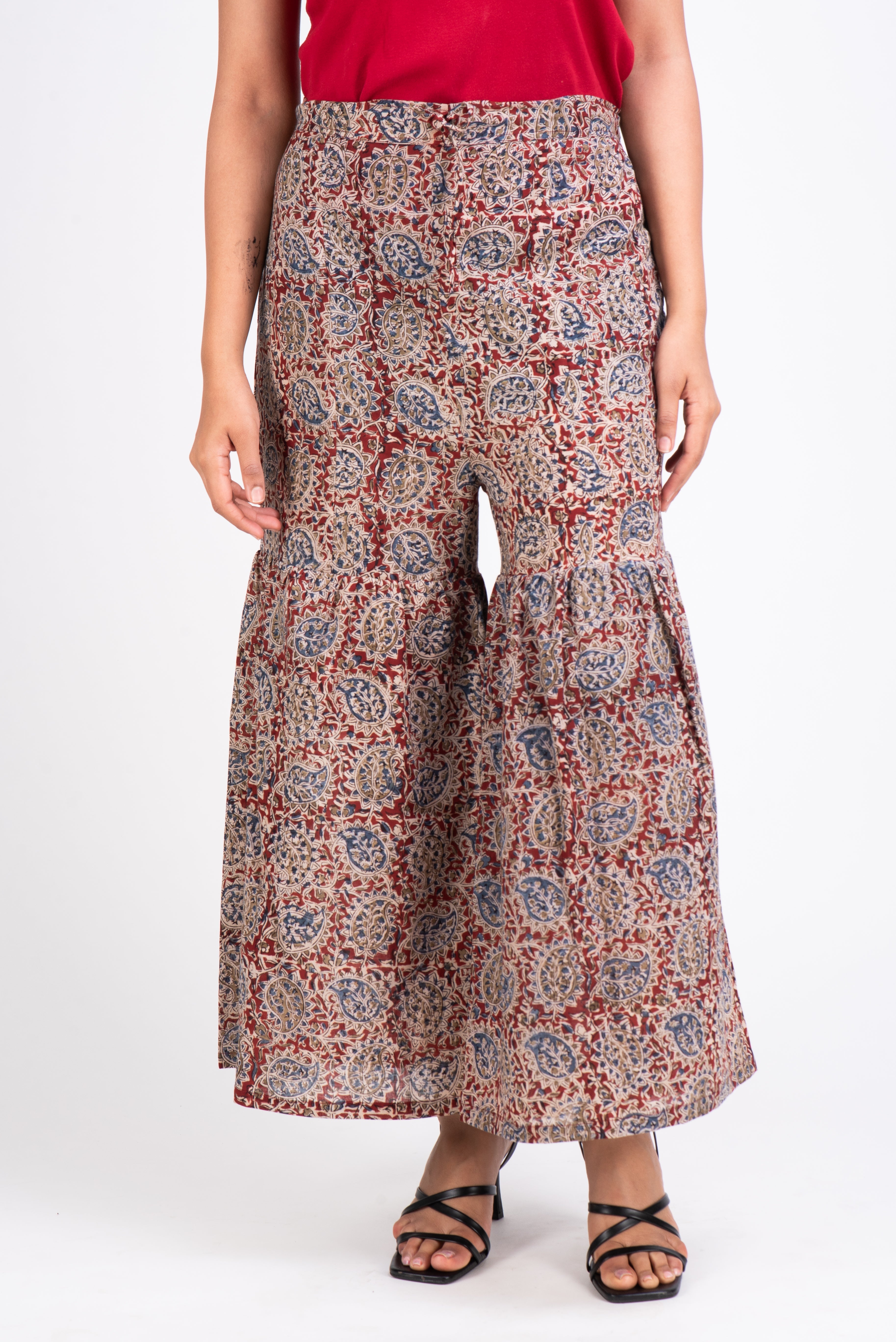 Kalamkari is a complex form of fabric printing practiced in Andhra Pradesh India. The printing is done using wooden blocks chiseled from teak wood by master craftsmen. Pomegranate peel, iron scrap, turmeric, Jaggrey, salt etc are used to make the vegetable dyes. The printed fabric is washed in the flowing waters of river Krishna and sun dried.