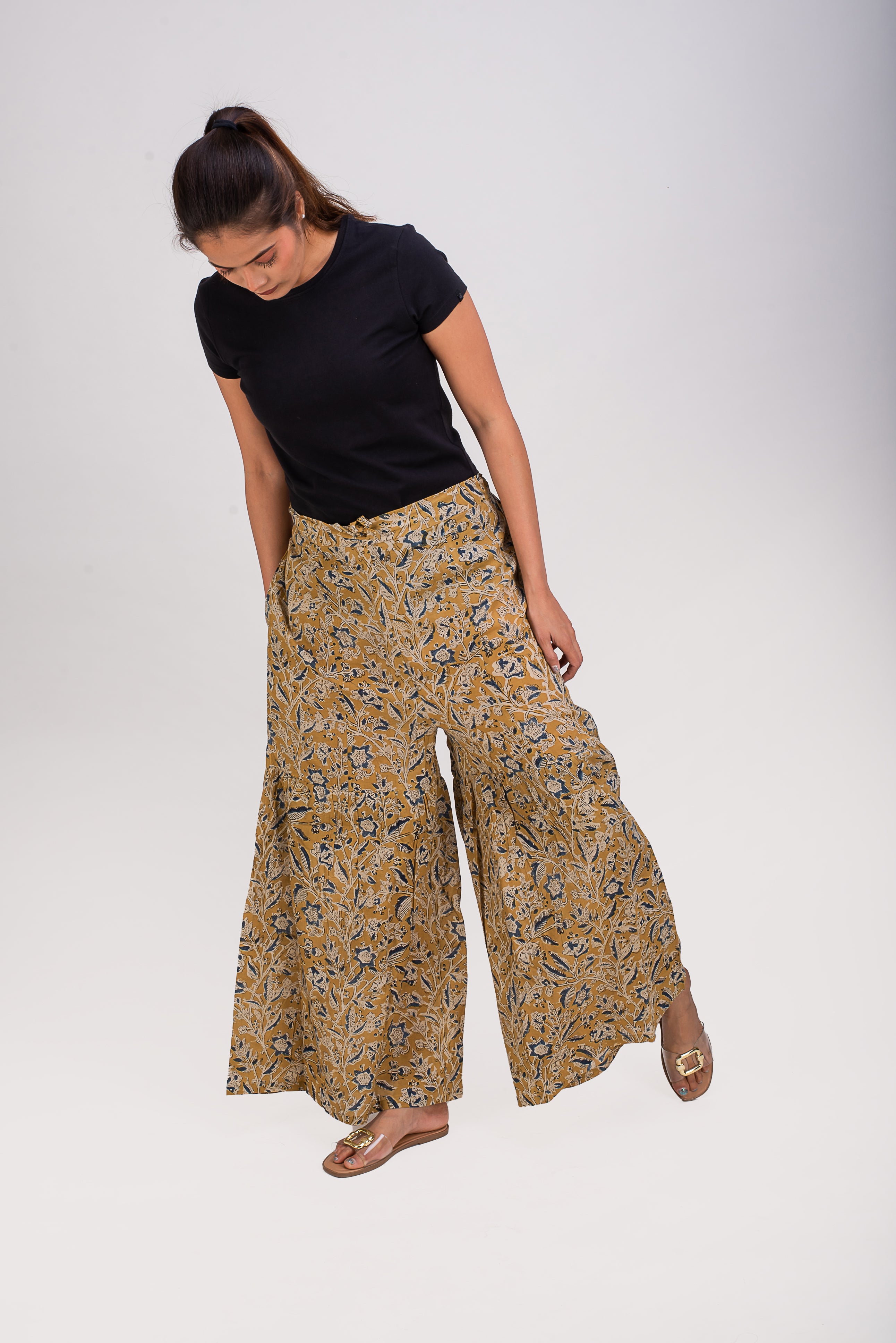 Explore your adventure side, looking elegant and feminine in this comfortable pants. Stylish and elegant flared pants with gathers at the knee are inspired by skirt pants. This stylish pant has an adjustable elastic waist with draw string.