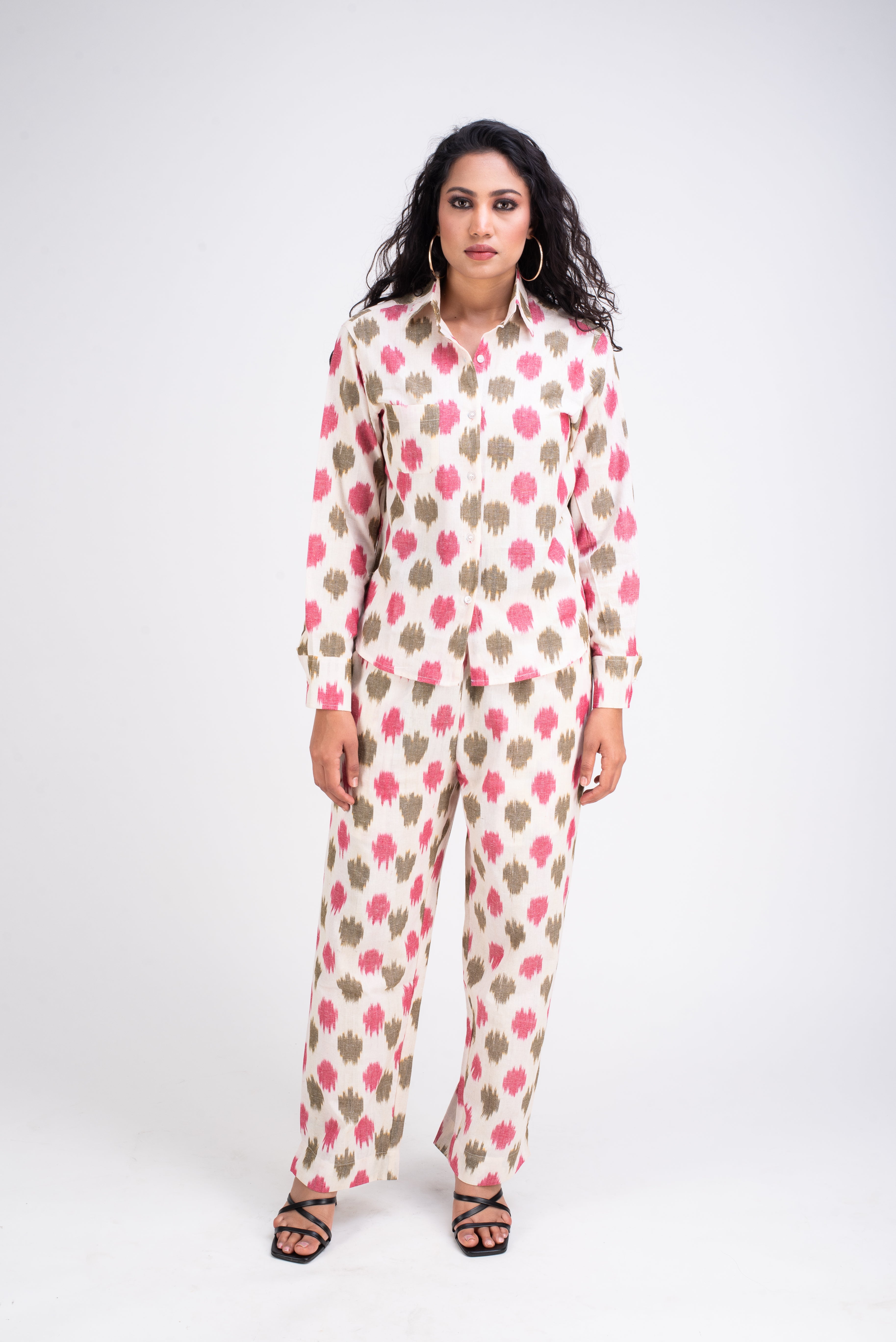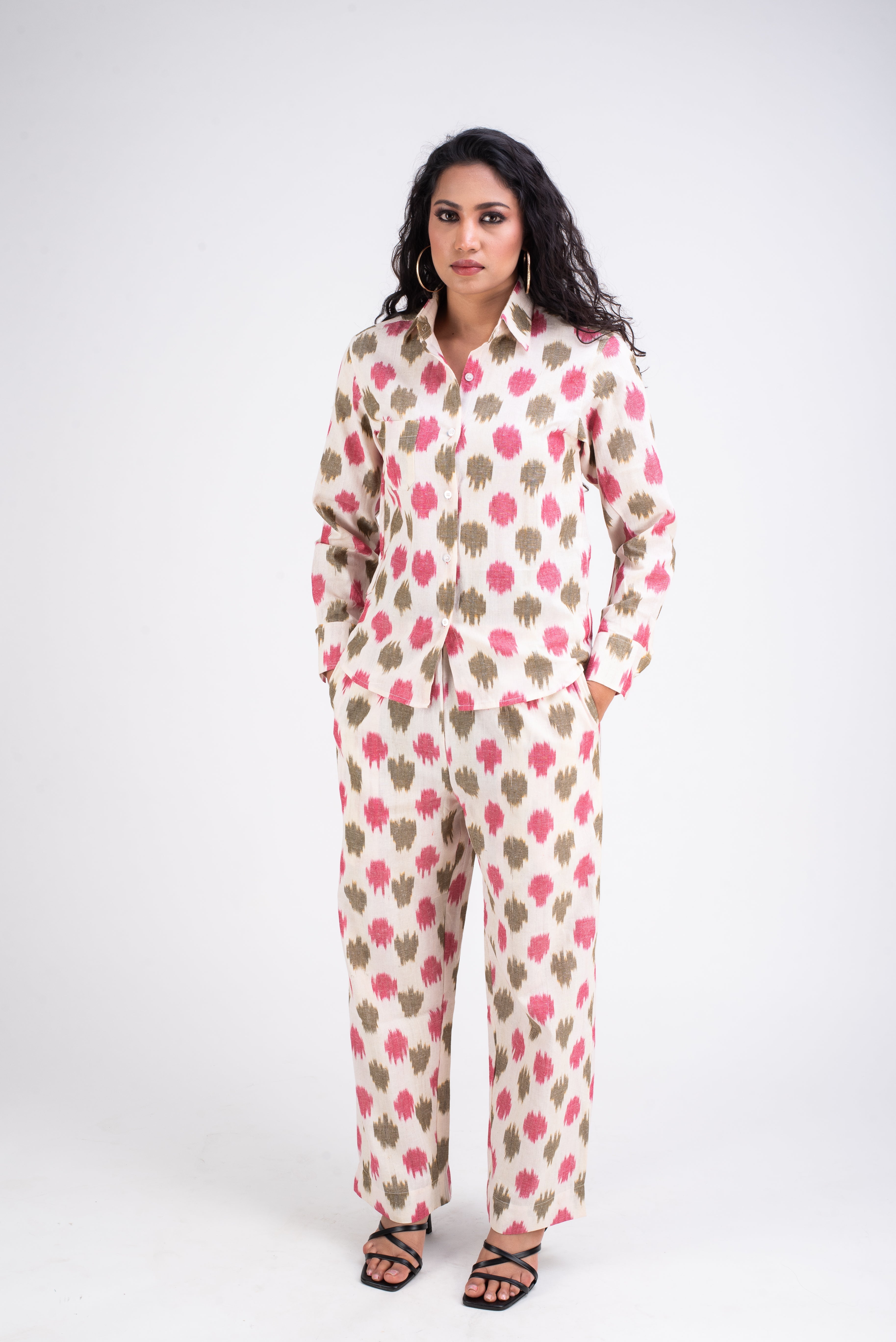 Pair them with solid T-shirt for casual look or as coordinates for a formal look. White and Pink coords is made in breathable hand loomed fabric called Ikat. The threads are hand dyed before being woven into elegant patterns. Ikat a signature art of making fabric in India.