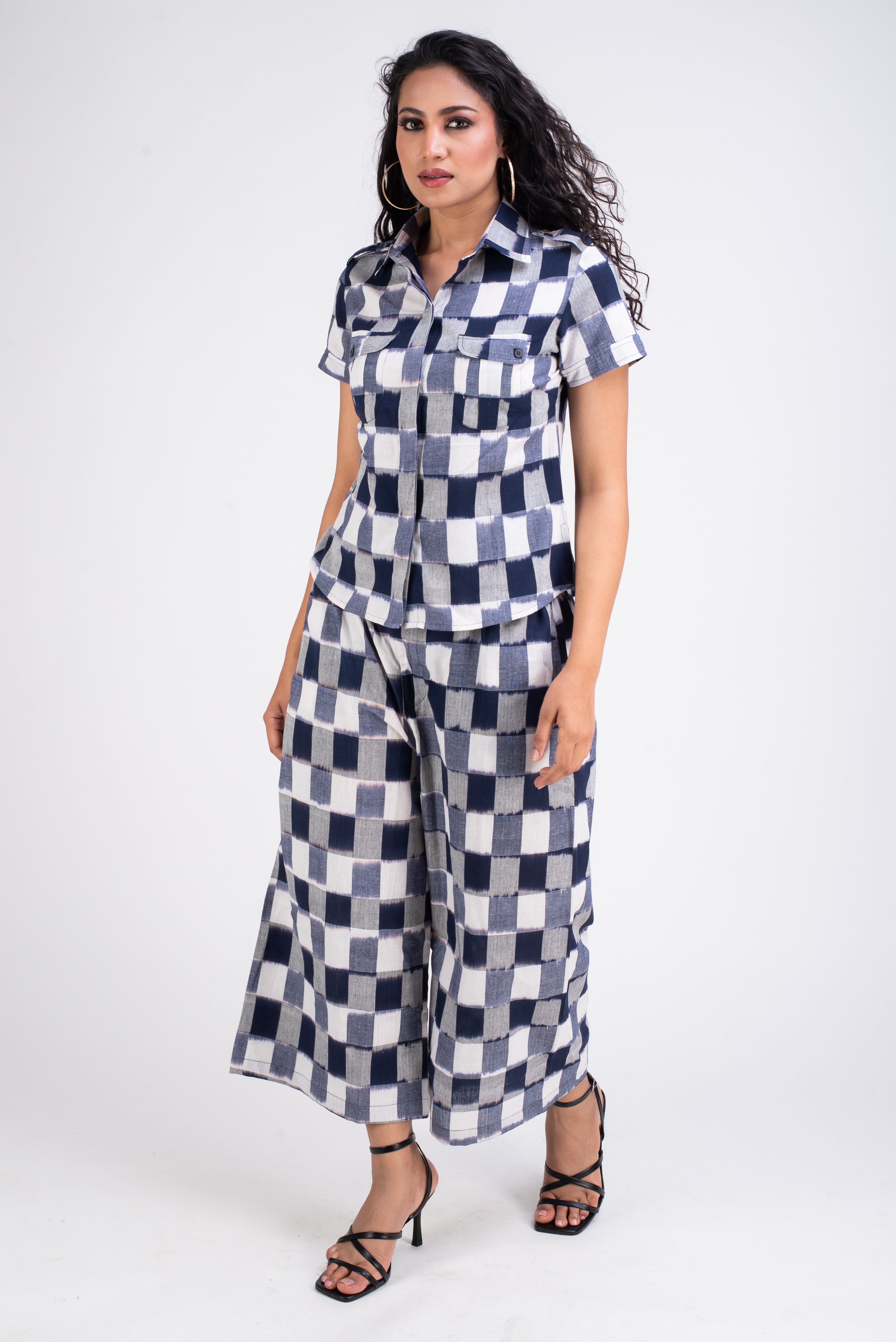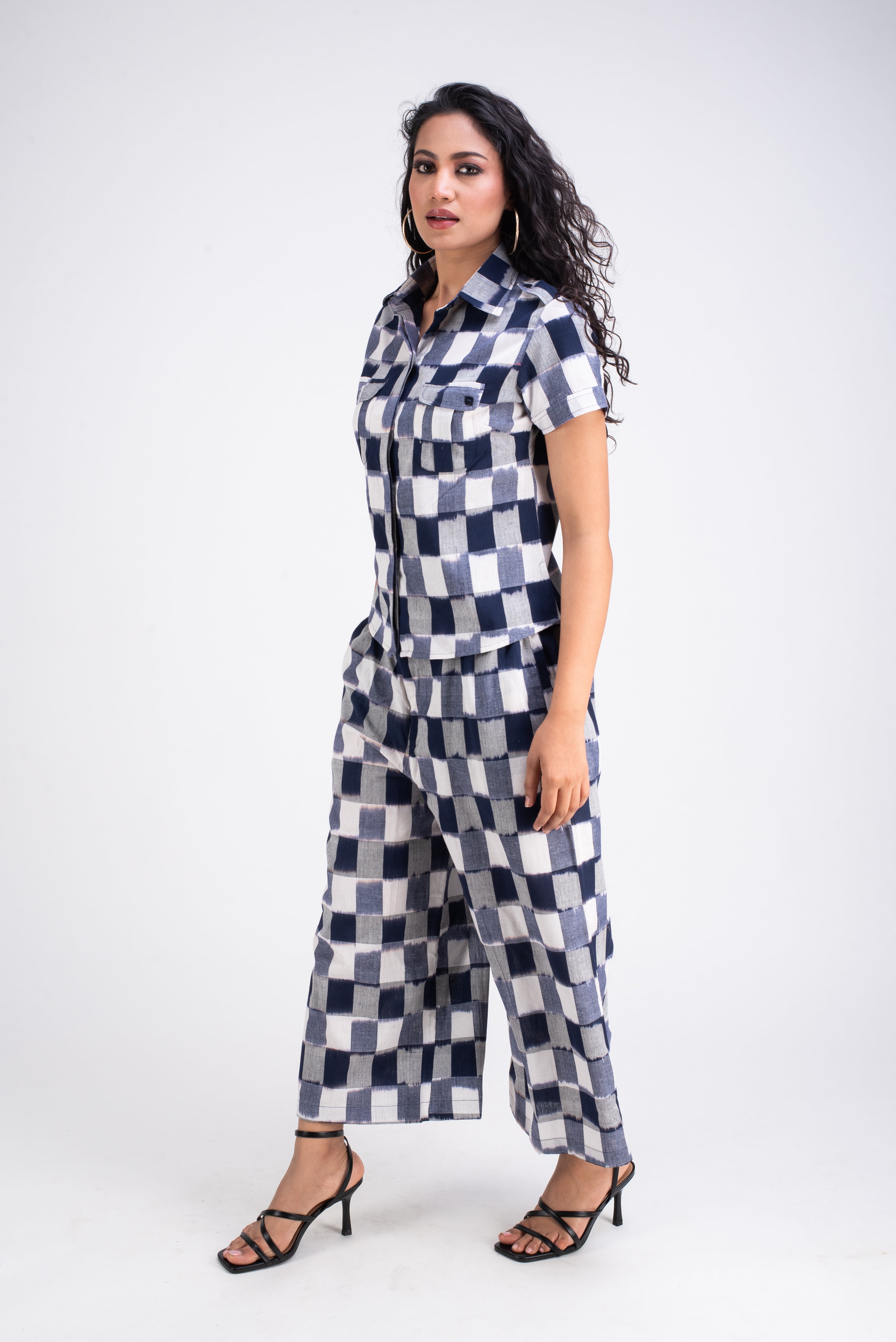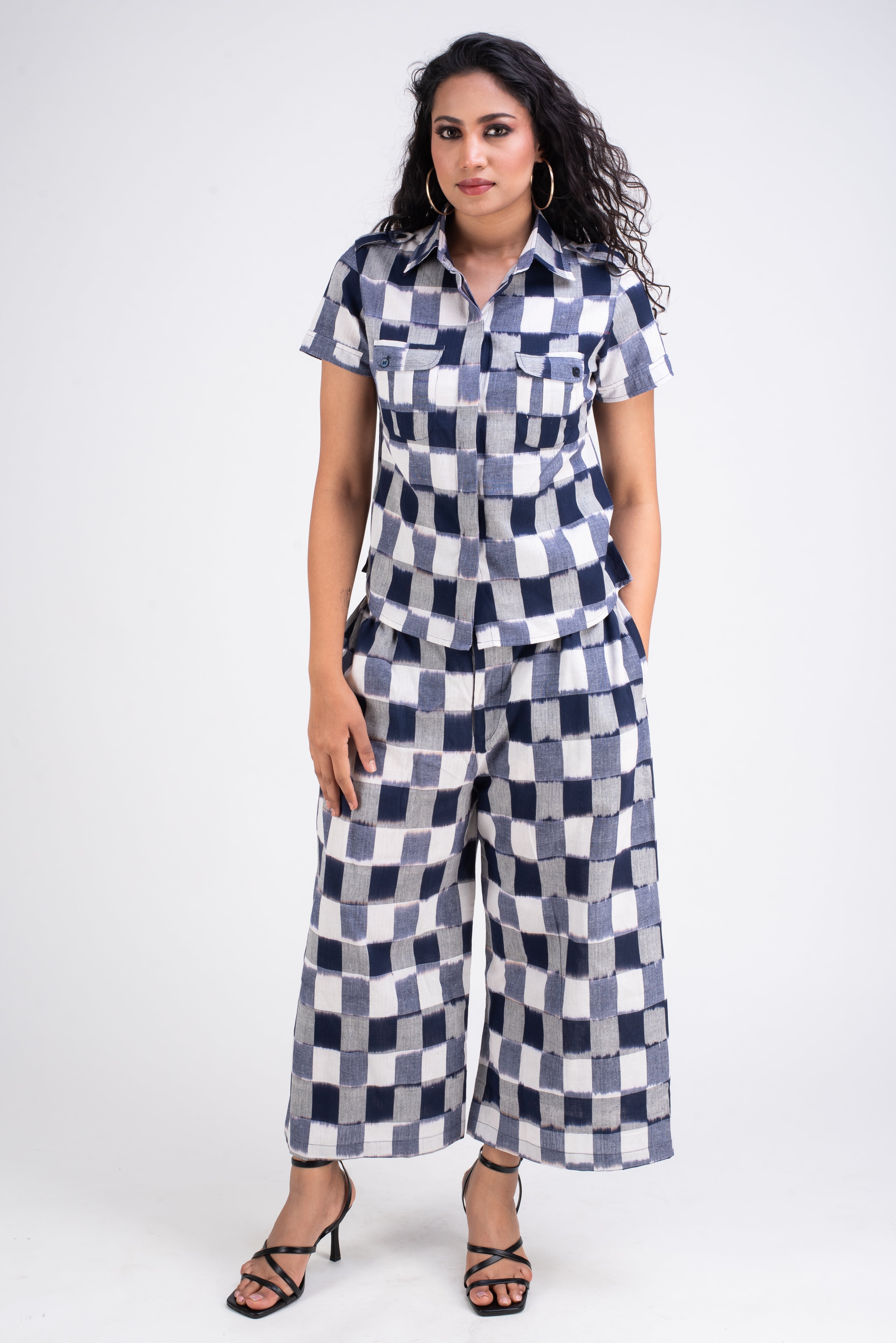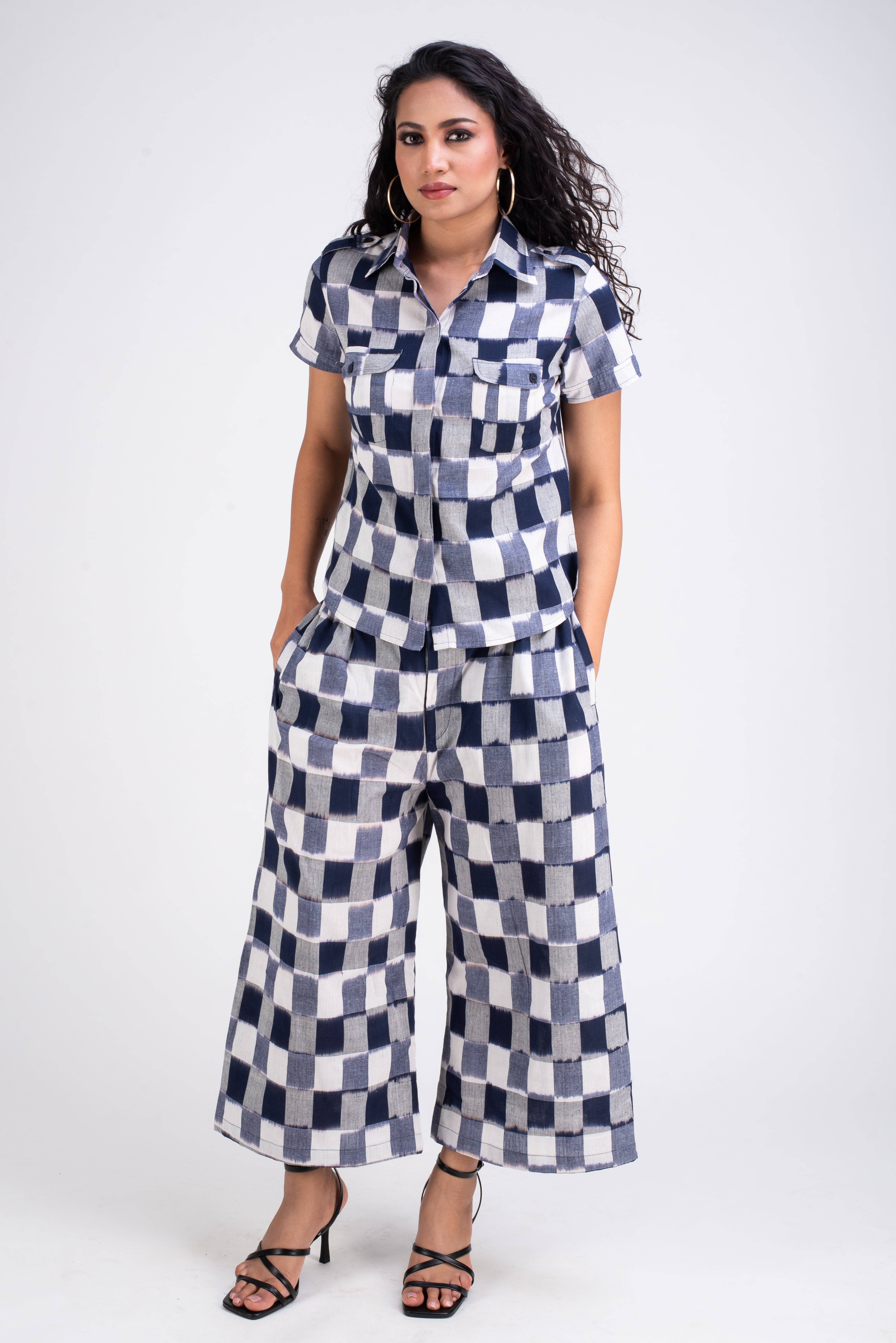 Navy and white checks caprice pants is made in breathable hand loomed fabric called Ikat. The threads are hand dyed before being woven into elegant patterns. Ikat a signature art of making fabric in India.