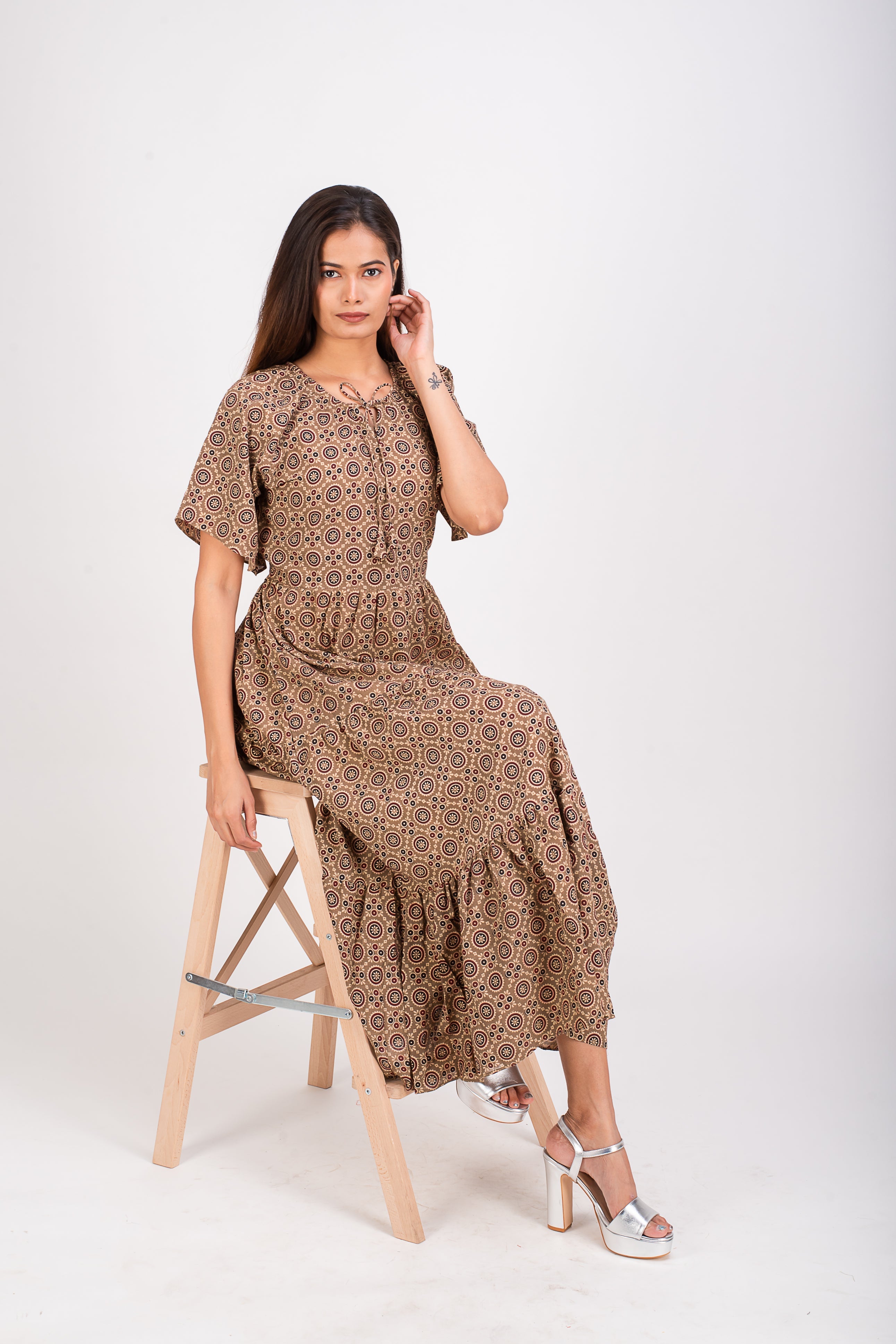 Make a style statement in this darling ruffled neck tiered long maxi. Elegant and fun maxi dress is perfect for a spring afternoon or warm summer evenings. Wear it as a day dress or for dinner with special someone.