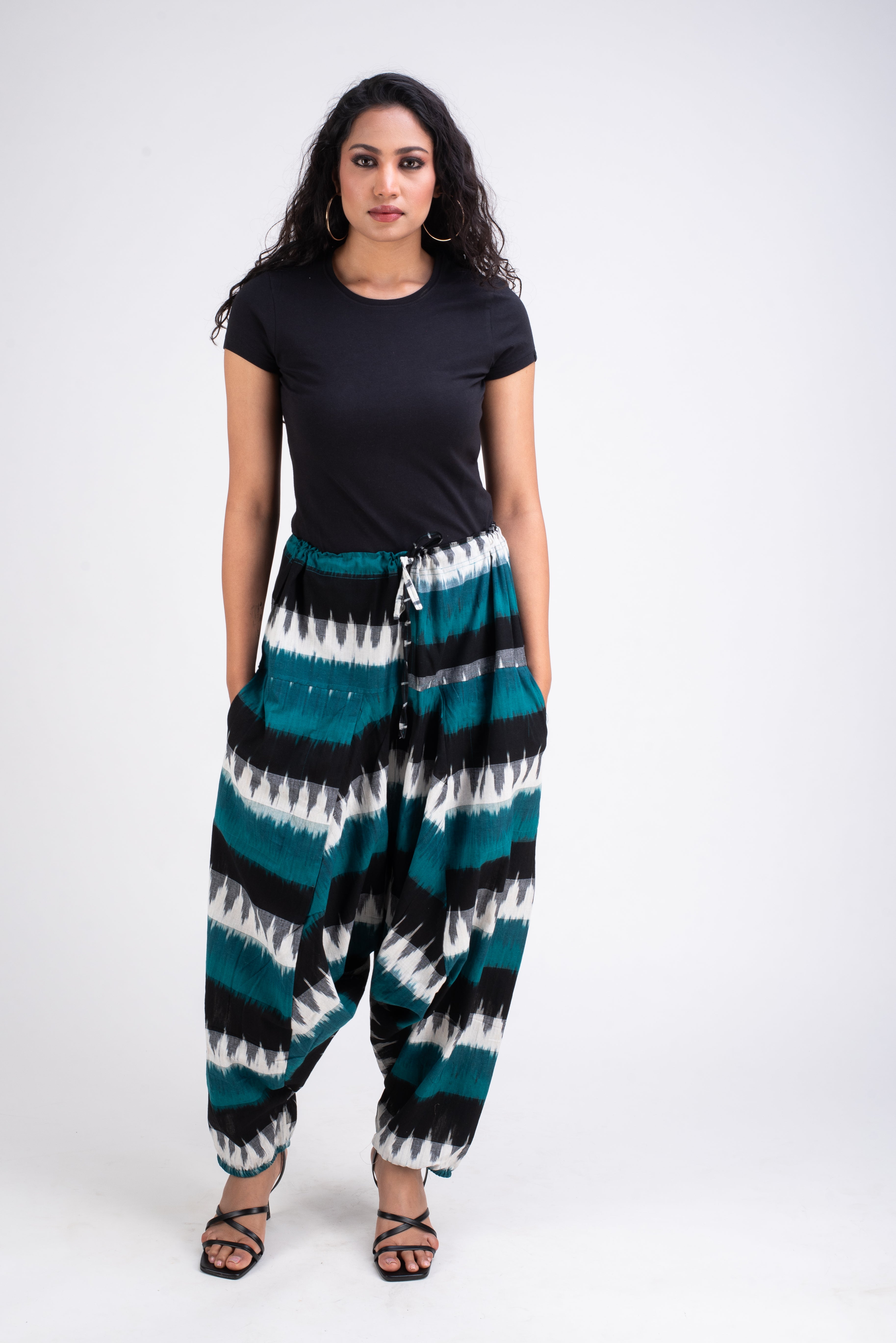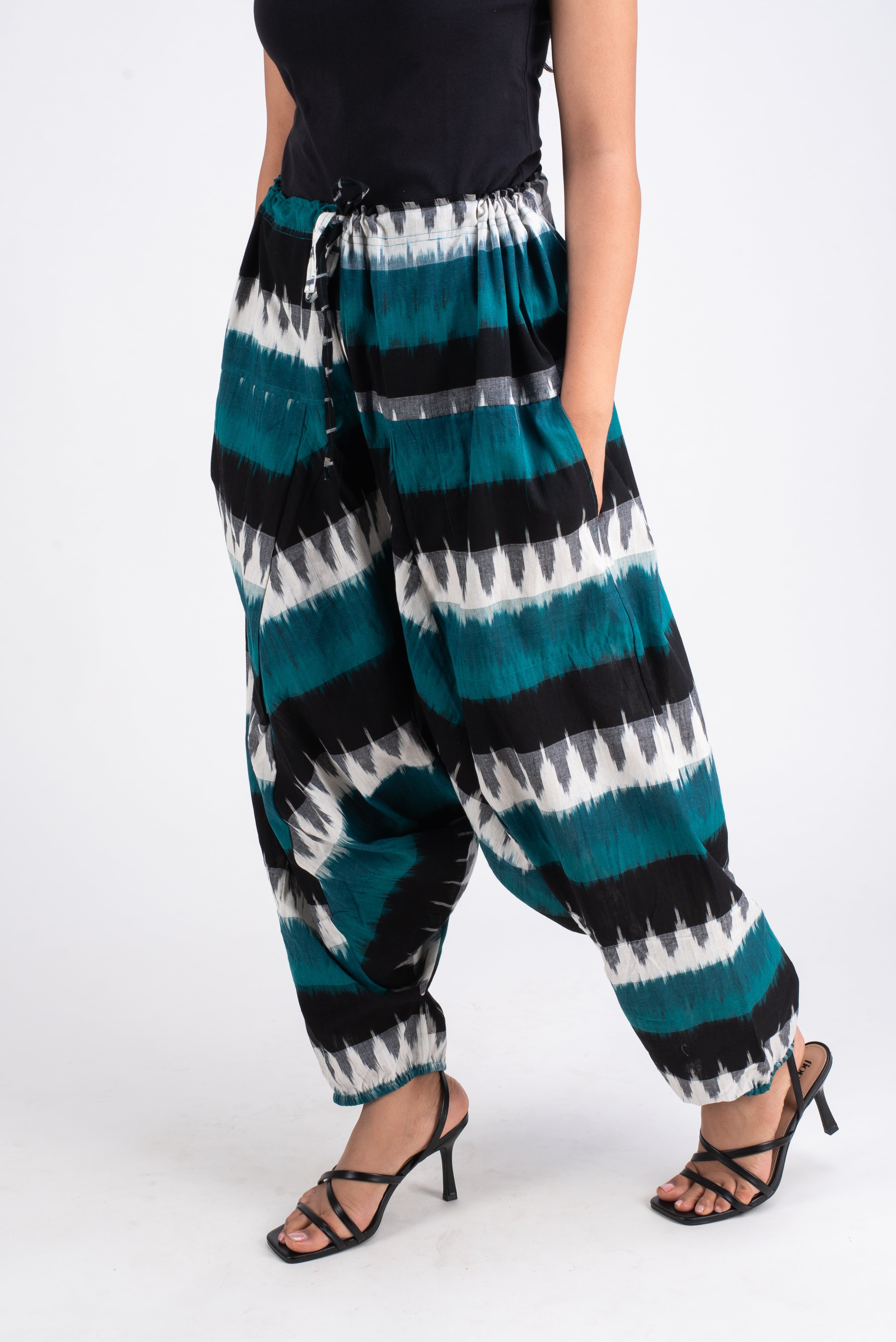 Hunter green, black and white colored elephant pant is made in breathable hand loomed fabric called Ikat. The threads are hand dyed before being woven into elegant patterns. Ikat a signature art of making fabric in India.