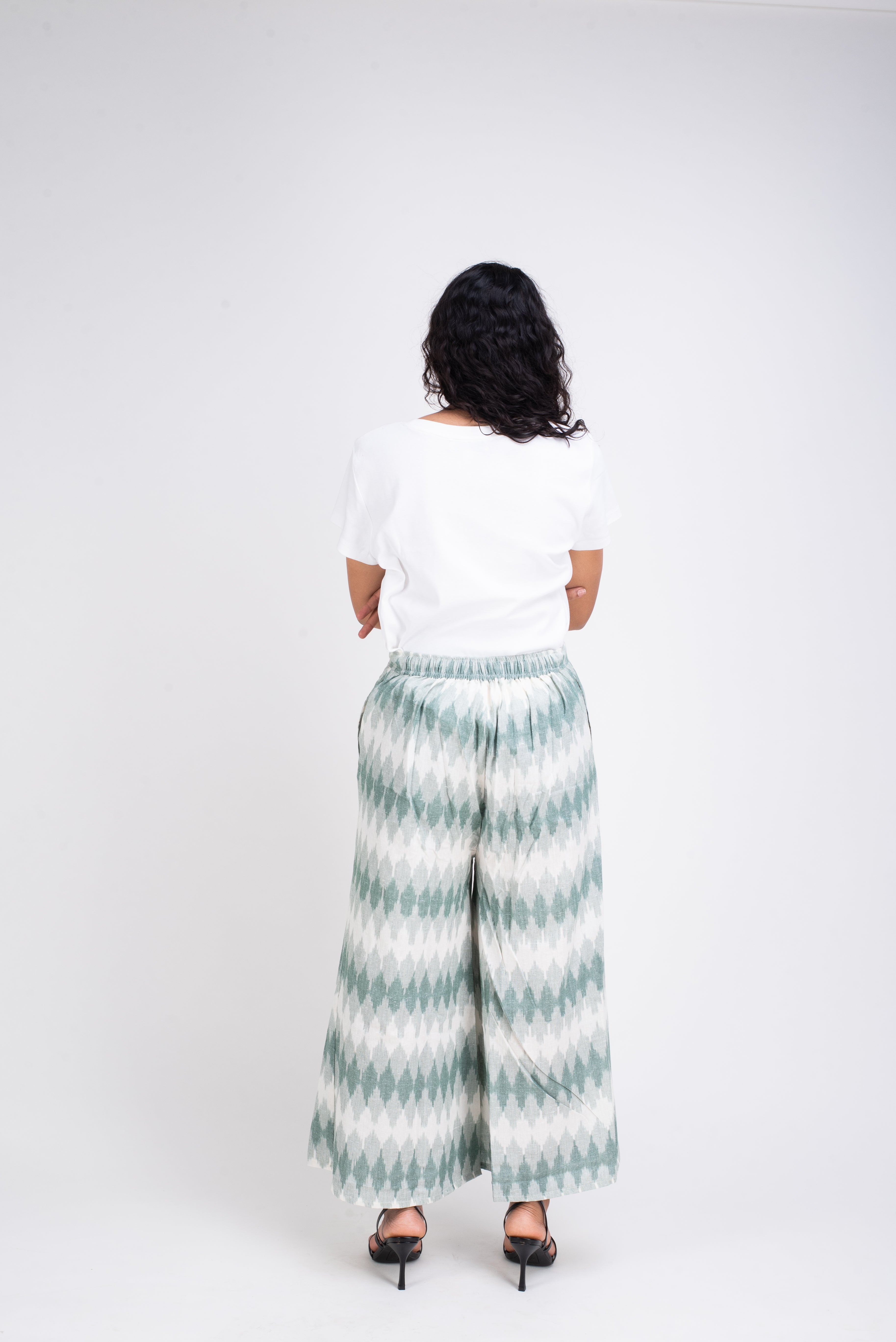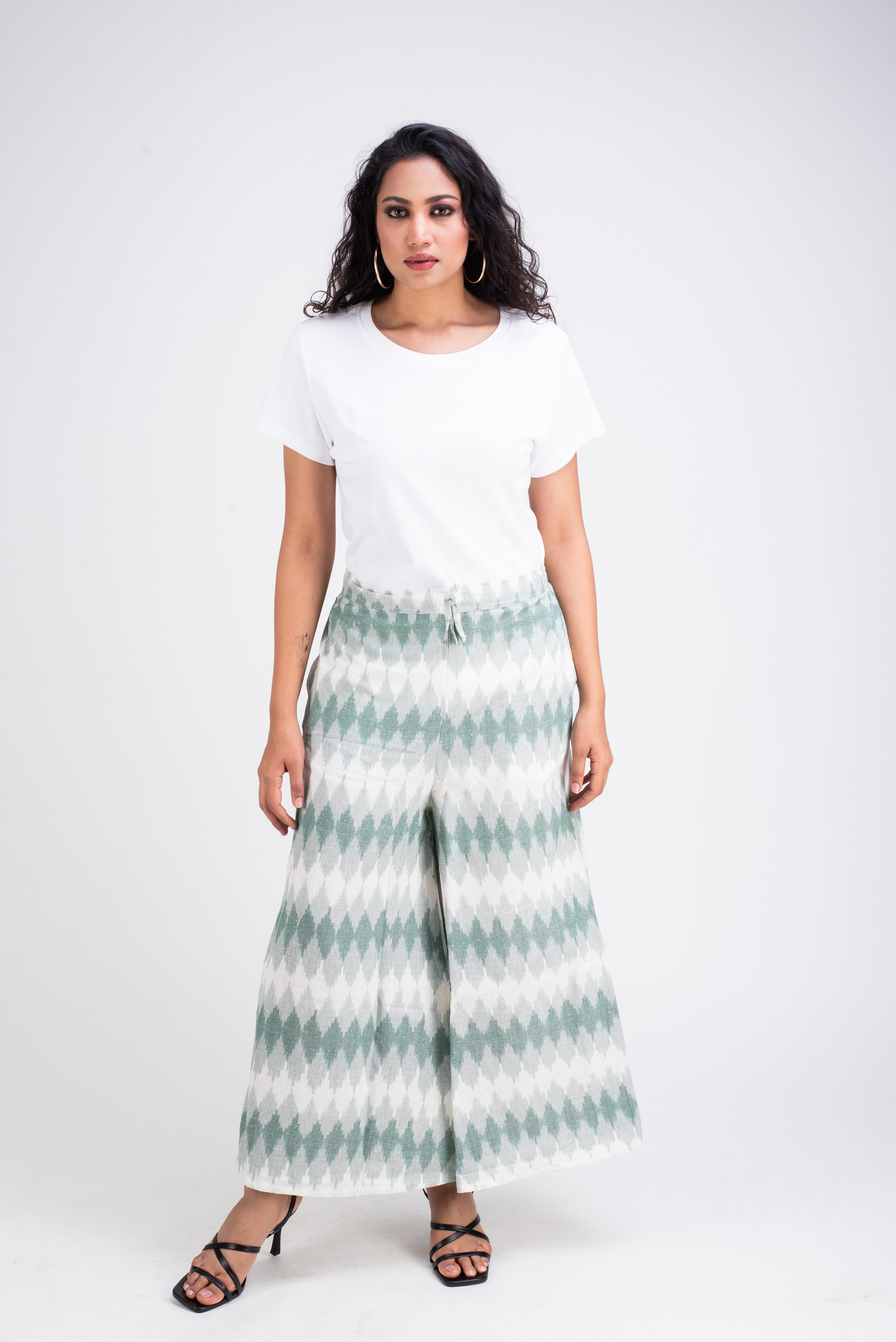 greenish white colored elephant pant is made in breathable hand loomed fabric called Ikat. The threads are hand dyed before being woven into elegant patterns. Ikat a signature art of making fabric in India.